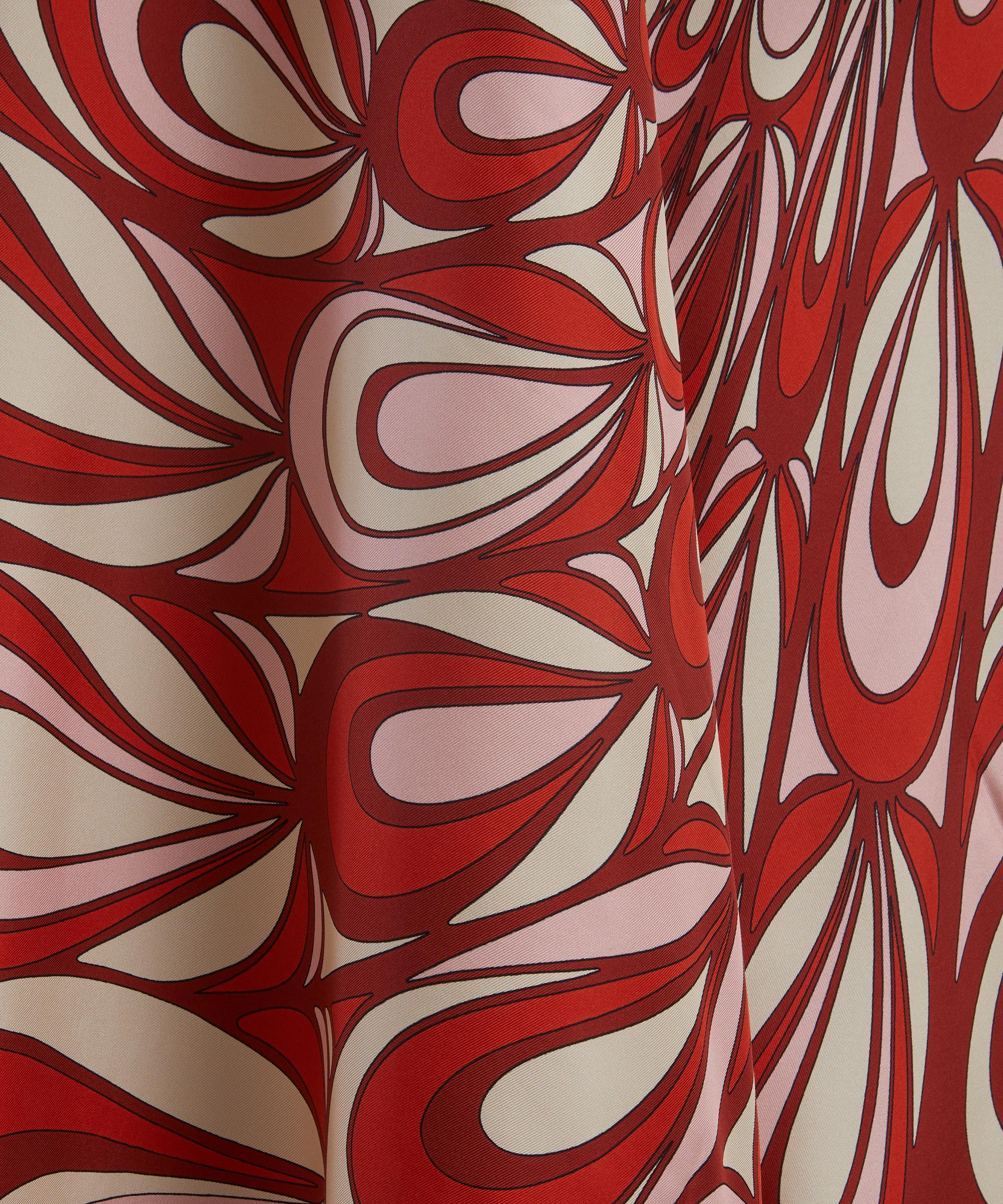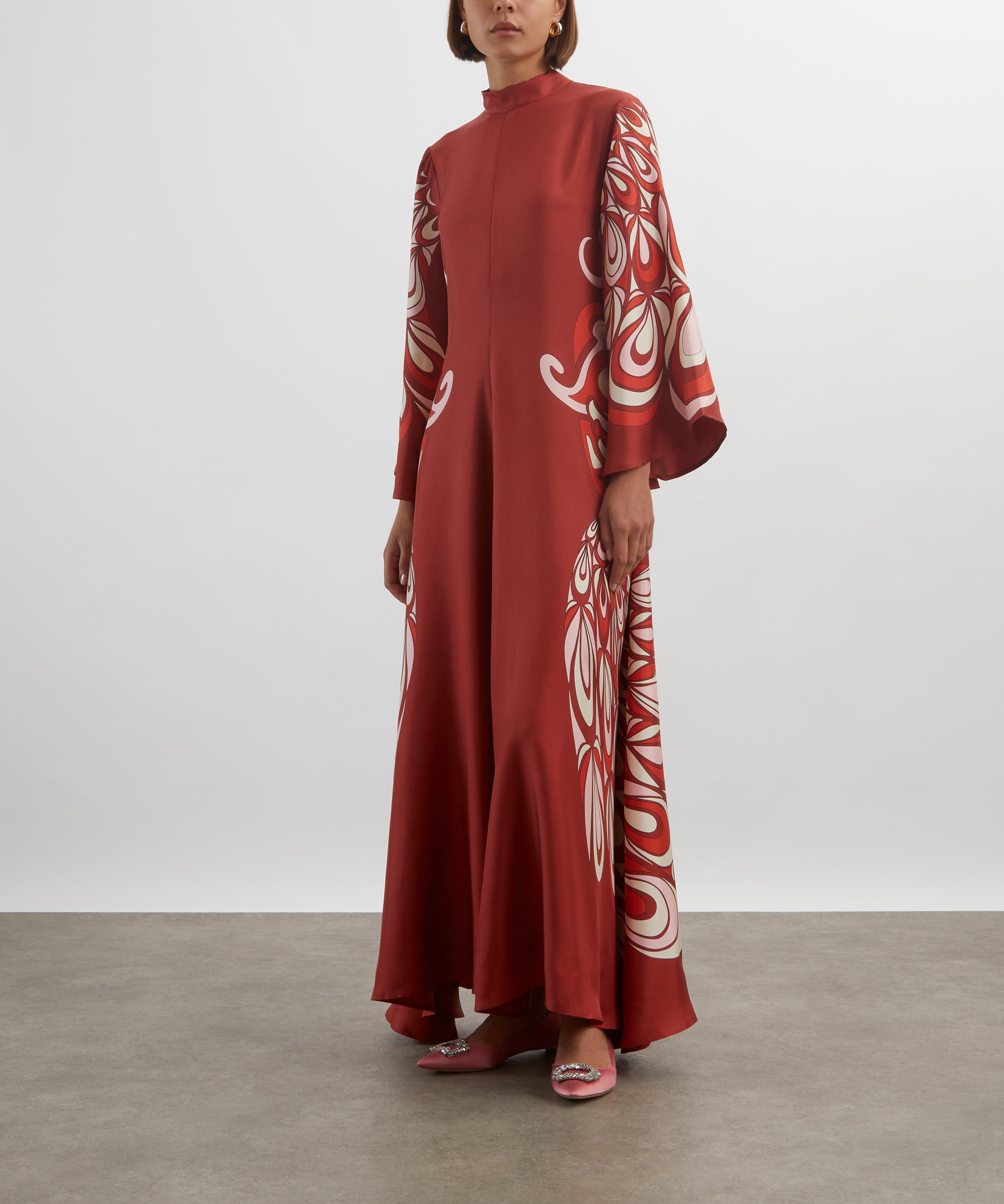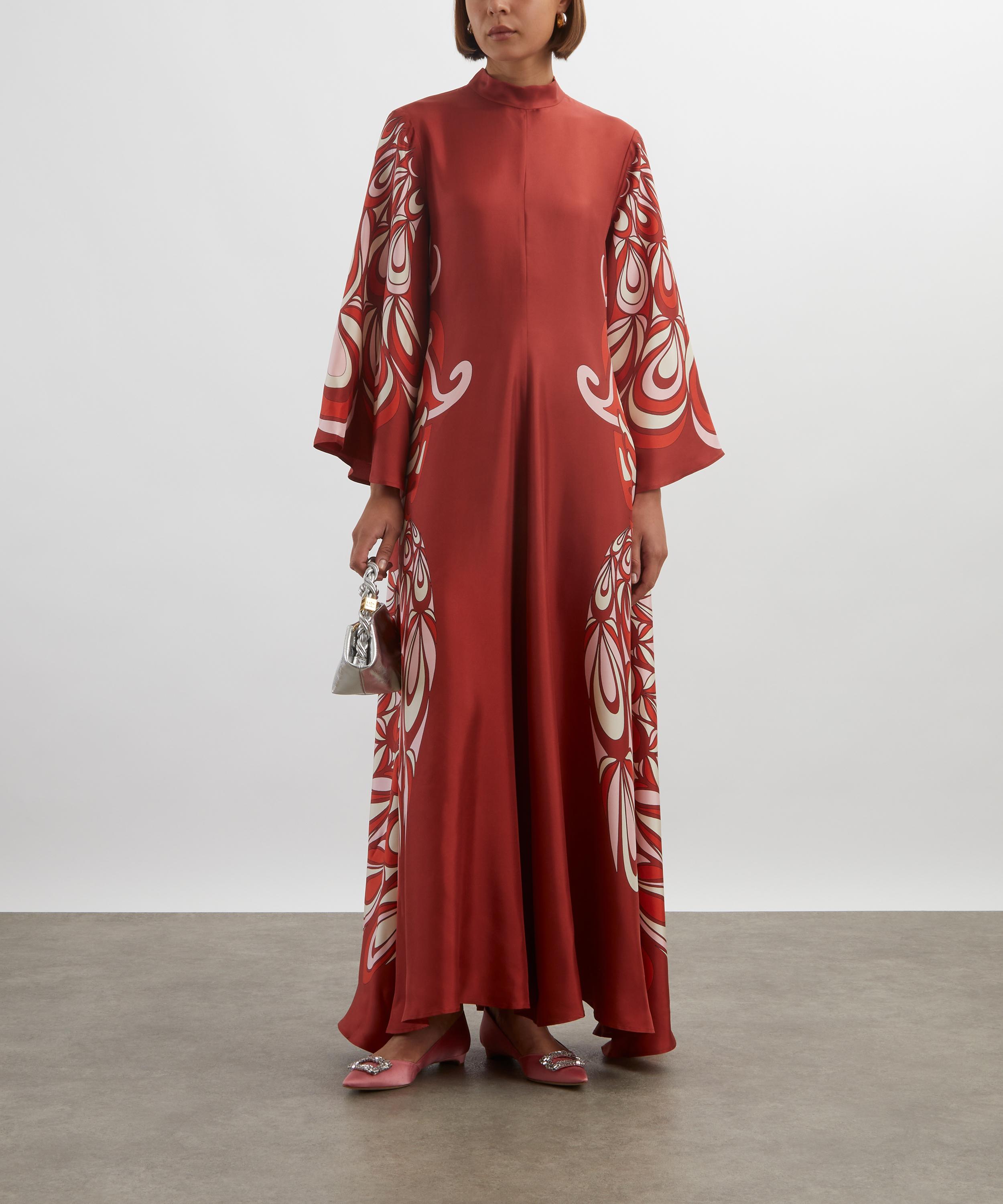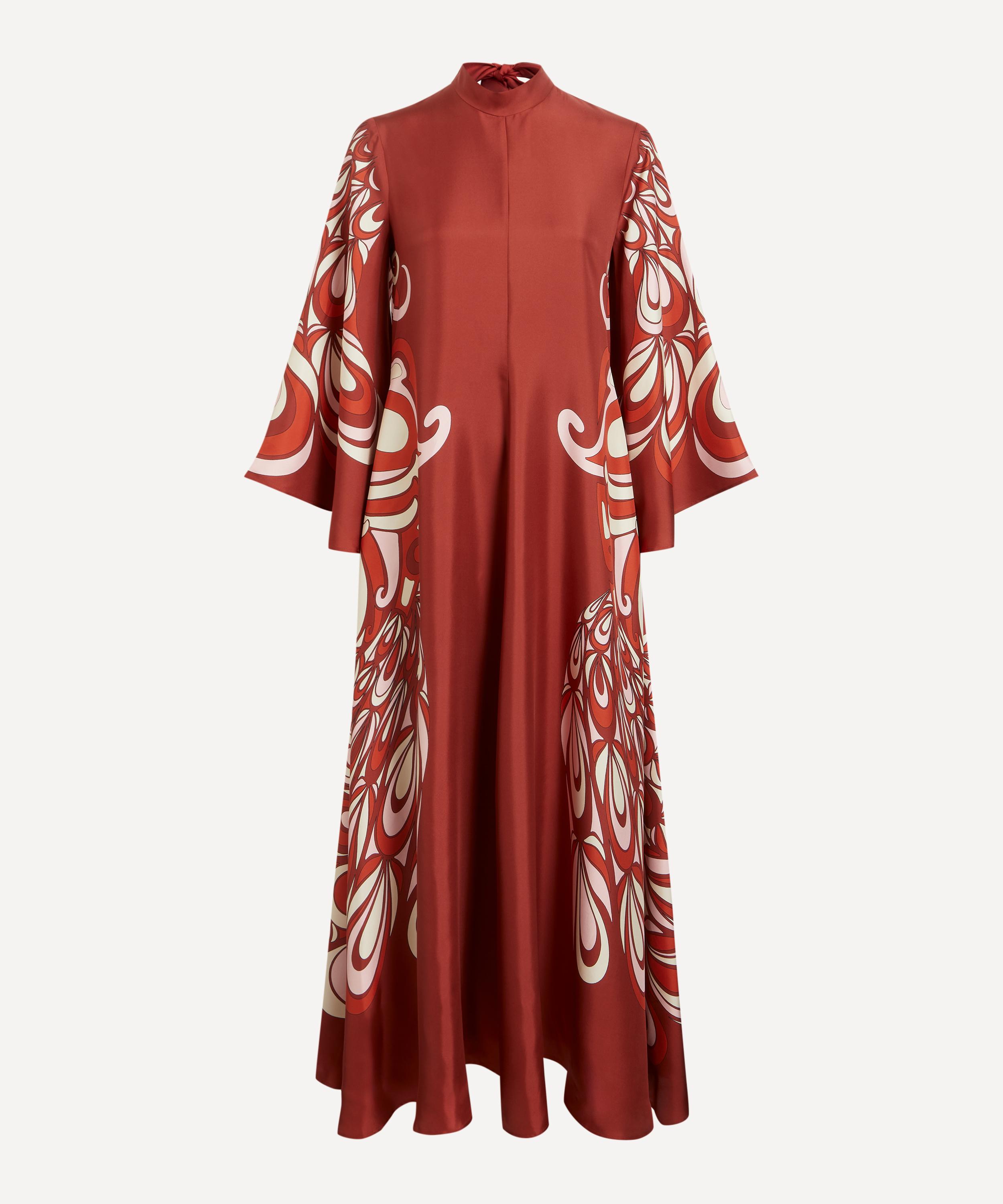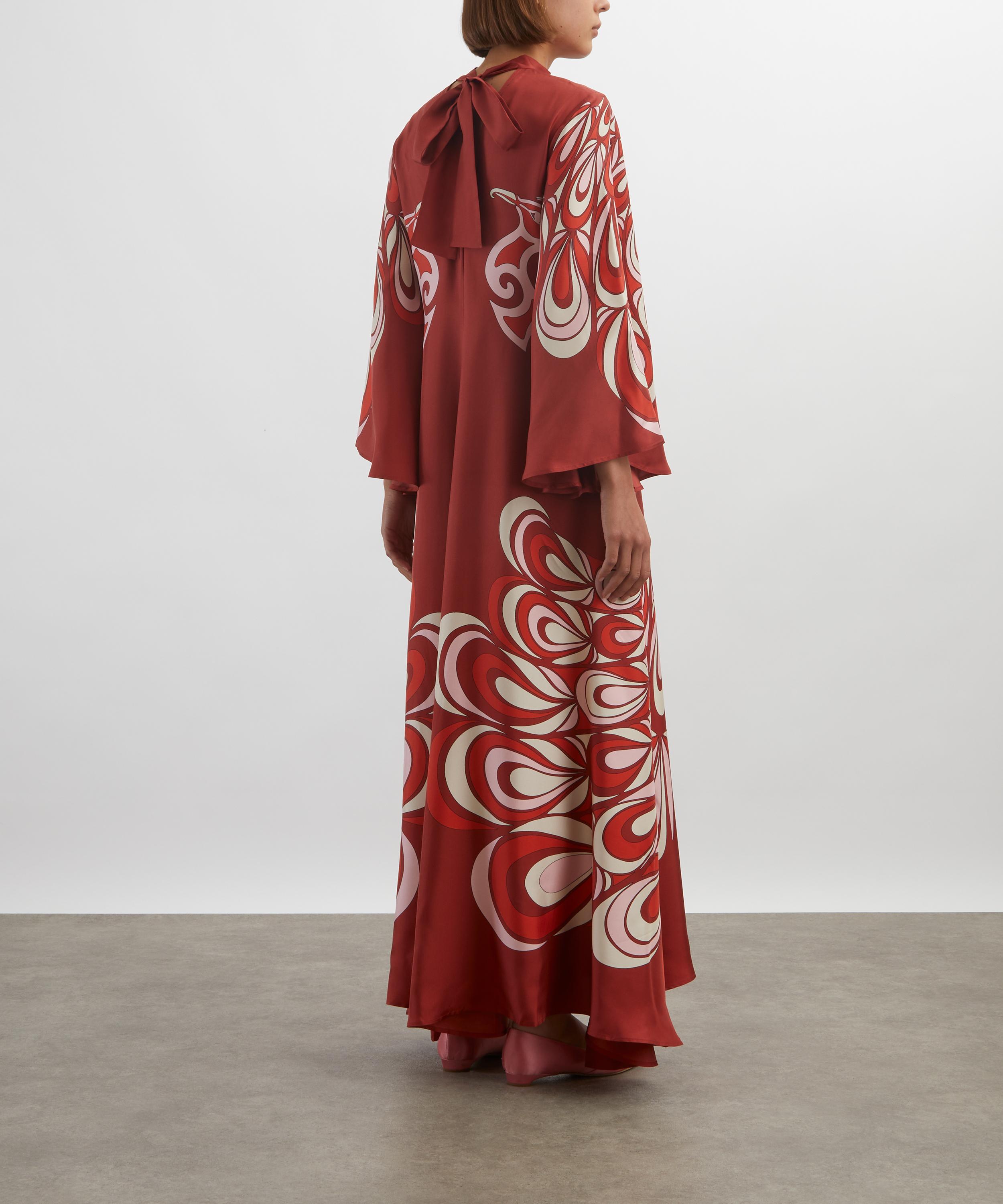 Cut from fluid silk twill emblazoned with the bold Phoenix motif, the Magnifico dress perfectly balances ease and elegance. A true statement piece with a flowing silhouette and draped waterfall sleeves, it features a stand-up collar secured with long sash ties.