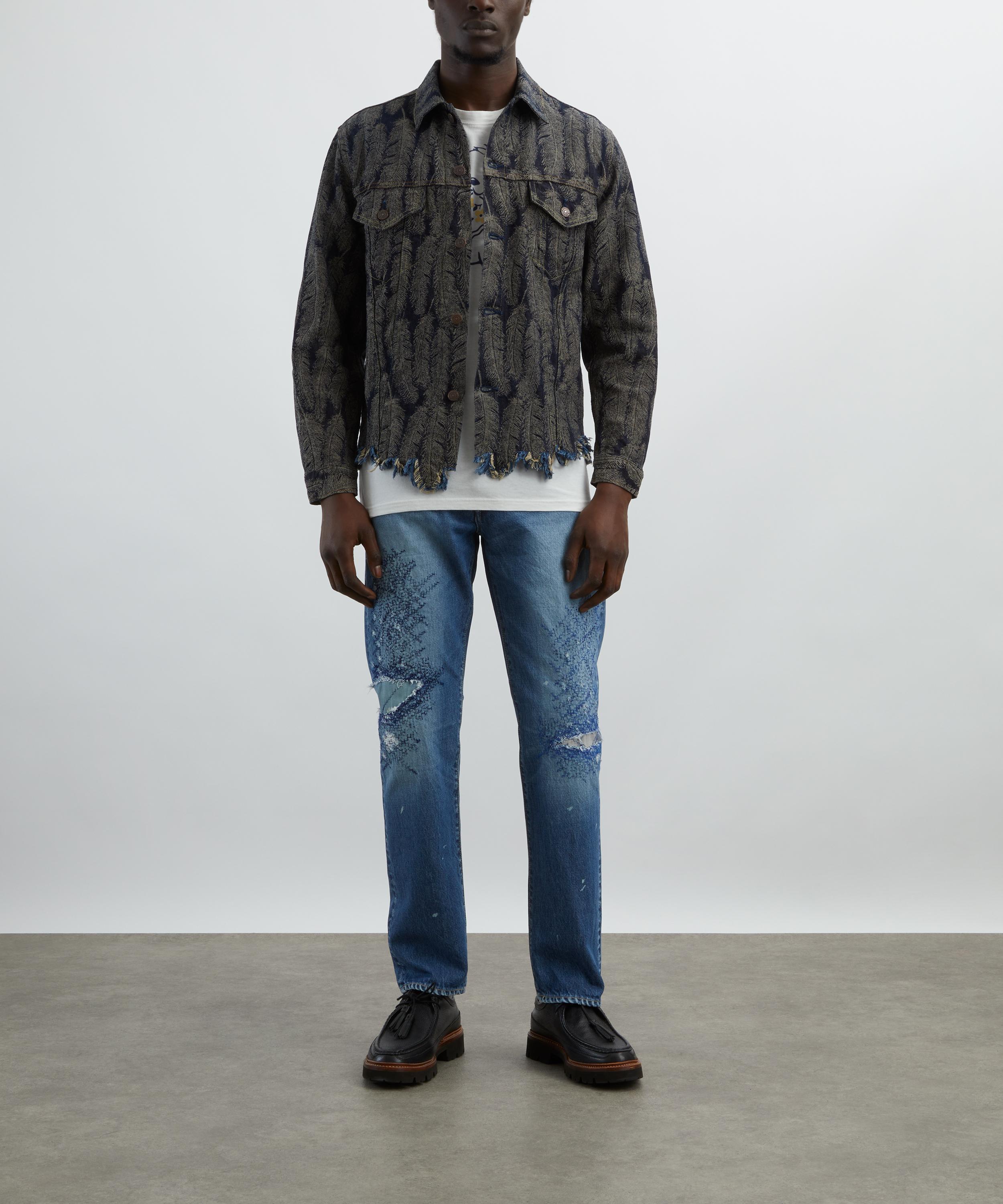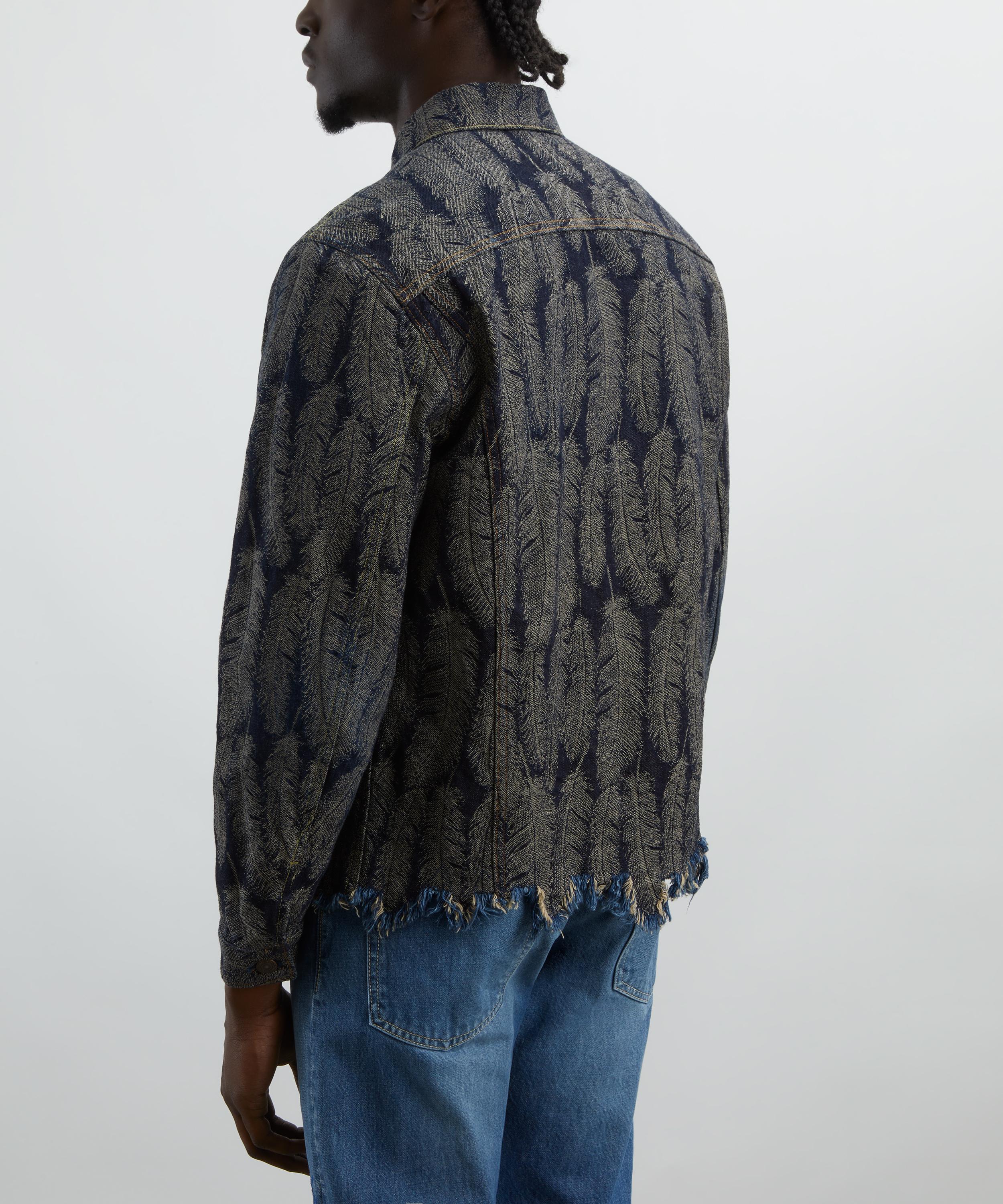 Crafted in Japan from 12oz. denim, this abstract reinterpretation of the classic denim jacket features a jacquard-woven magpie feather motif for a bold, textured look. Finished with a button front, two flap pockets, and distressed detailing at the hem, it offers a distinctly worn-in edge with an artistic twist.