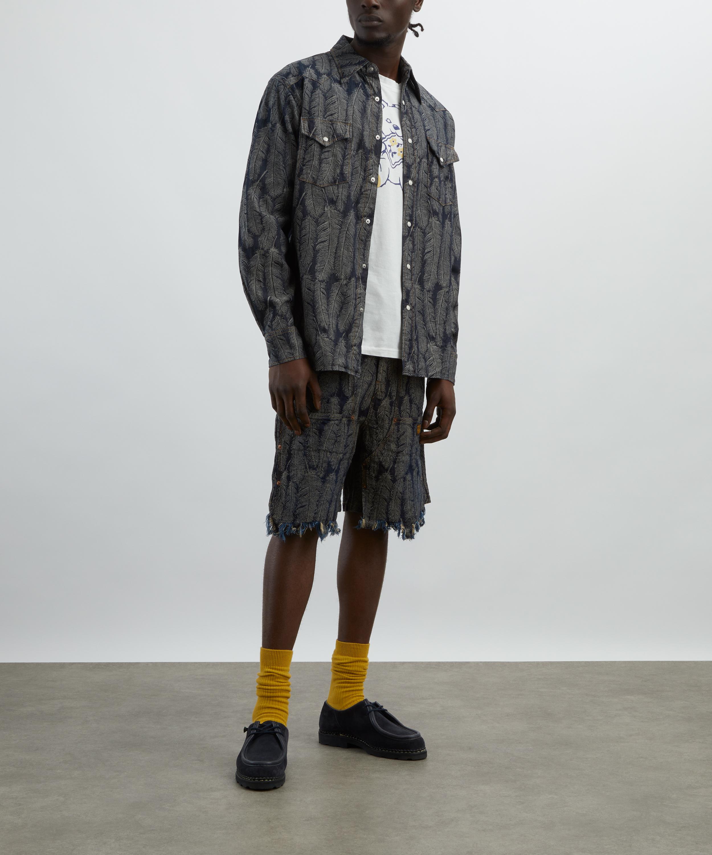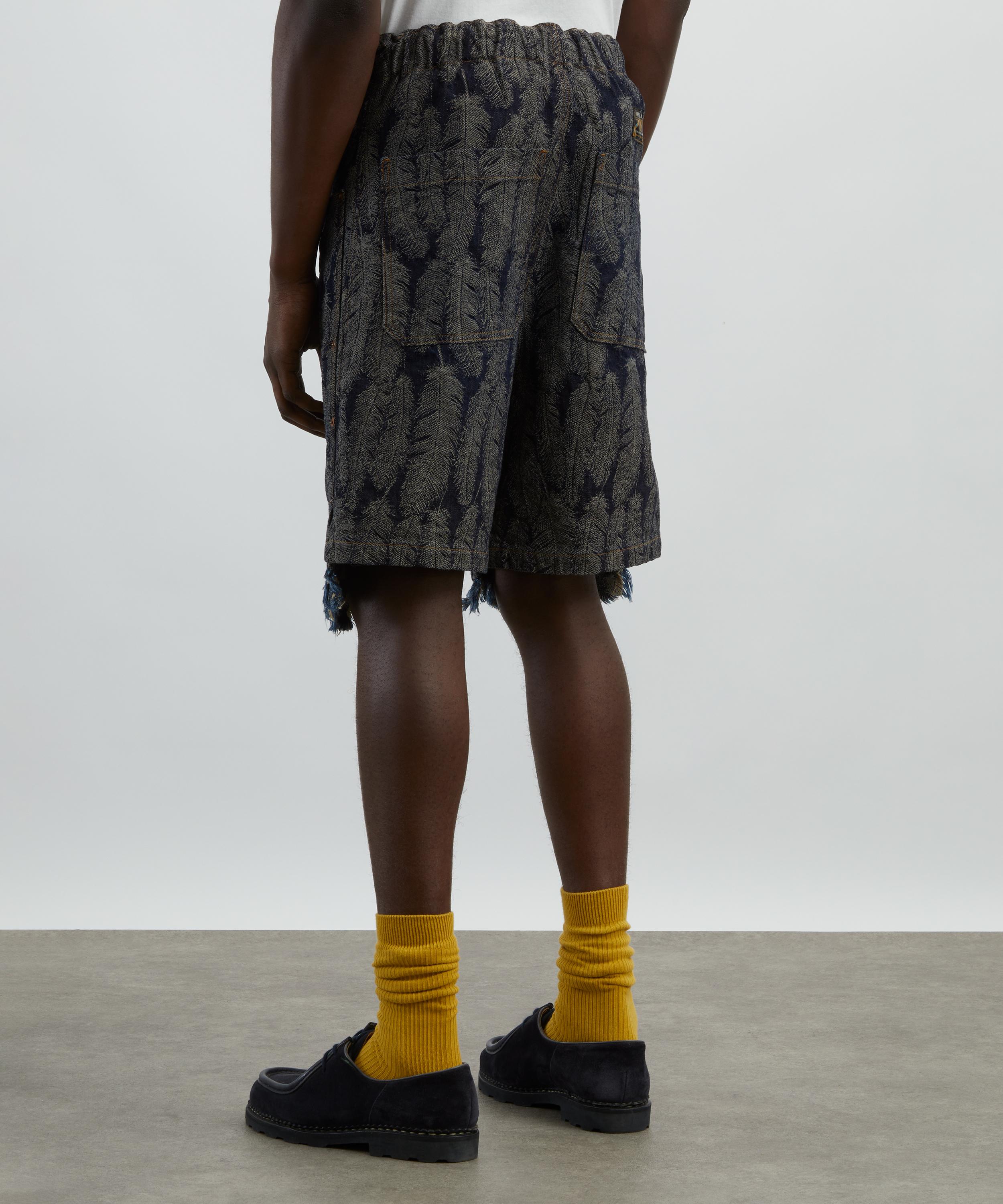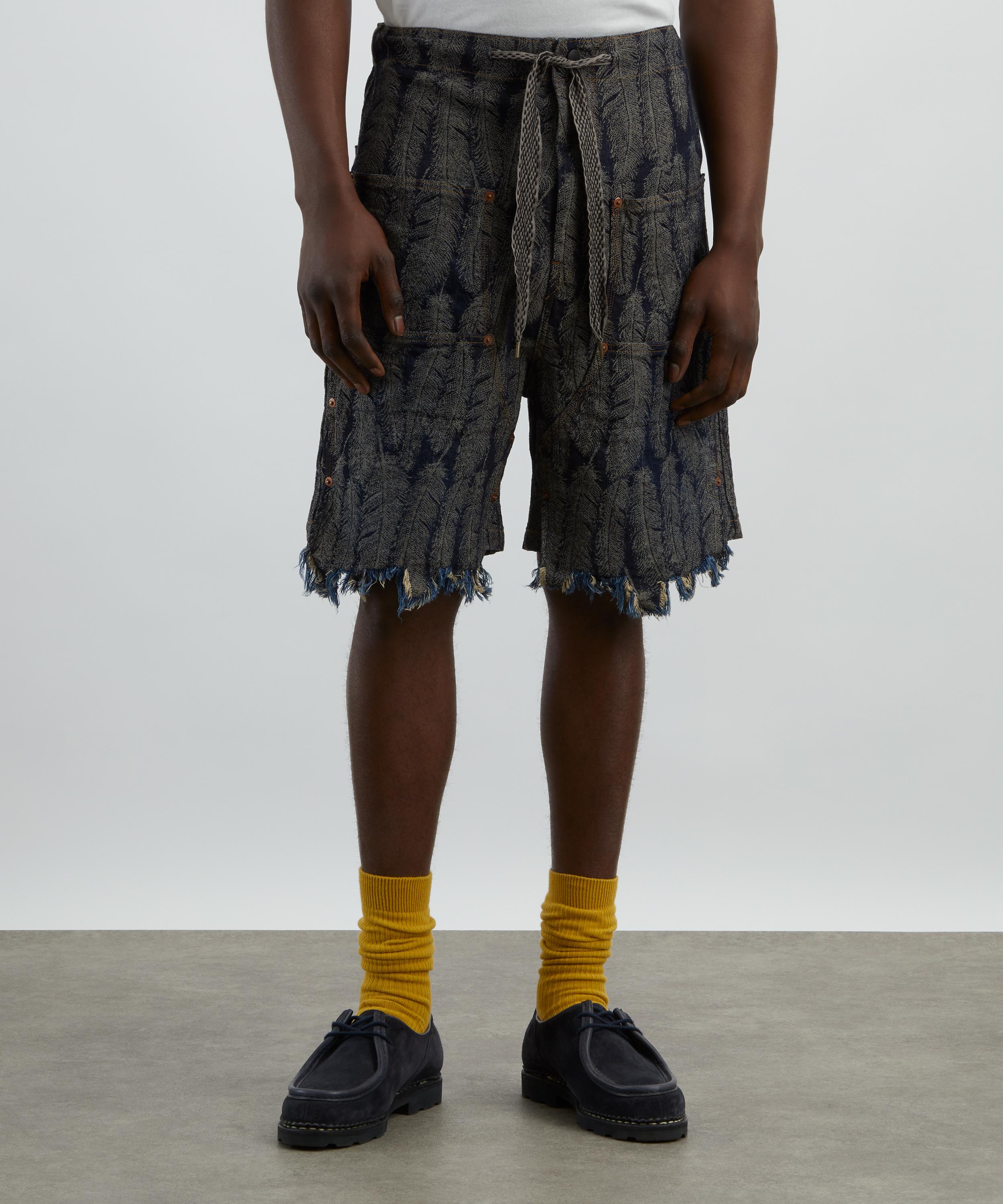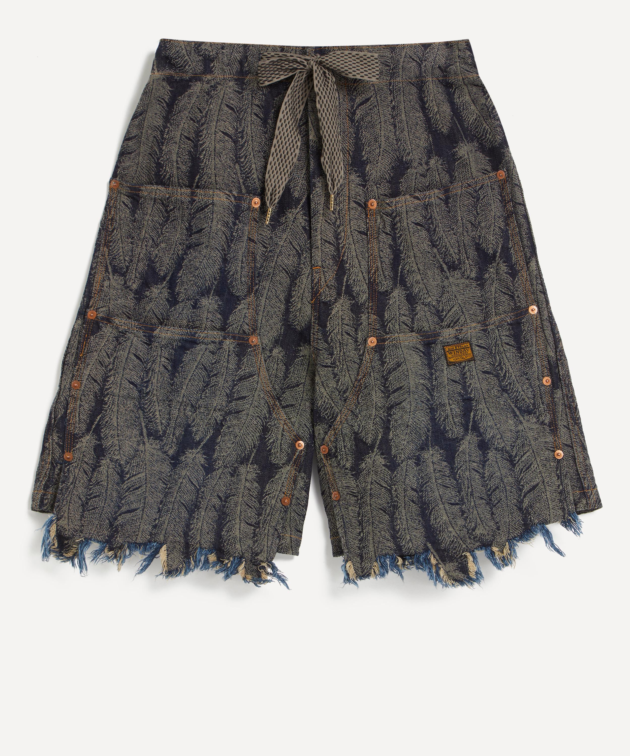 Made in Japan from 12oz cotton denim, these shorts feature a jacquard magpie feather print that adds a unique, three-dimensional texture. Finished with a feathery frayed hem, double-knee detailing and a drawstring waist, they blend bold visual appeal with a utilitarian edge.
