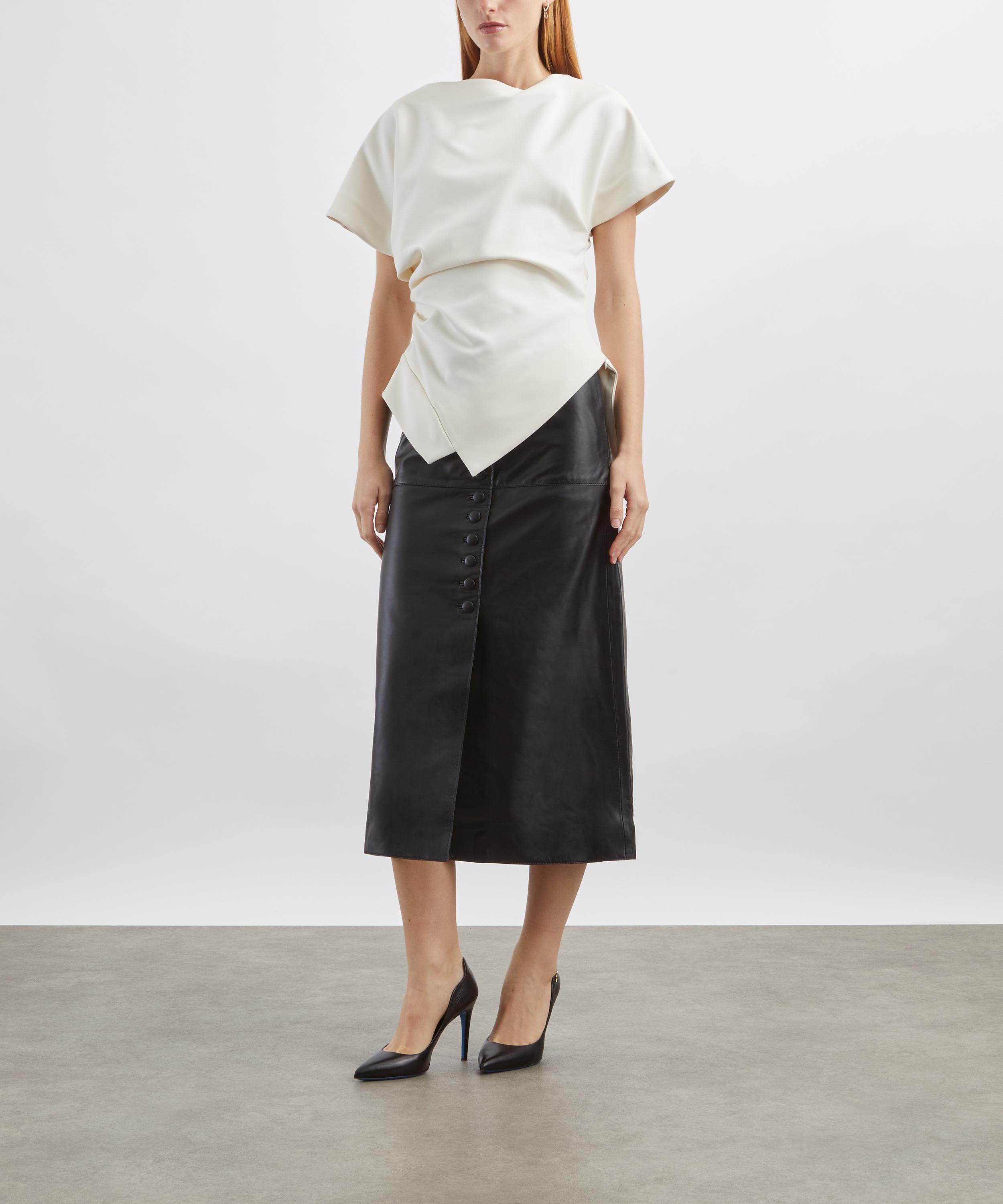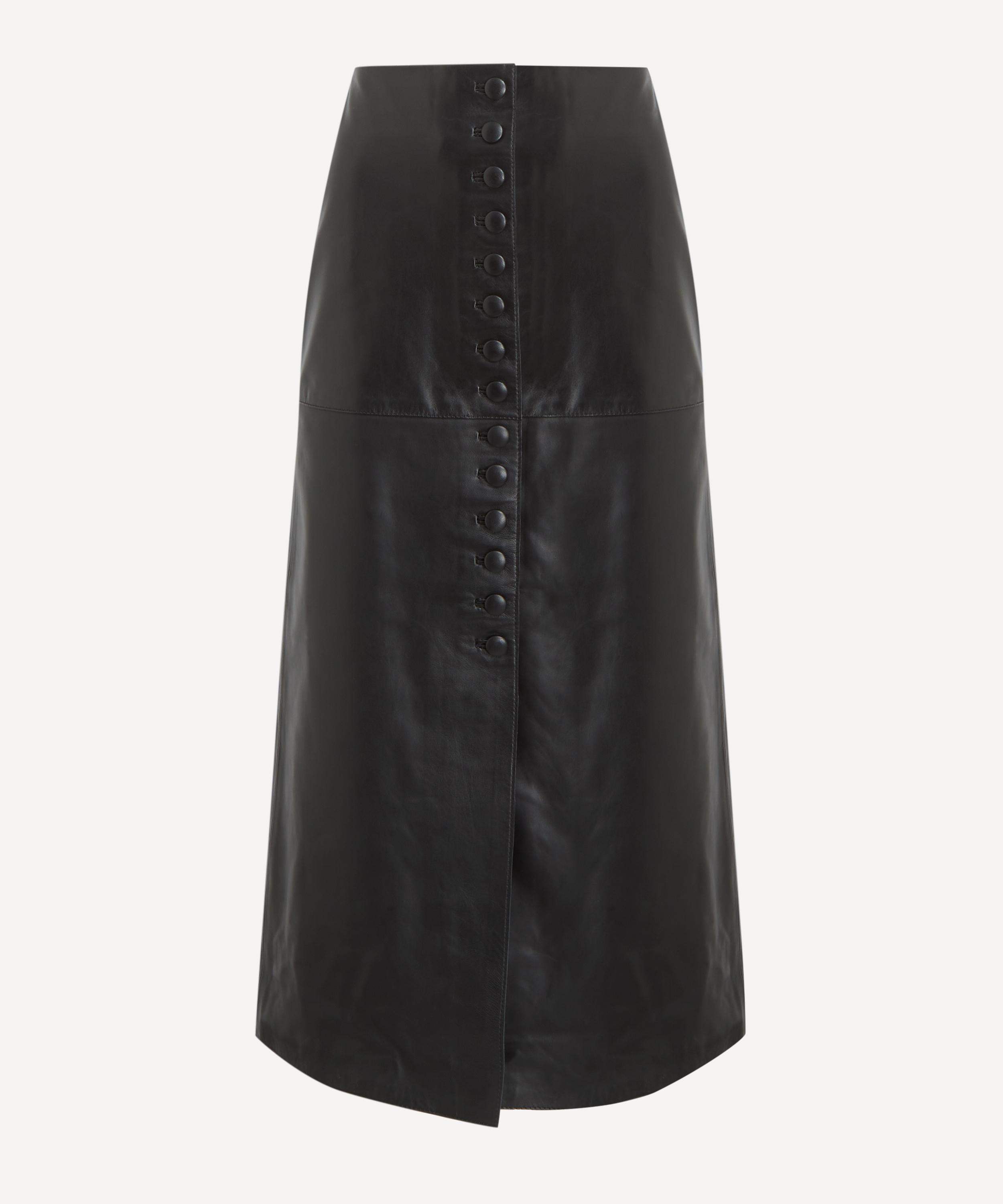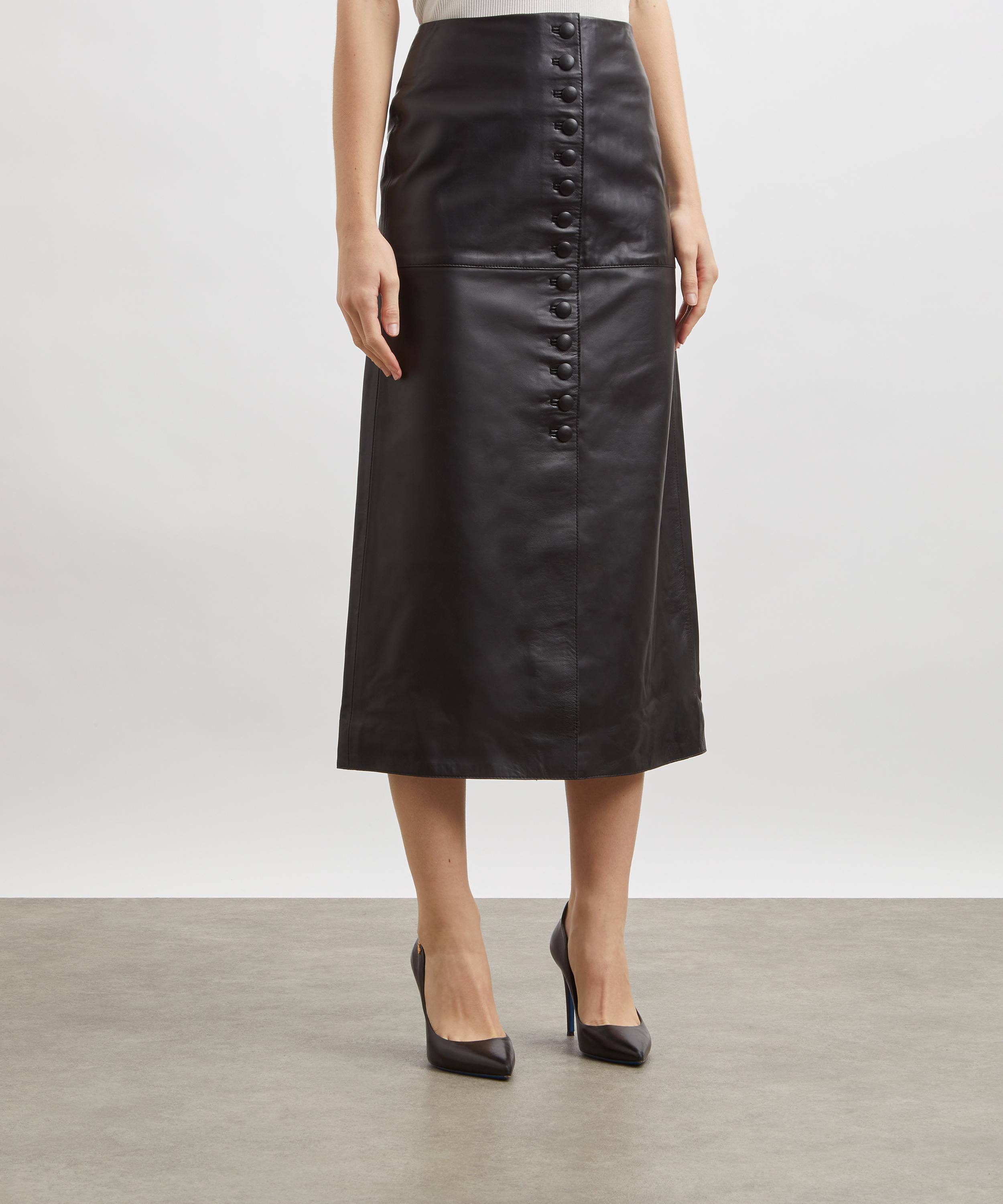 Expertly crafted from buttery leather, this high-waisted midi skirt features back darts to enhance its tailored silhouette and is finished with signature covered buttons along the front for a refined, contemporary touch.