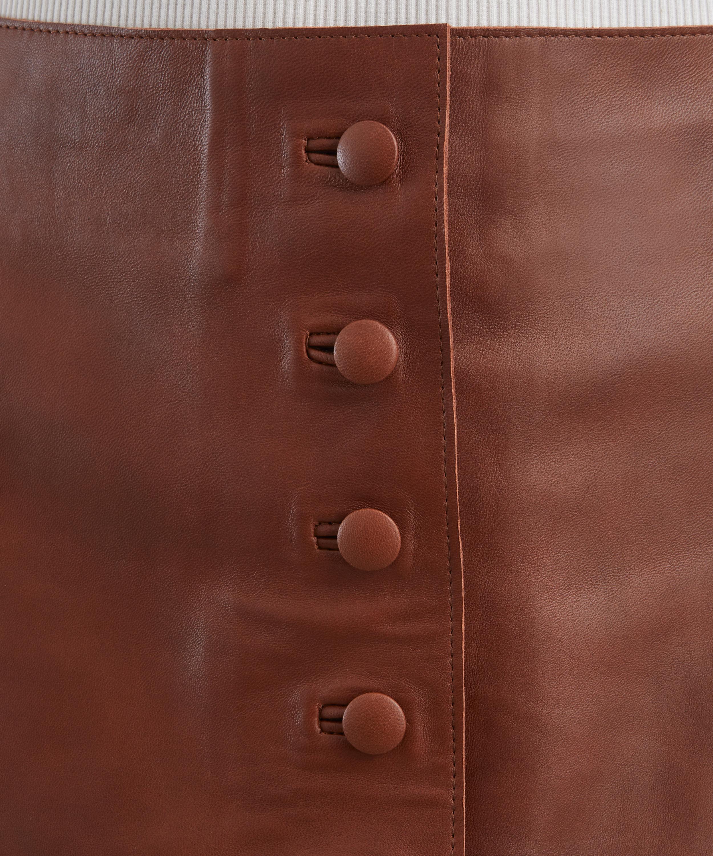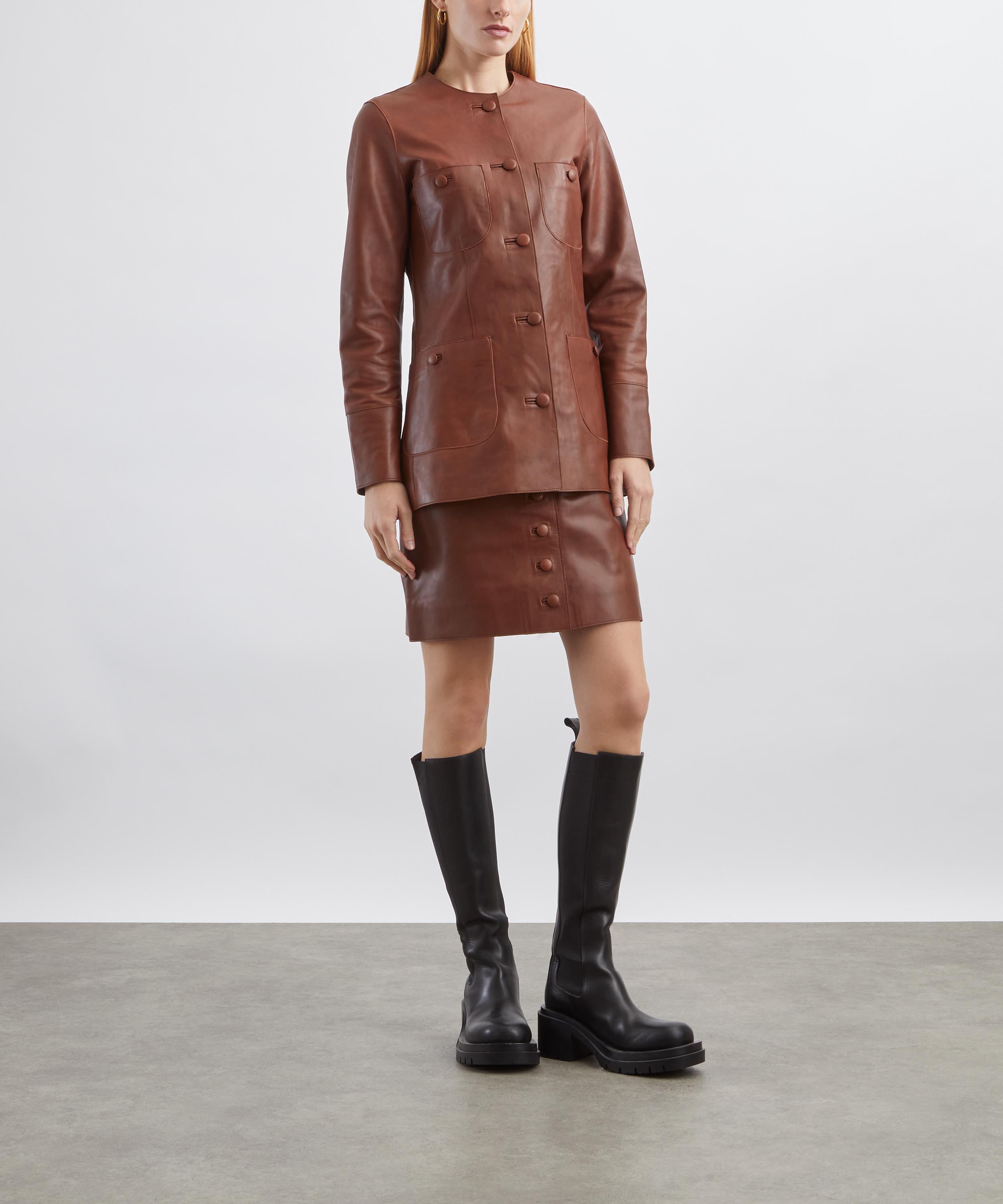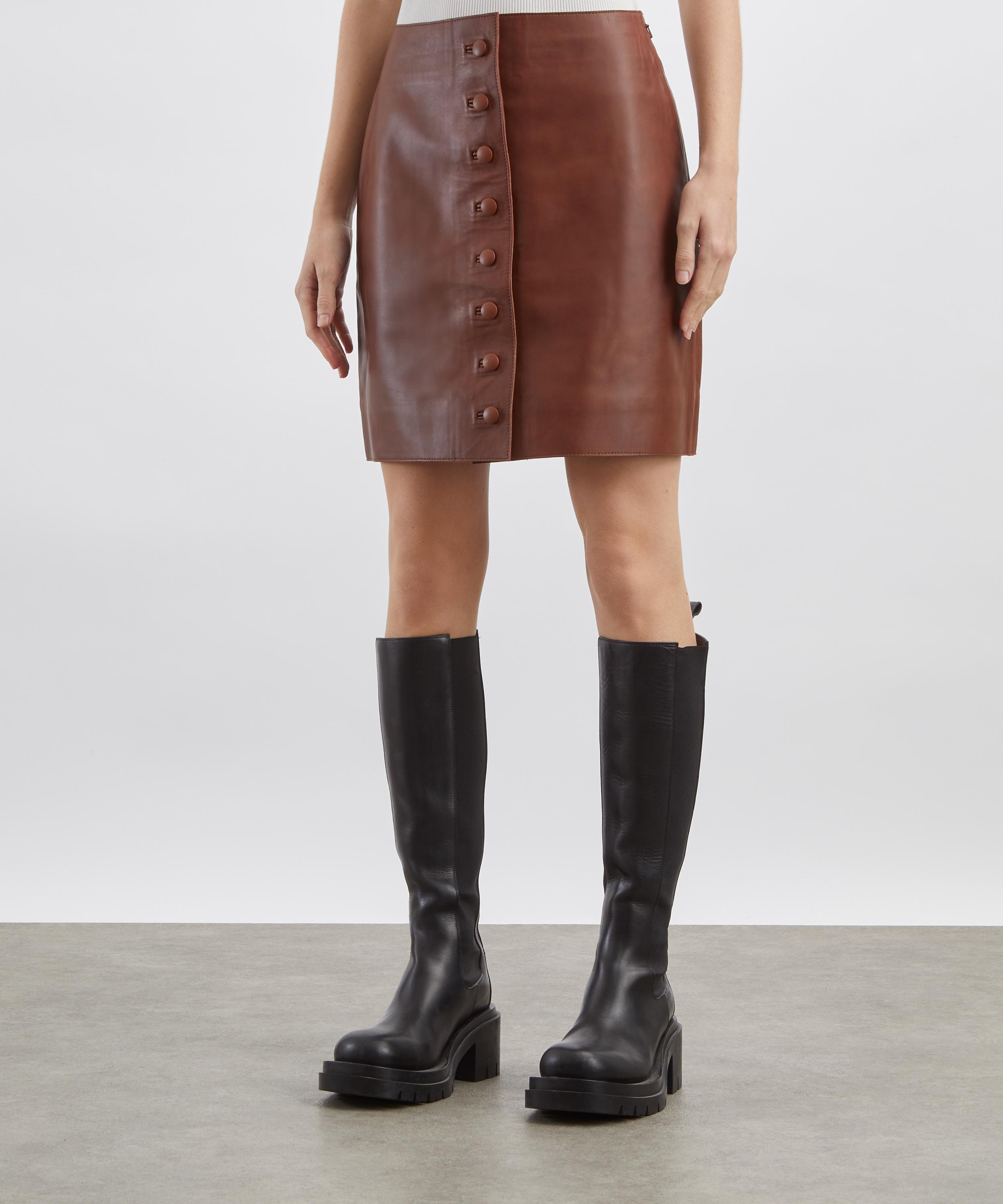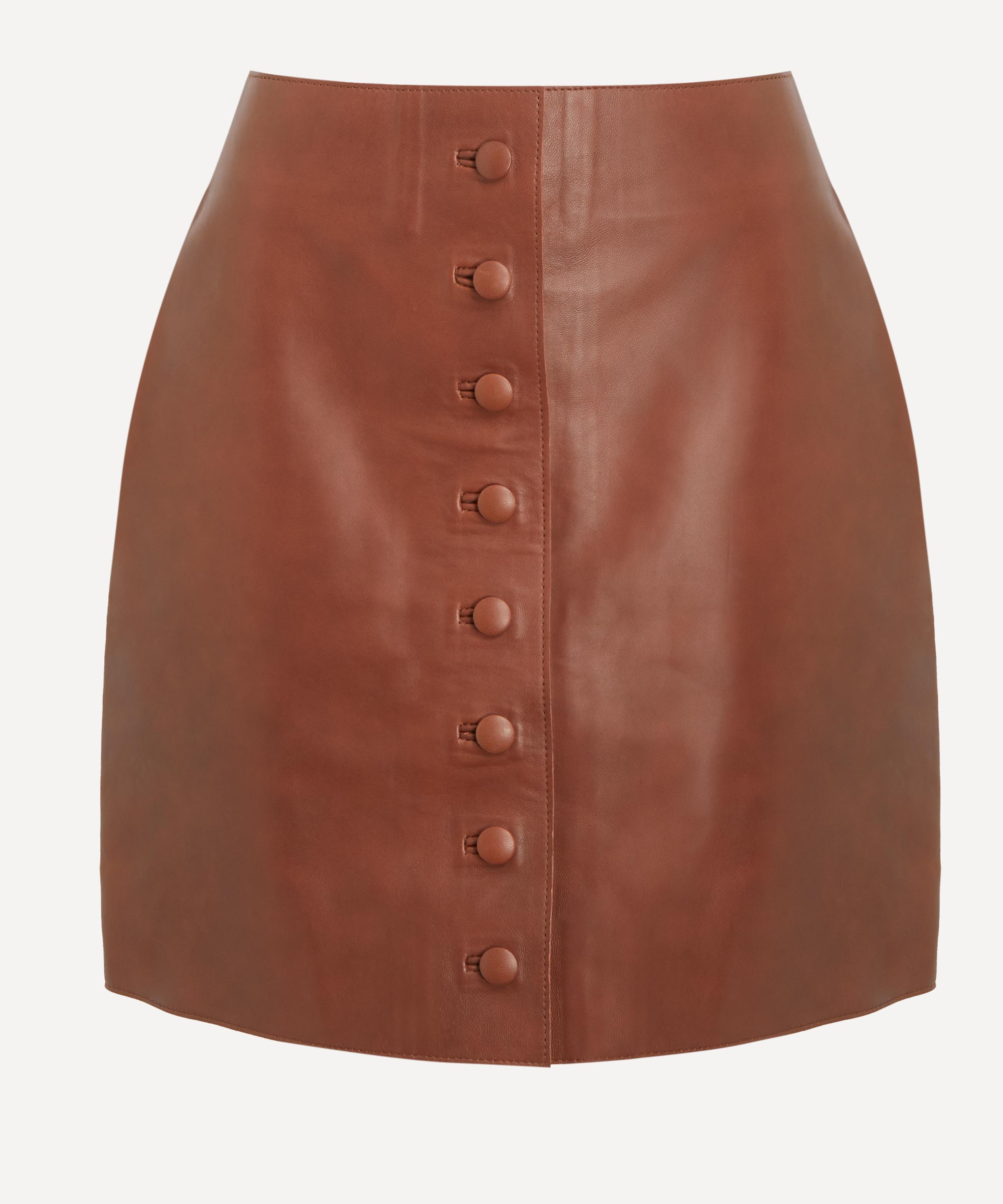 Expertly crafted from buttery leather, this high-waisted mini skirt features back darts to enhance its tailored silhouette and is finished with signature covered buttons along the front for a refined, contemporary touch.