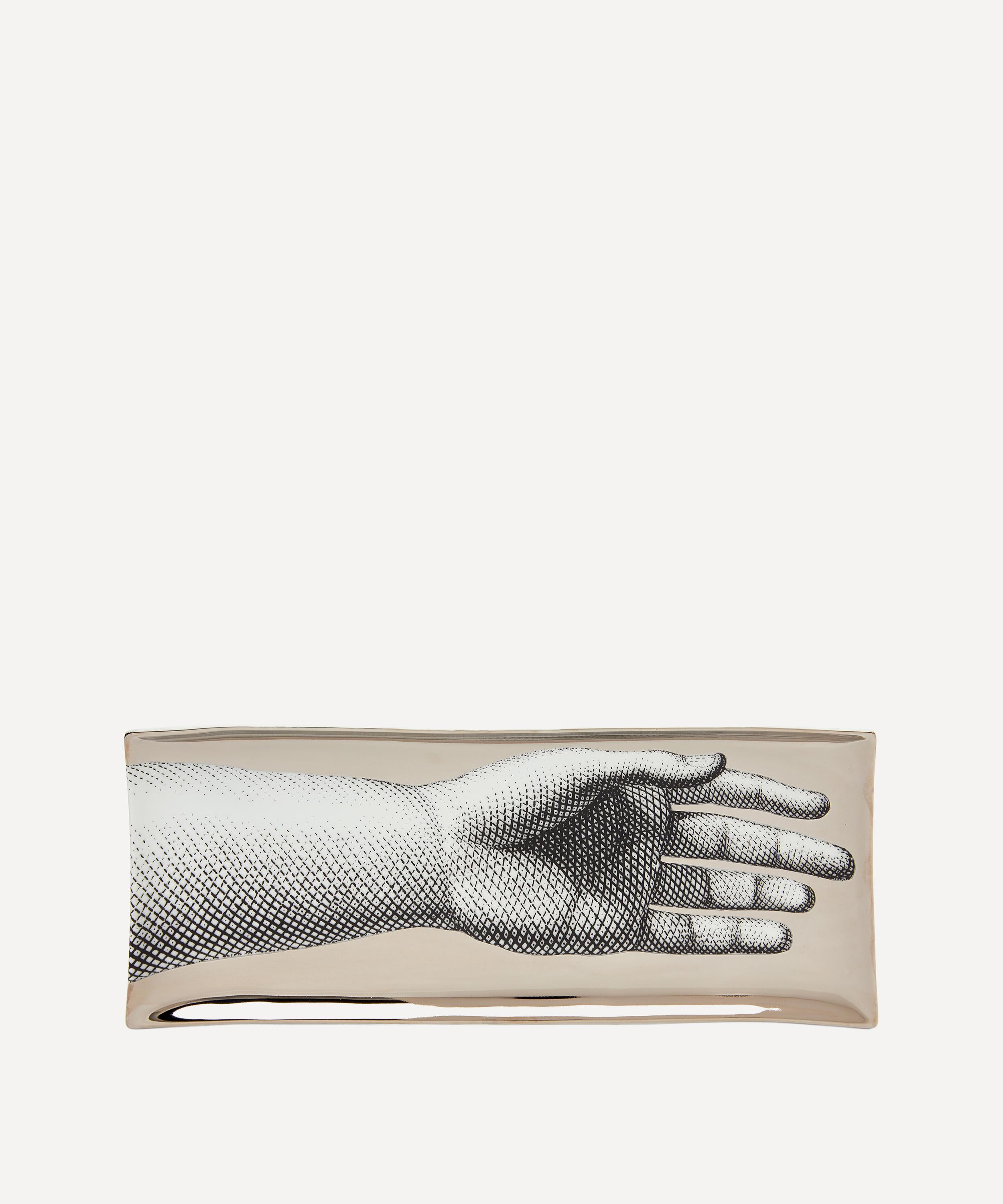 Fornasetti’s Mano decorative tray features an outstretched hand, positioned palm up – a striking housewarming gift or home accessory.