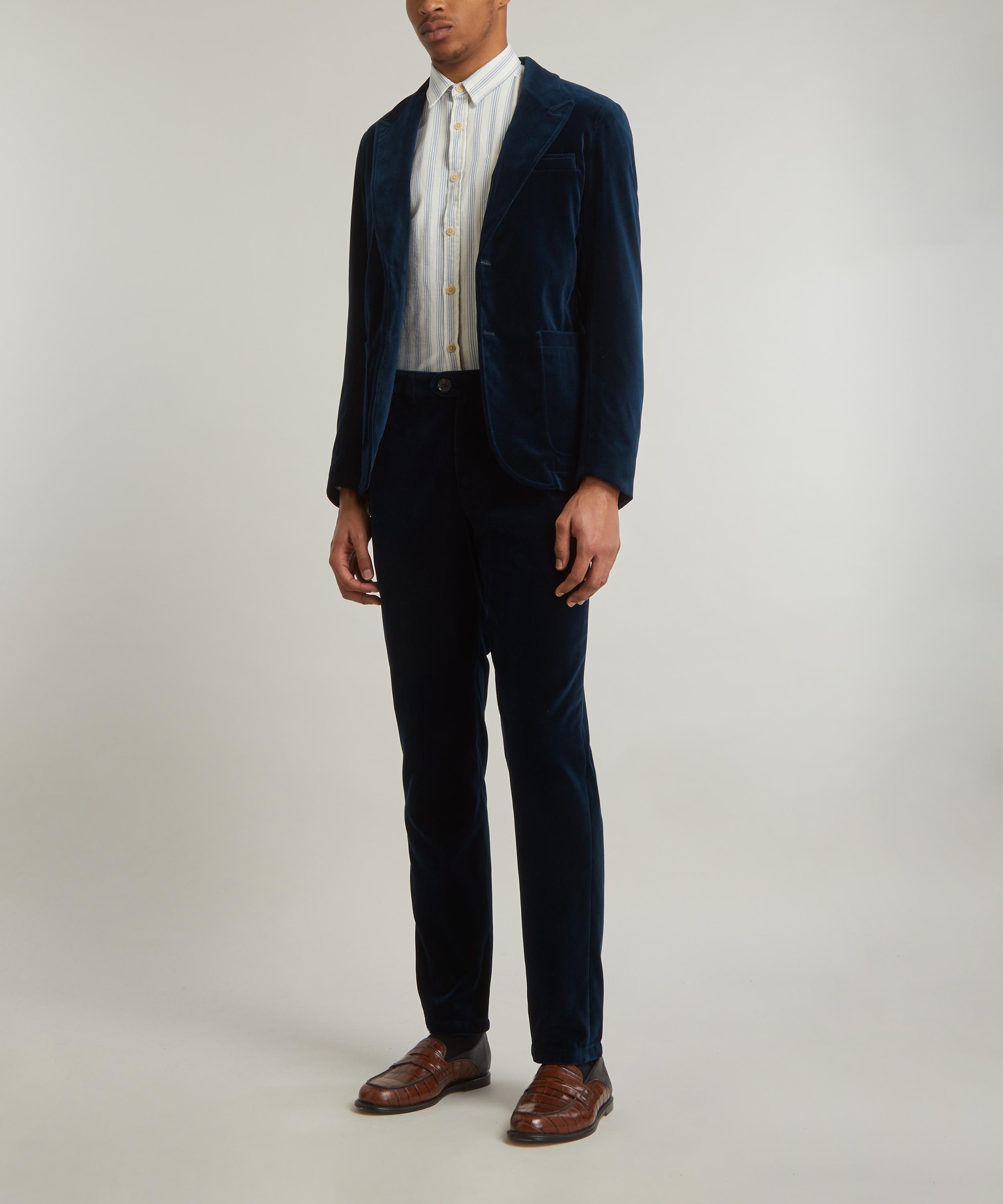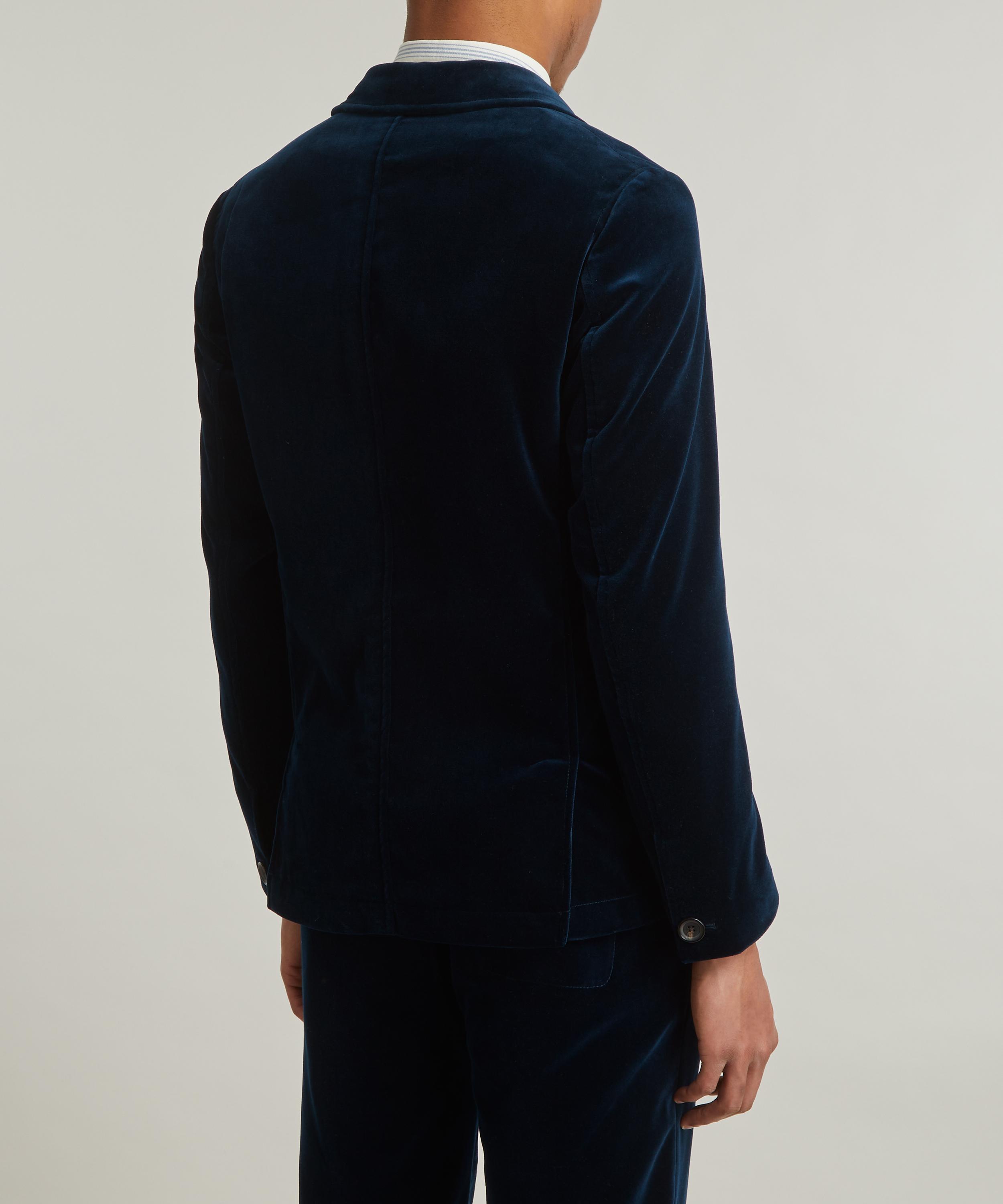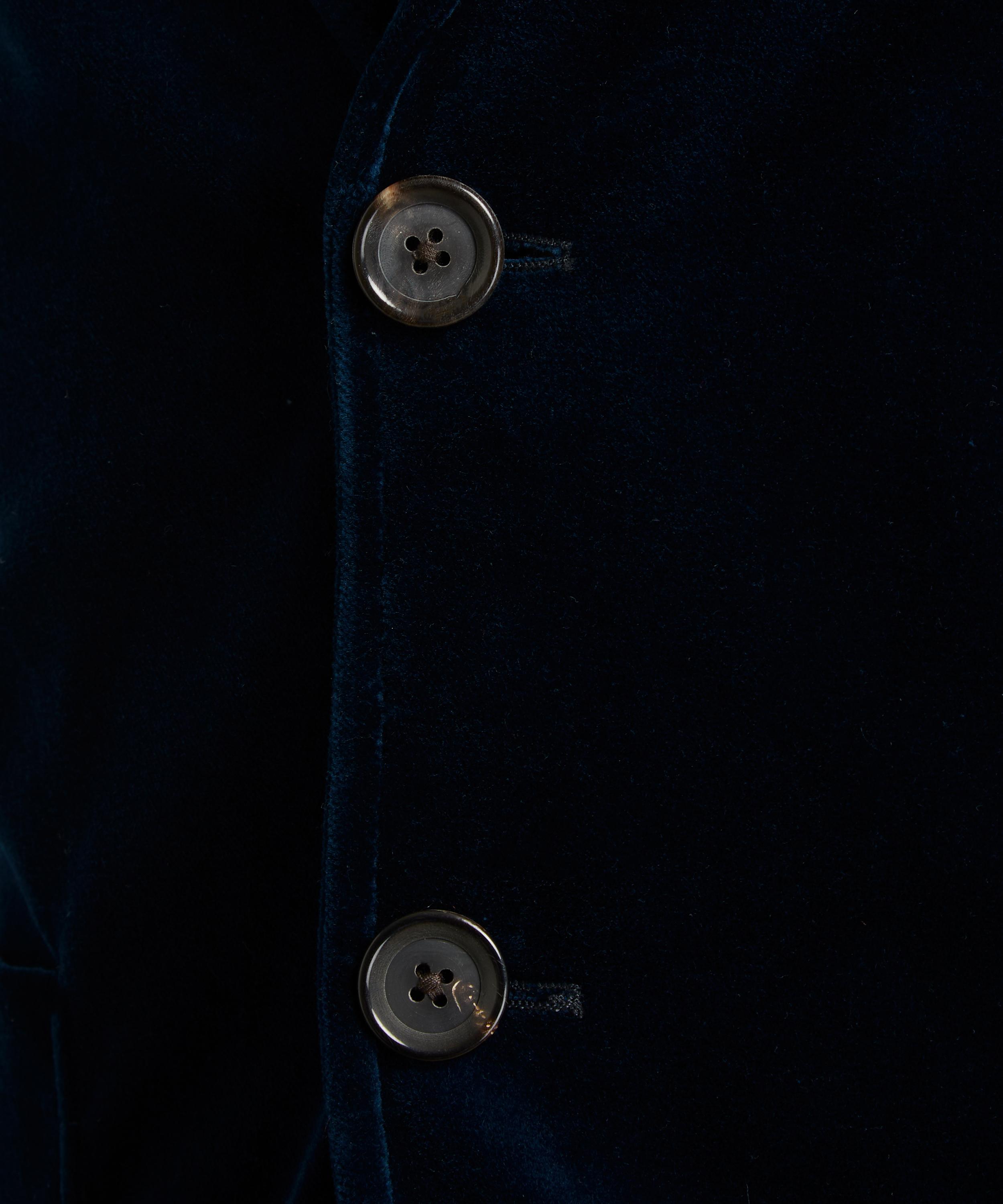 A sensationally sophisticated take on traditional tailoring with its rich, sapphire-blue velvet exterior, this unstructured jacket has a peak lapel with a loop button fastening, and features a chest pocket and two front pockets on either side of its button closure.
