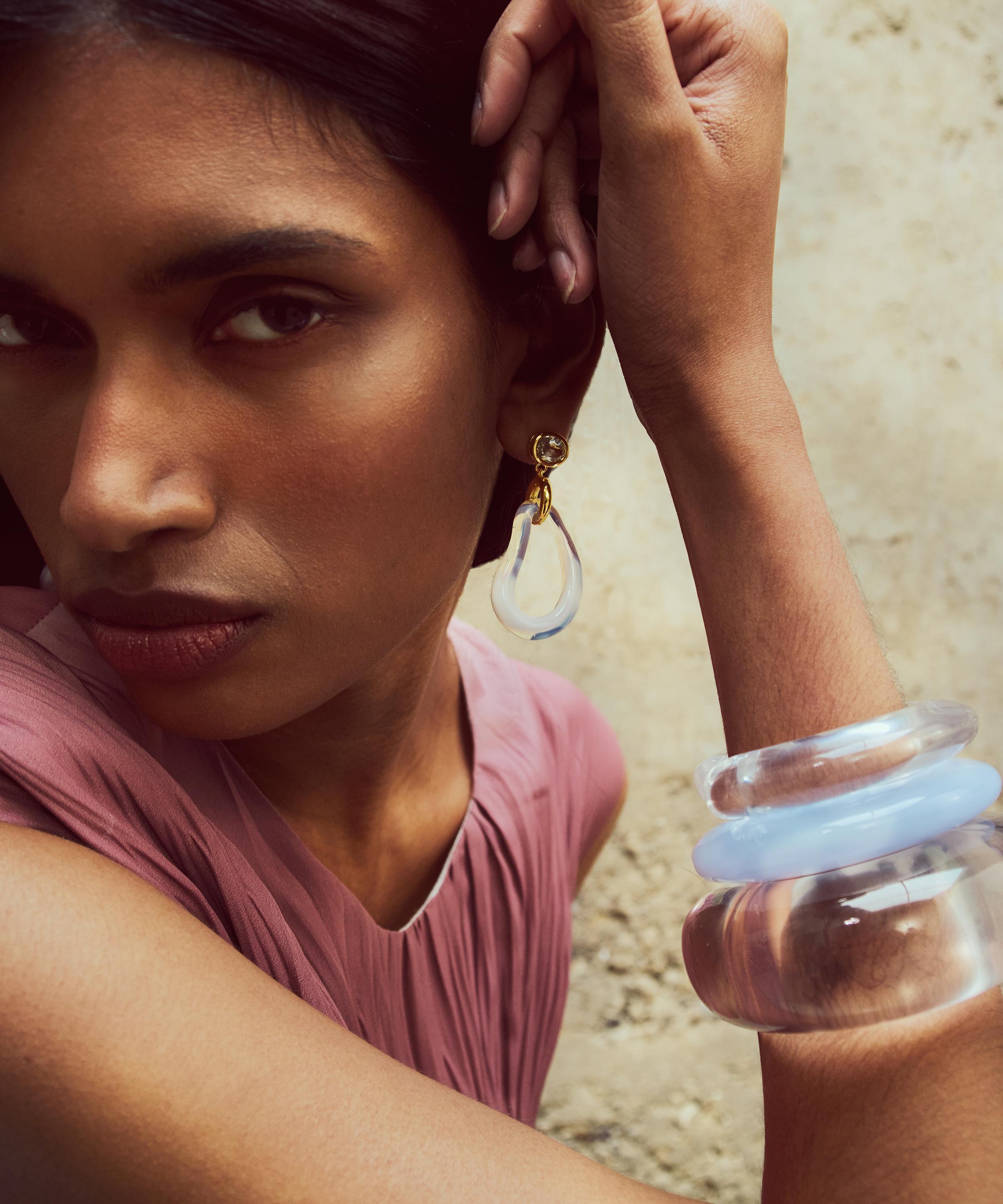 Meticulously crafted from lightweight resin, it features a bold statement silhouette in a marbled-blue hue. Capturing the brand’s signature balance of elegance and modern versatility, it doesn’t just adorn, but enhances the way you move, feel and shine, inviting a sense of quiet confidence.