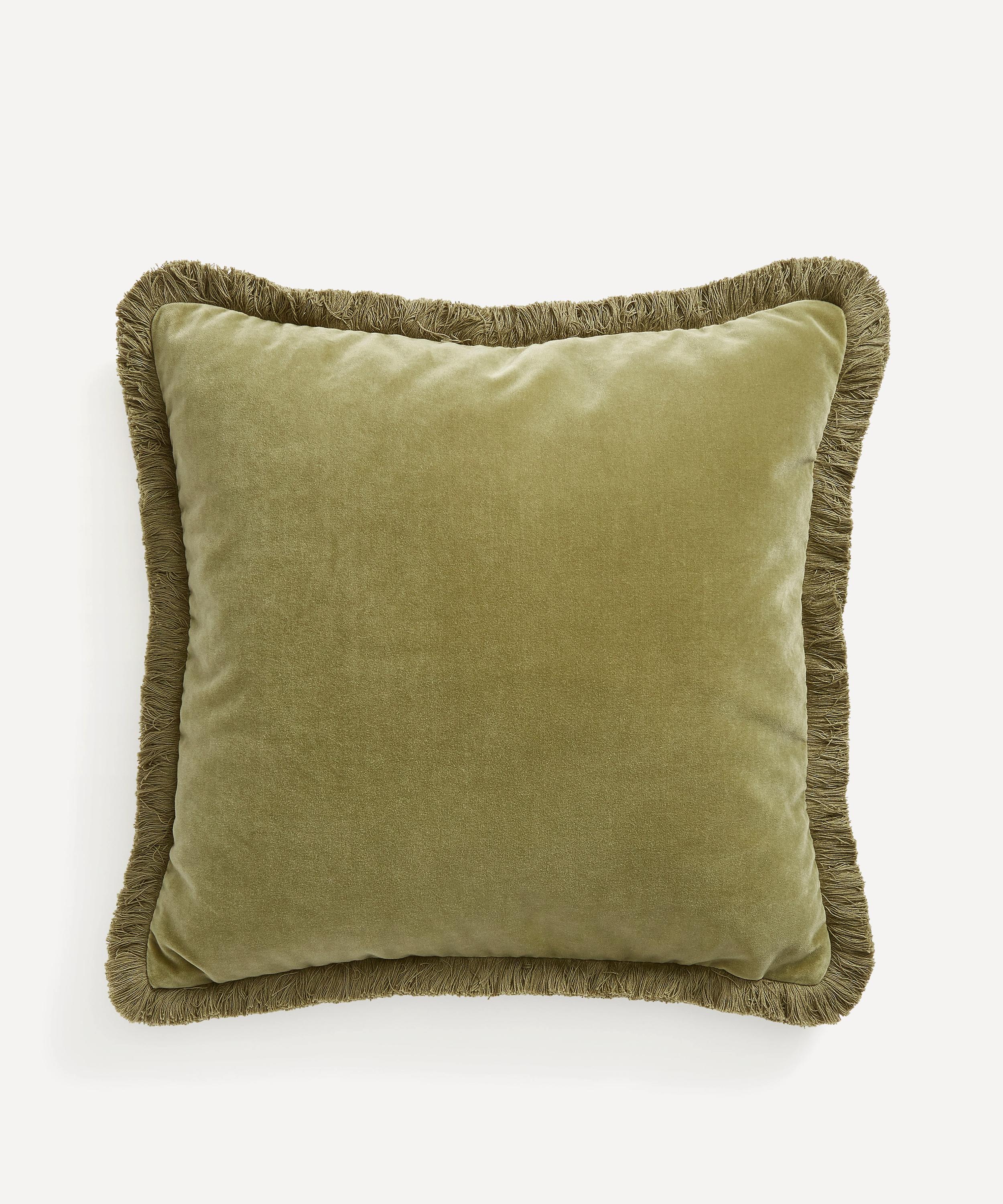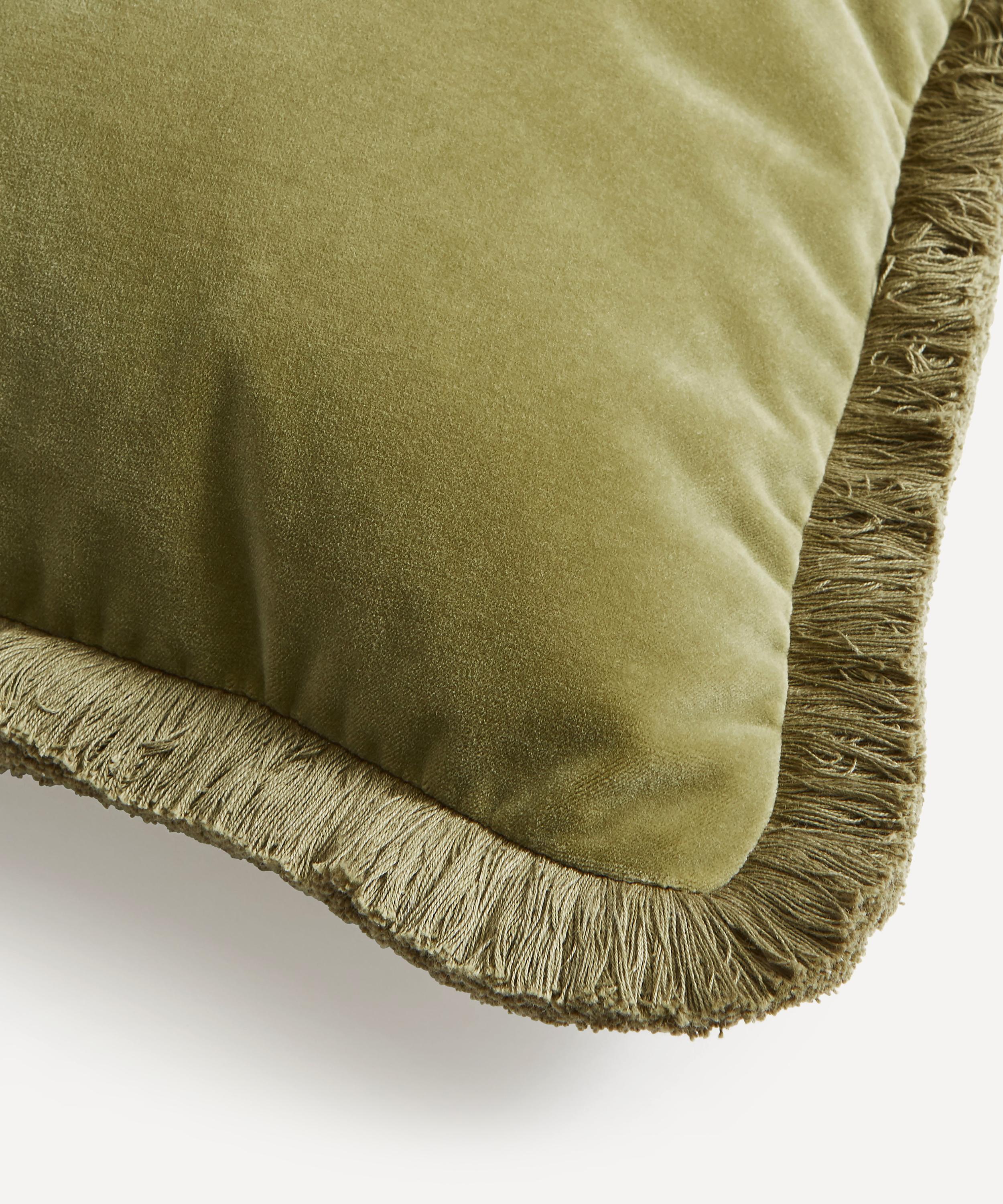 As seen in Soho House locations worldwide, this fringed cushion presents a sumptuously soft cotton velvet cover, well-filled with feather padding for comfort you can sink into.