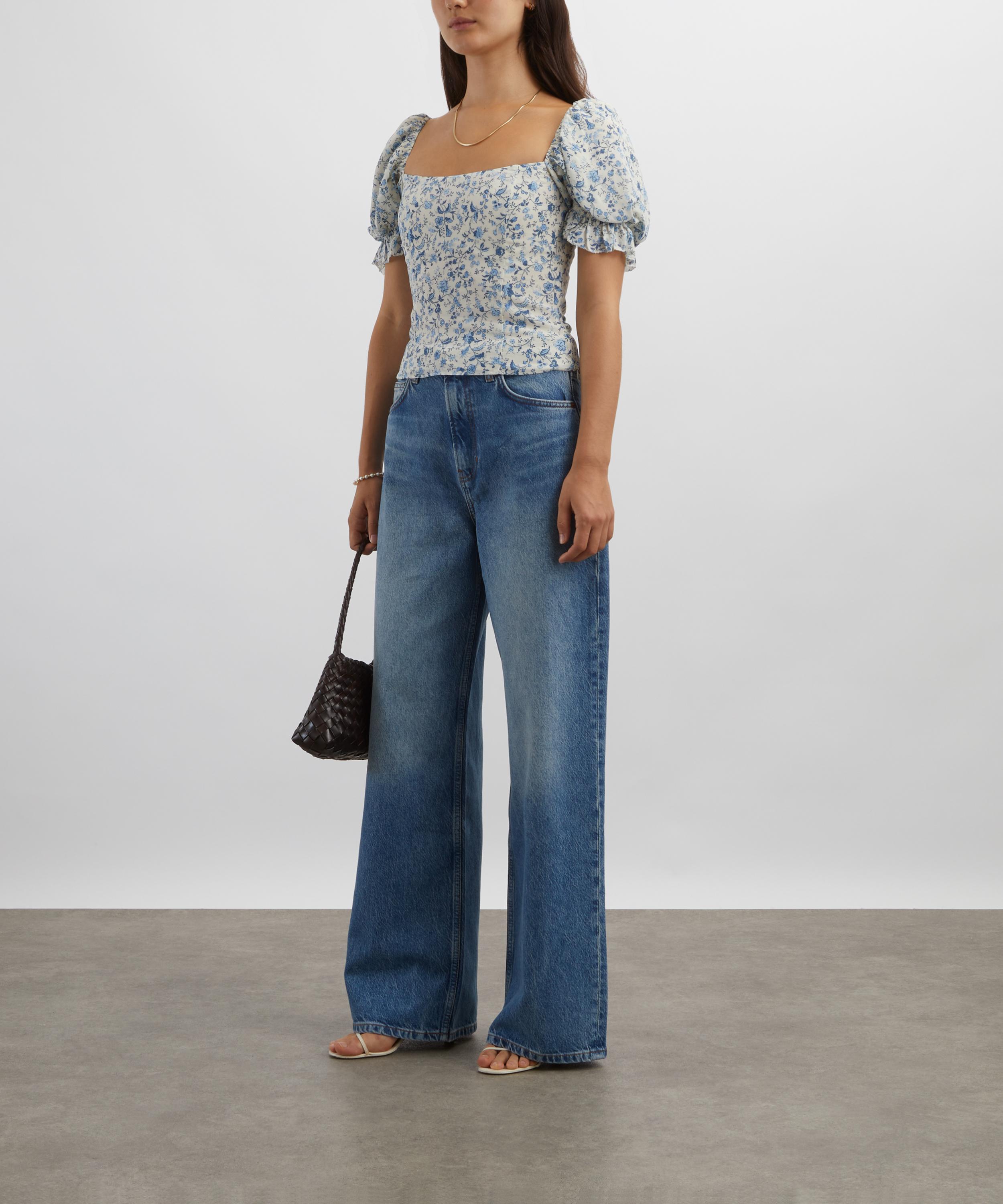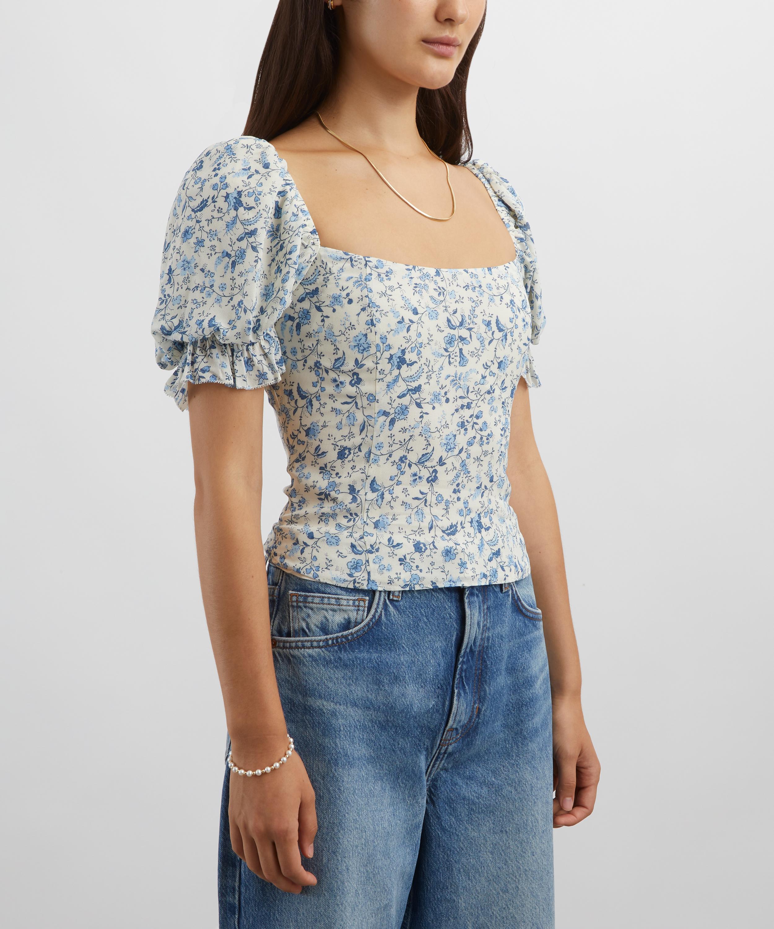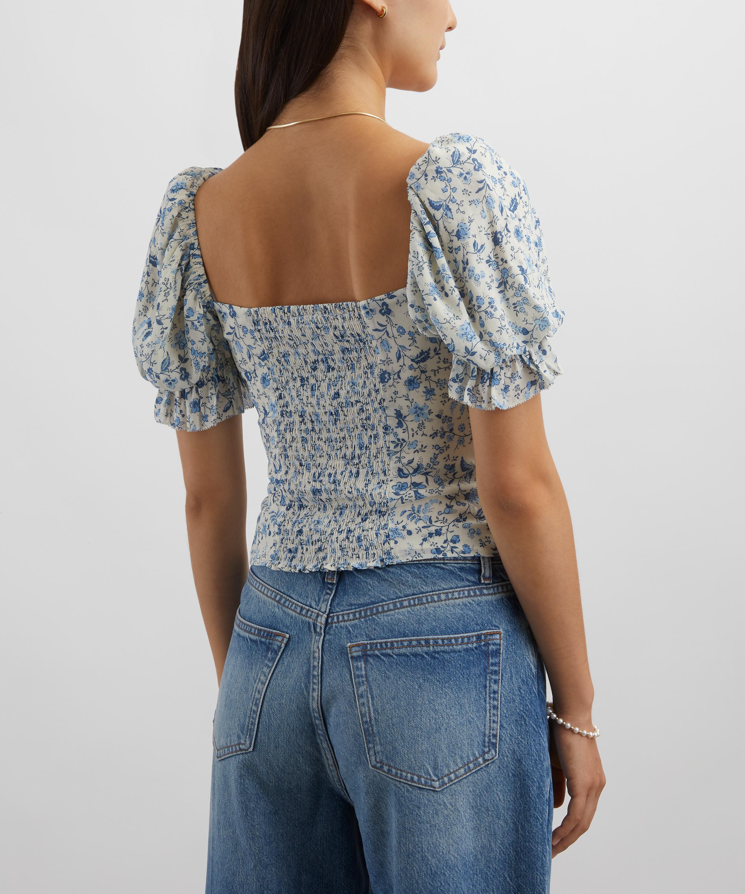Crafted from lightweight georgette fabric adorned with blue florals, this fitted top exudes effortless elegance. Designed with a square neckline and voluminous puff sleeves, it’s finished with a smocked back panel for ease and all-day comfort.