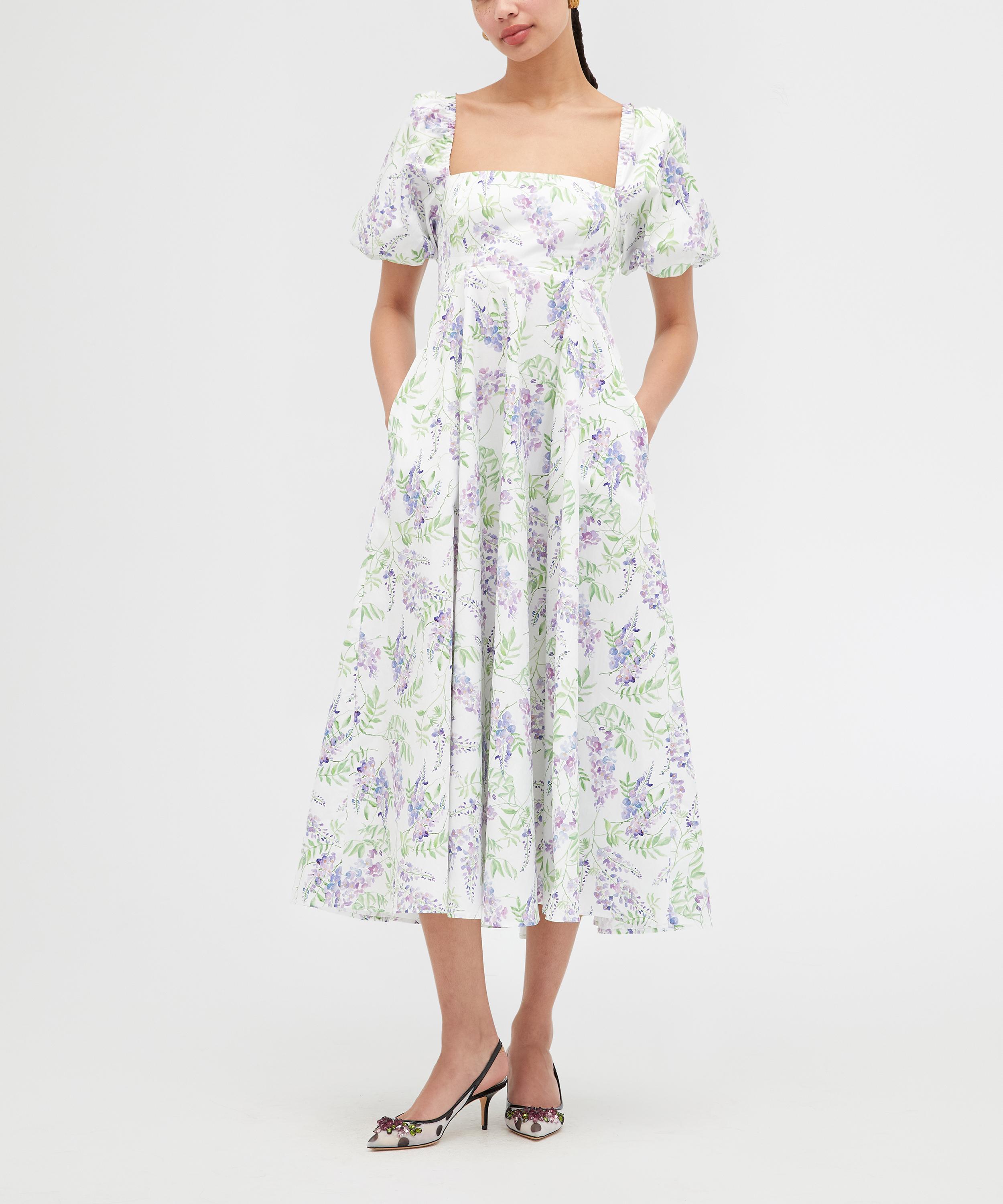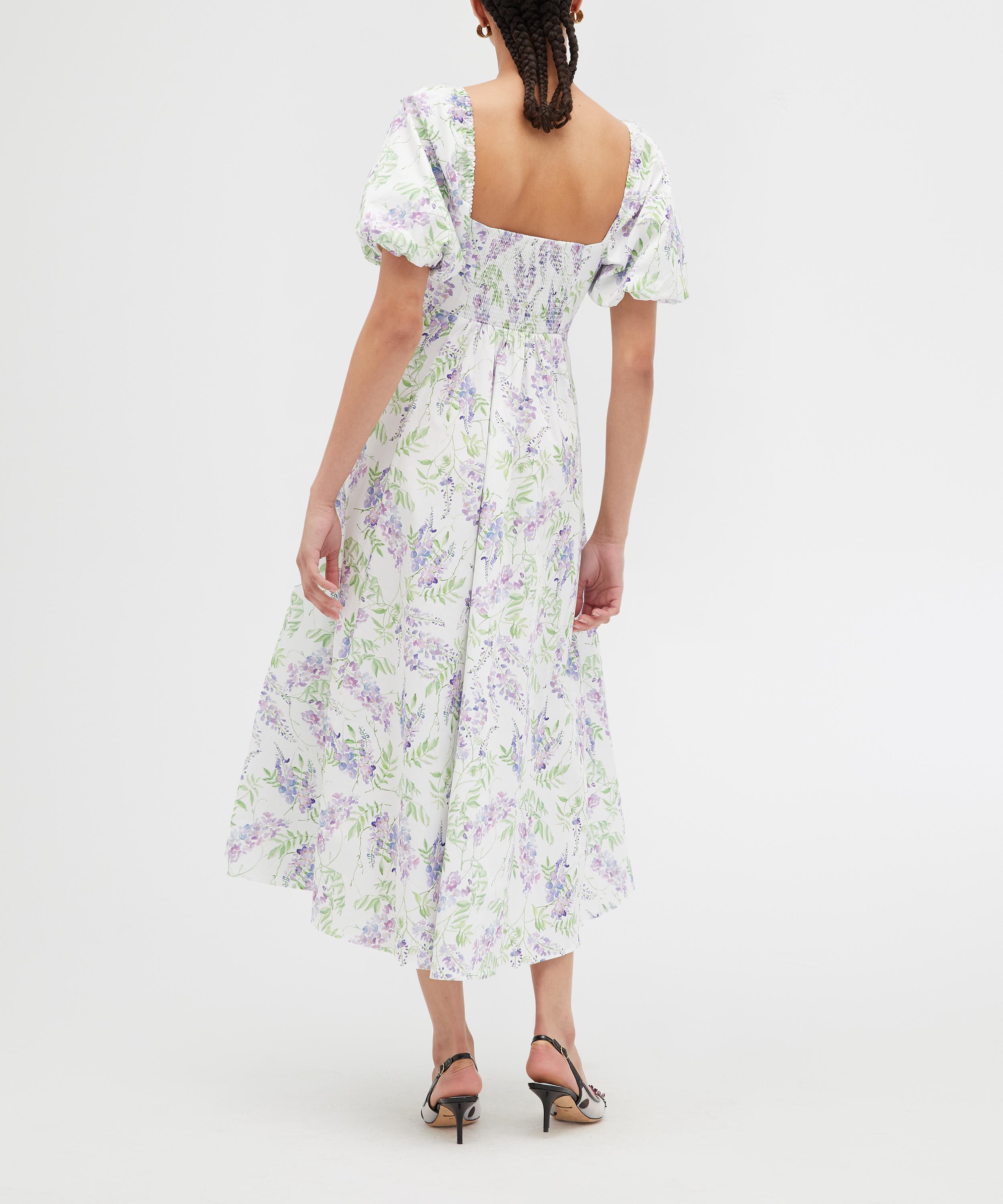 Soft, comfortable and pretty enough to wear from day to night, this cotton sateen sundress is set to become a seasonal staple with its dainty wisteria pattern. Fitted with an elegant empire waist and princess seams, Matilda features a square neckline, voluminous puff sleeves and a shin-grazing full skirt.