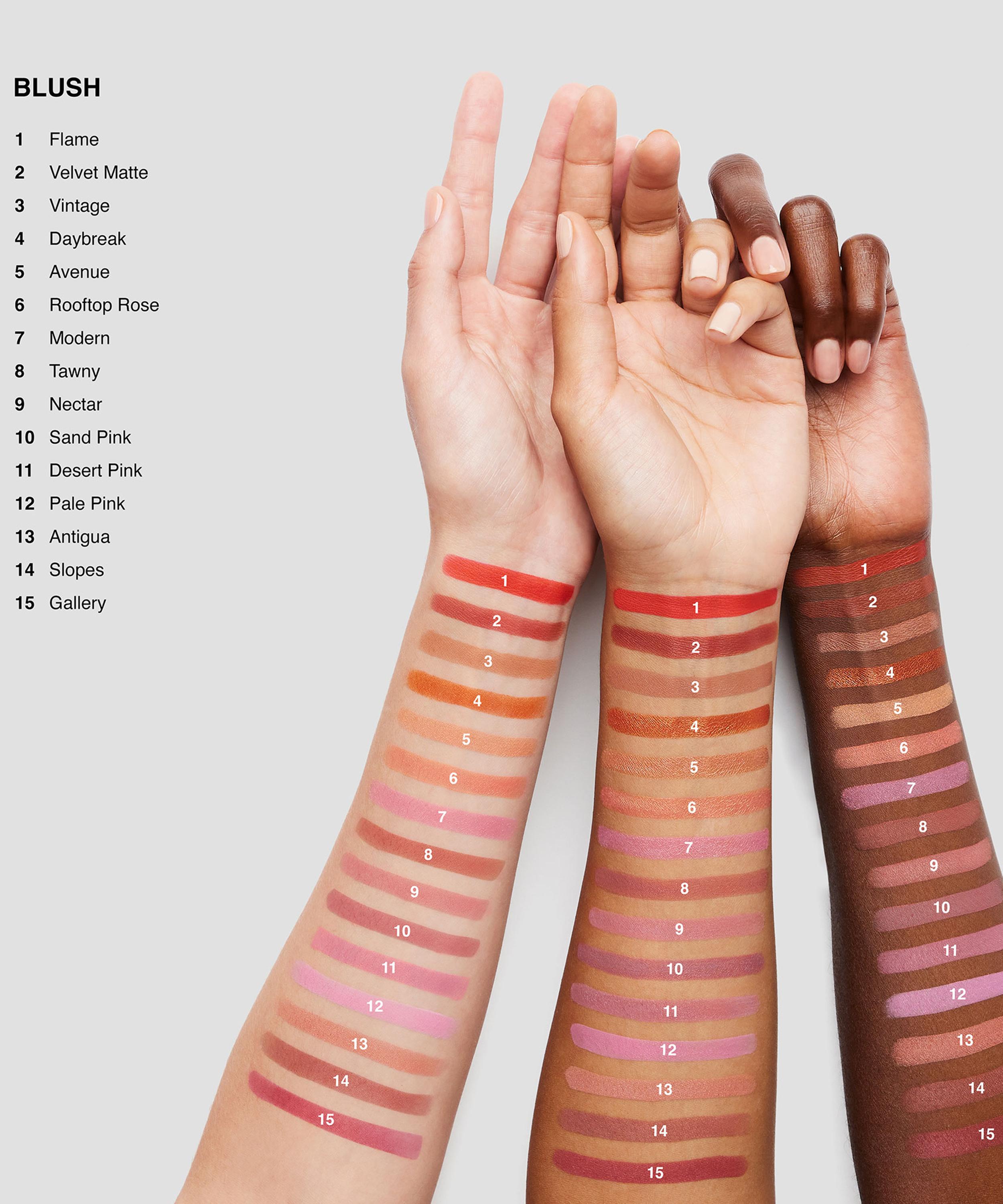 Apply to apples of the cheeks, blending outward and upward along cheekbones, and then downward for a natural effect.