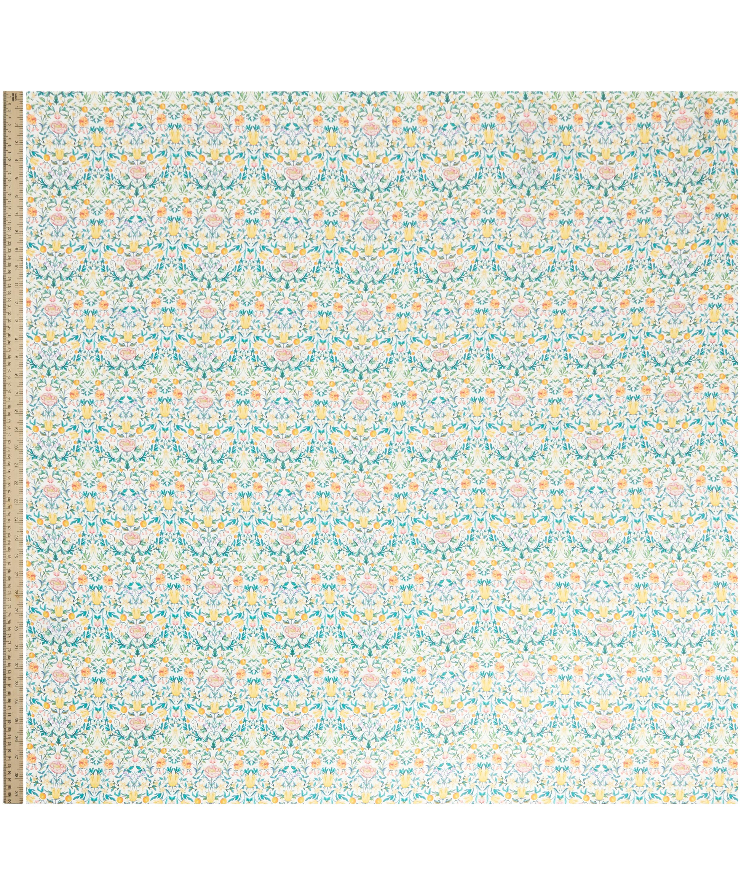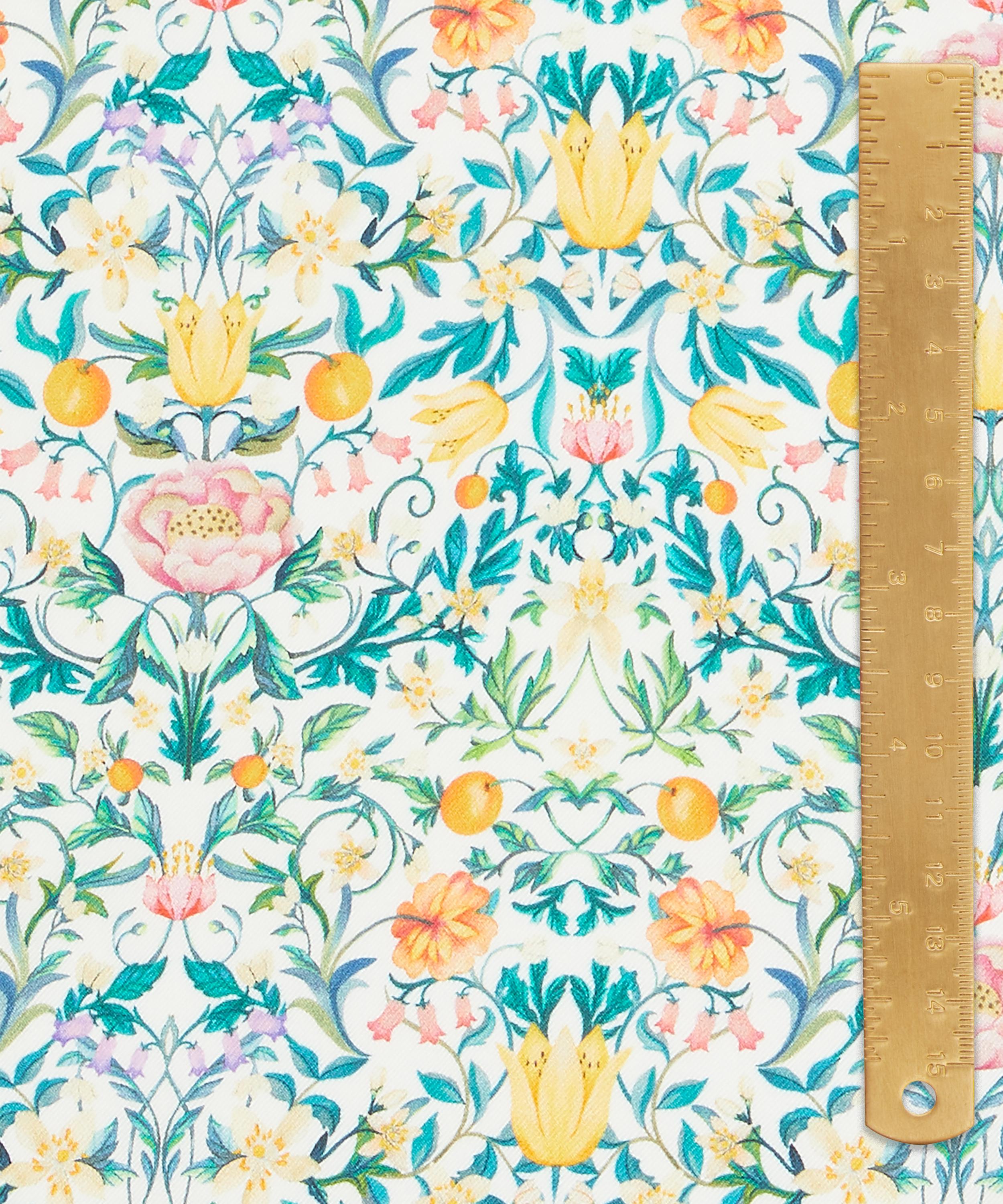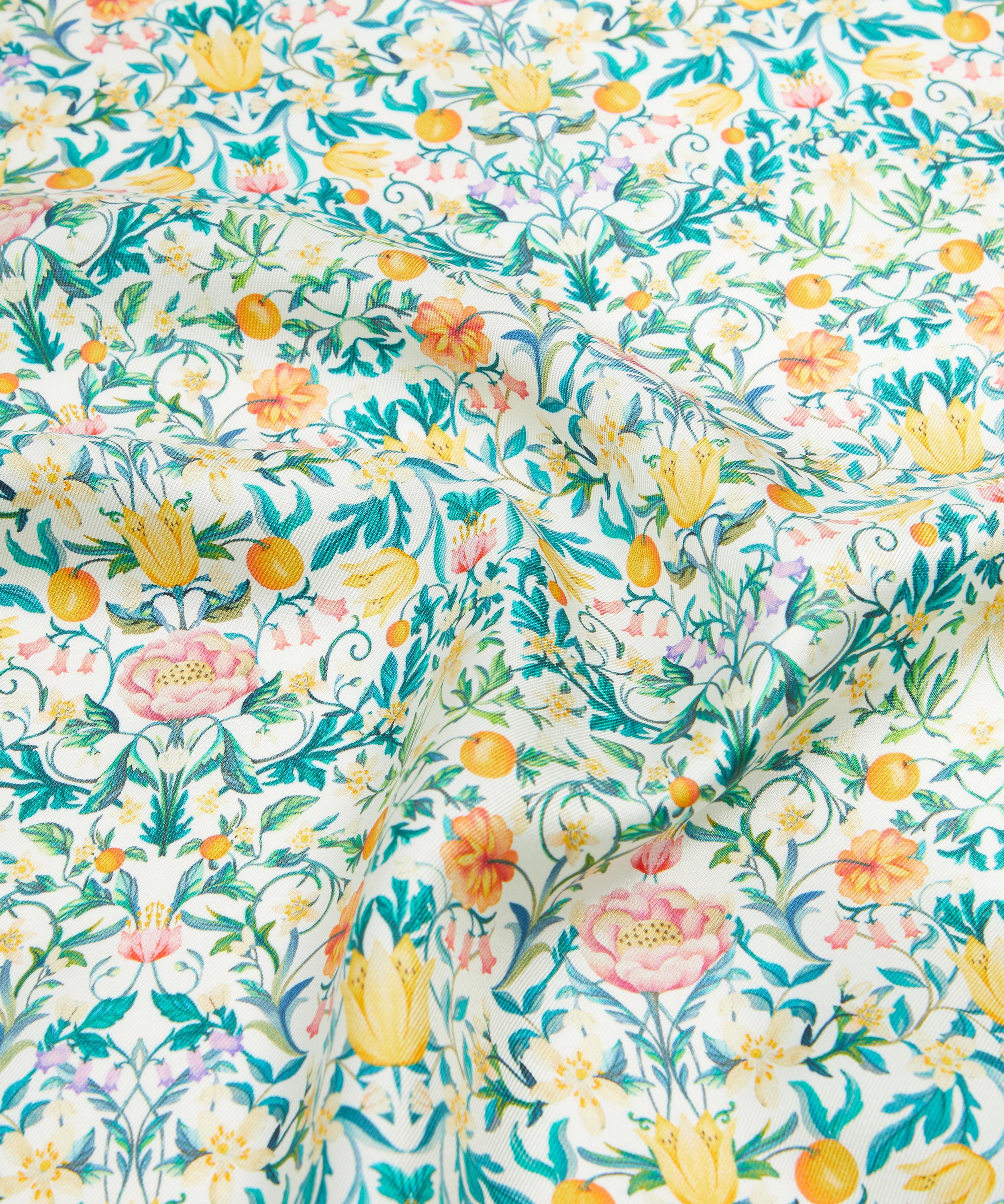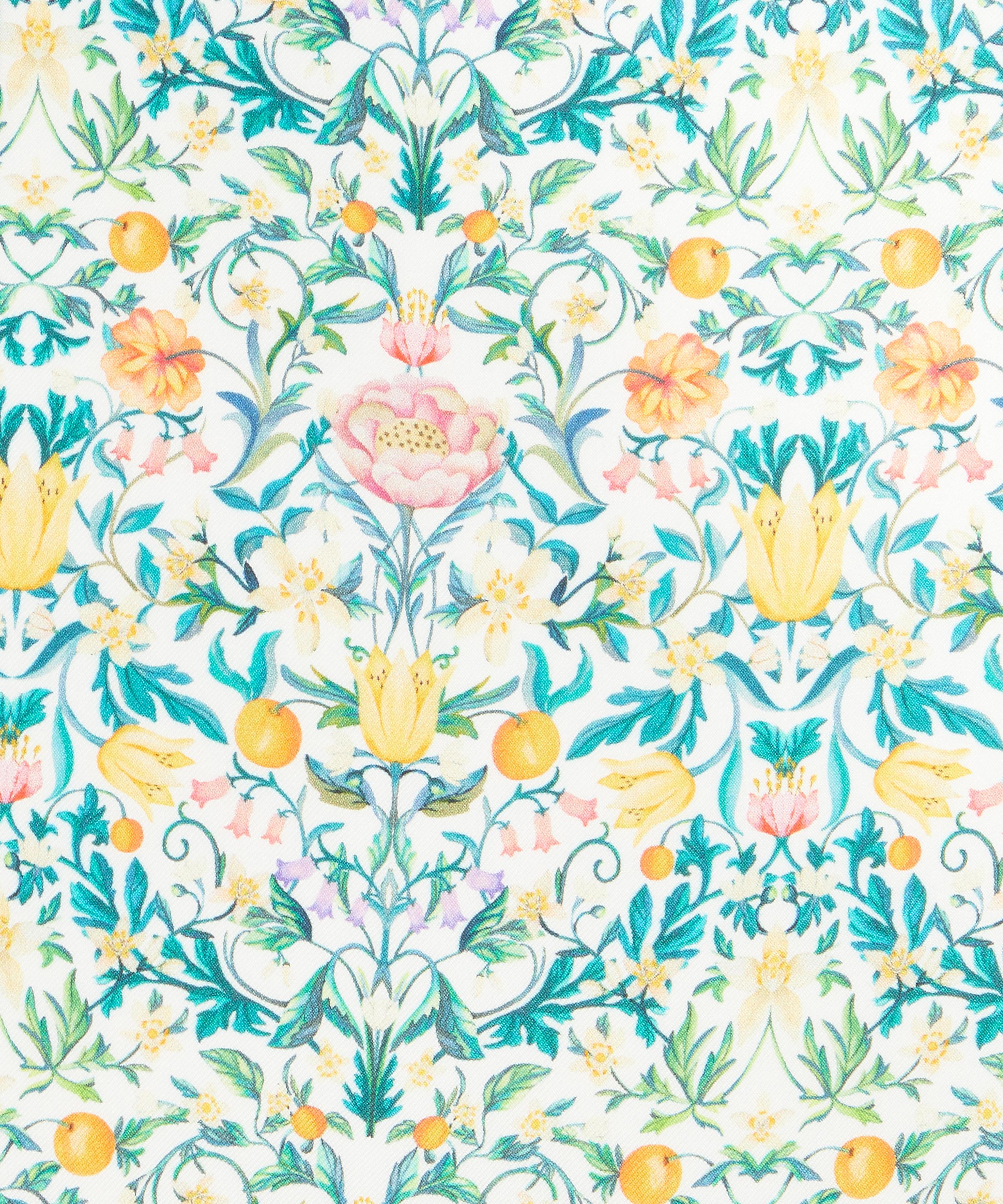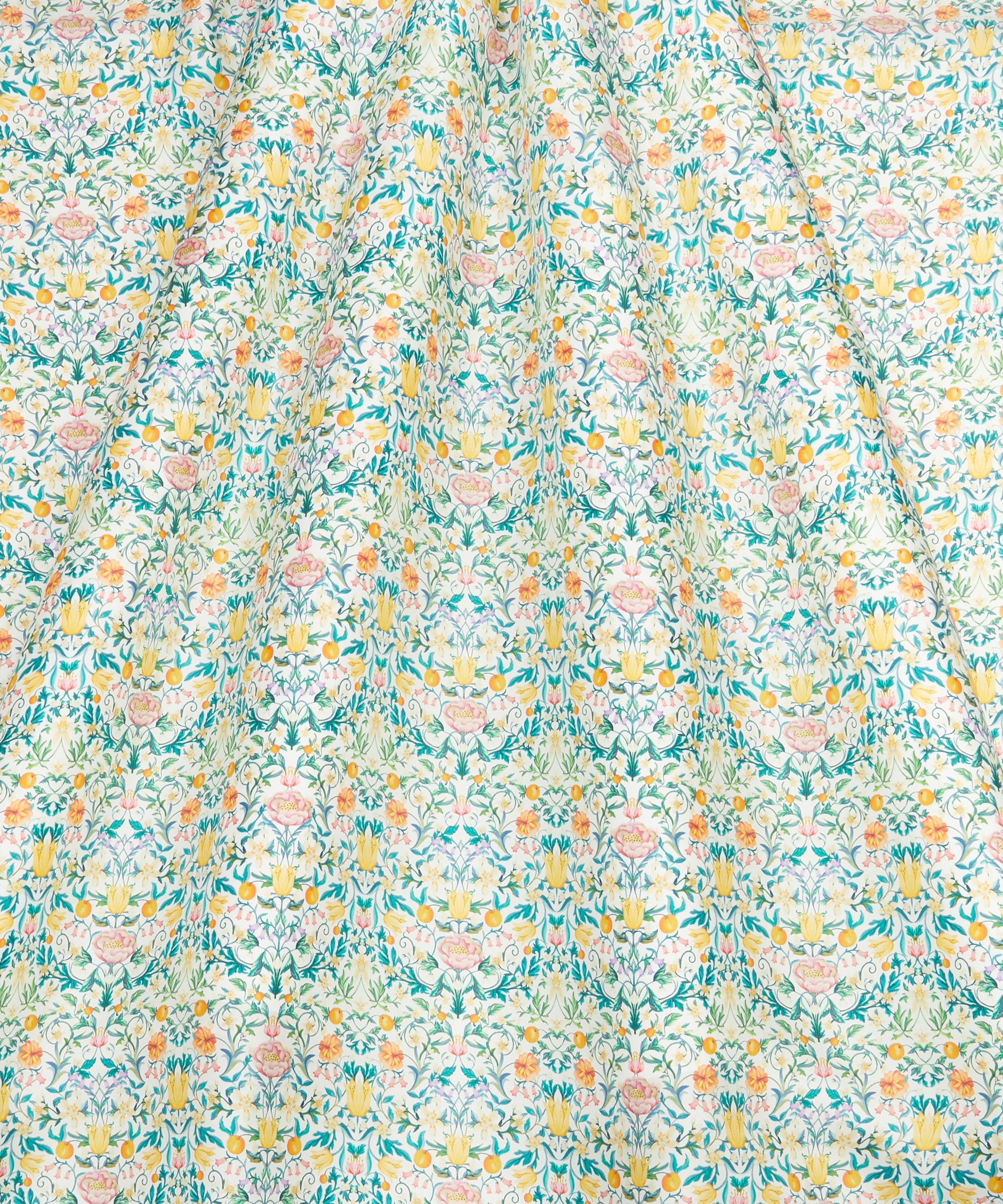 Echoing the exquisite embroideries of May Morris, this contemporary interpretation of a traditional Arts & Crafts style design was meticulously hand-painted in our Liberty London studio. Adorned with intricate botanical details, May’s Orchard features an array of blooming flowers and spring blossom, intertwined with trailing foliage and a variety of delectable orchard fruits. Drenched in richly saturated colour and soft watercolour washes, this sophisticated structured repeat is a celebration of spring, captured through a quintessential Liberty lens.