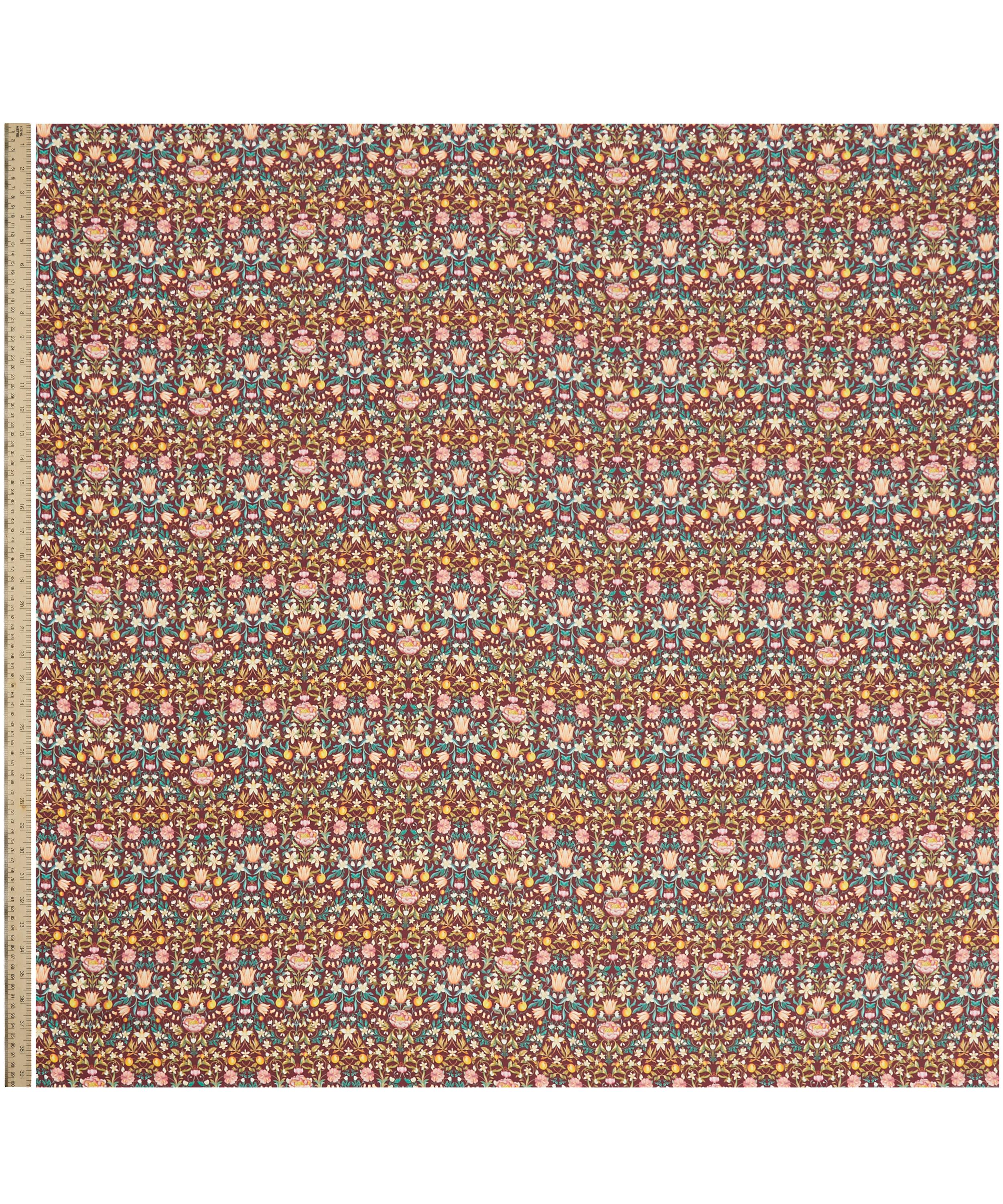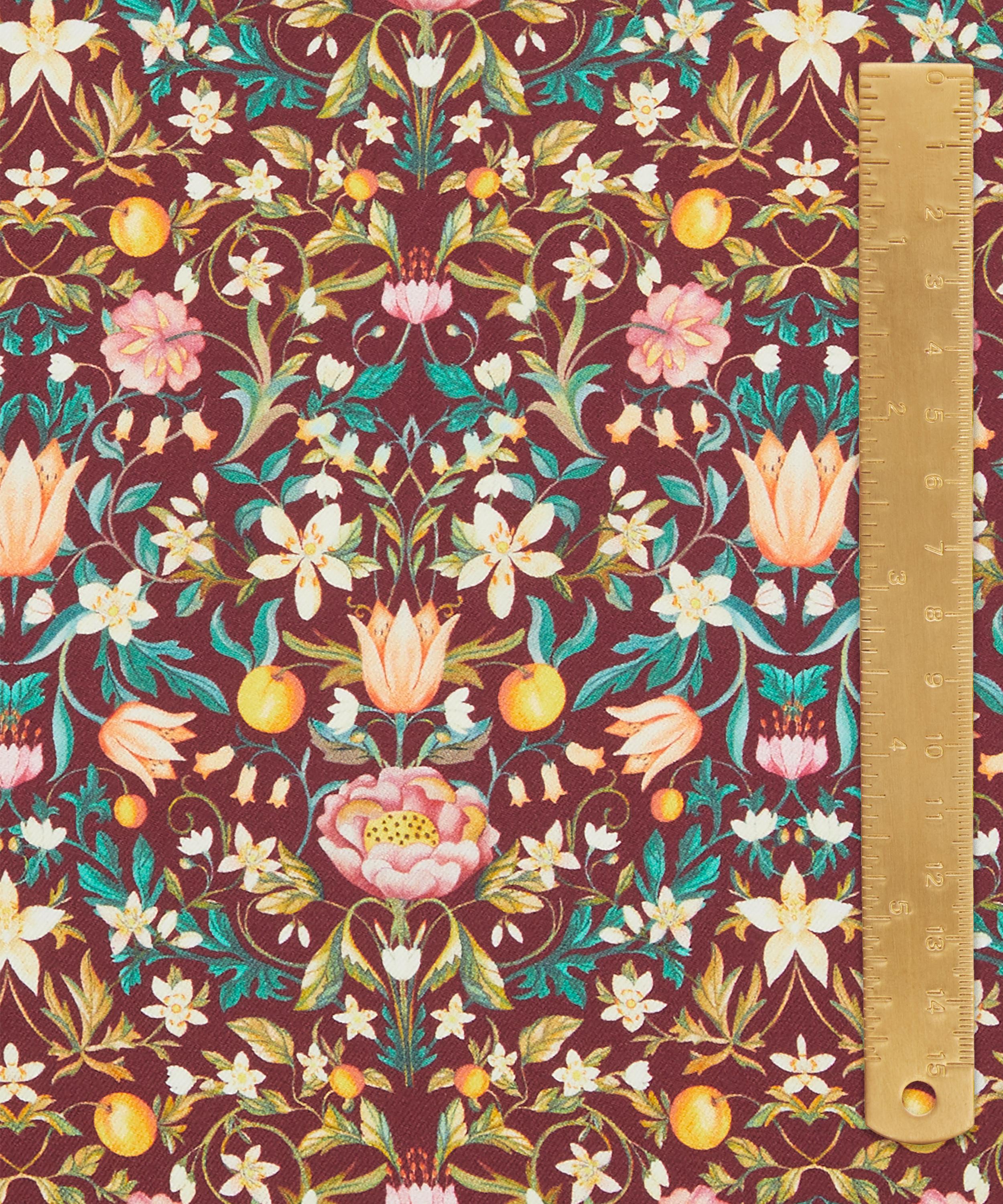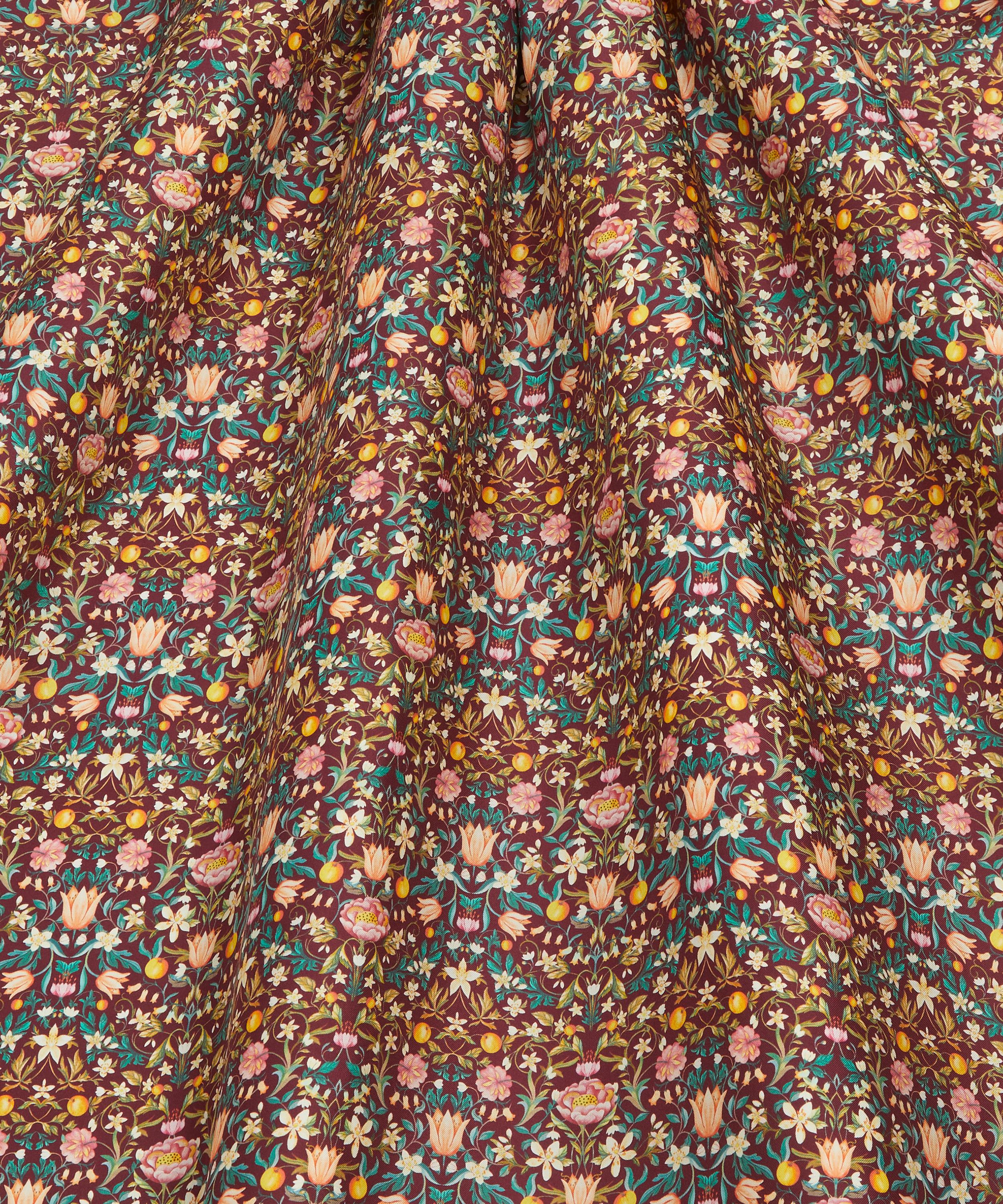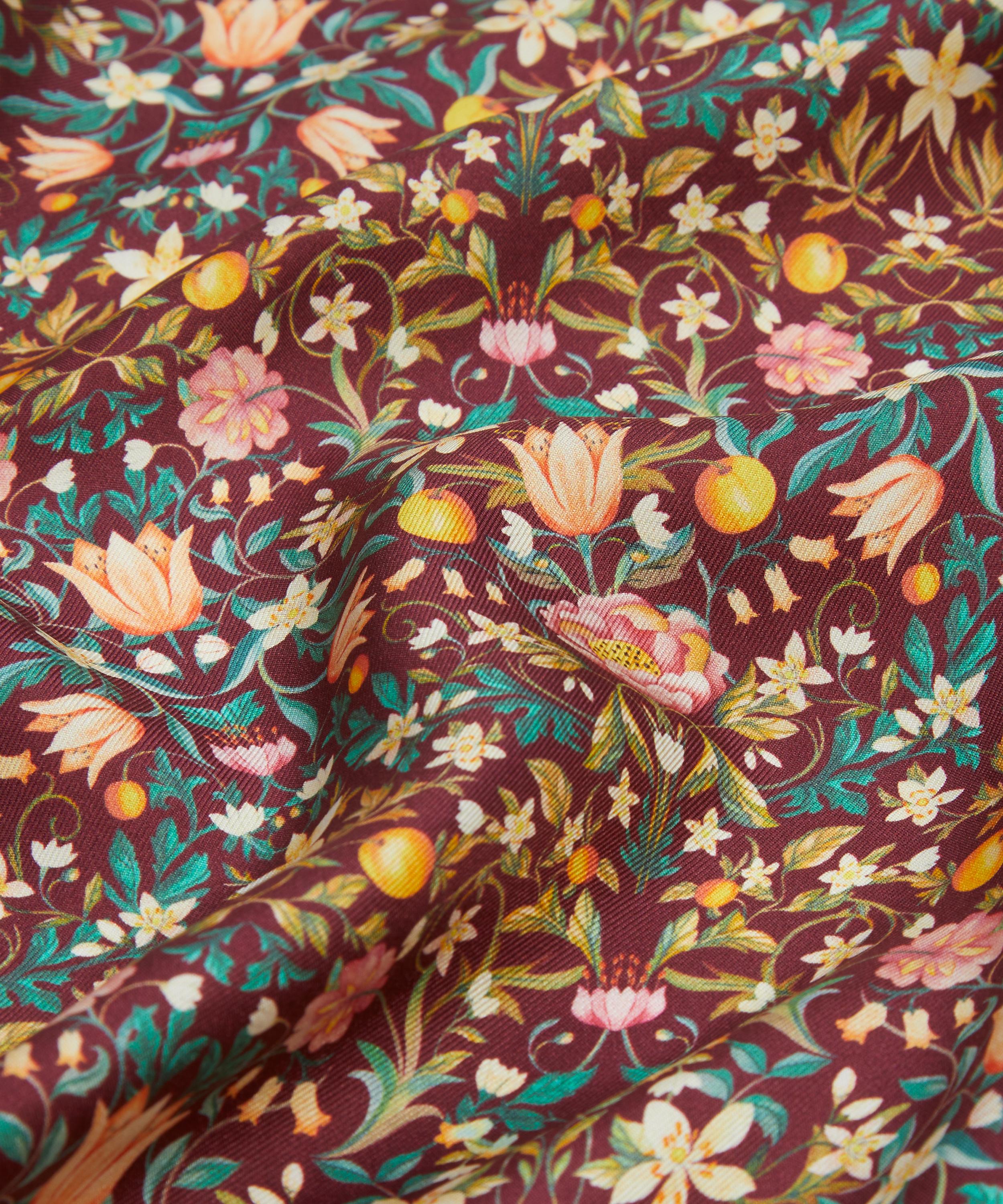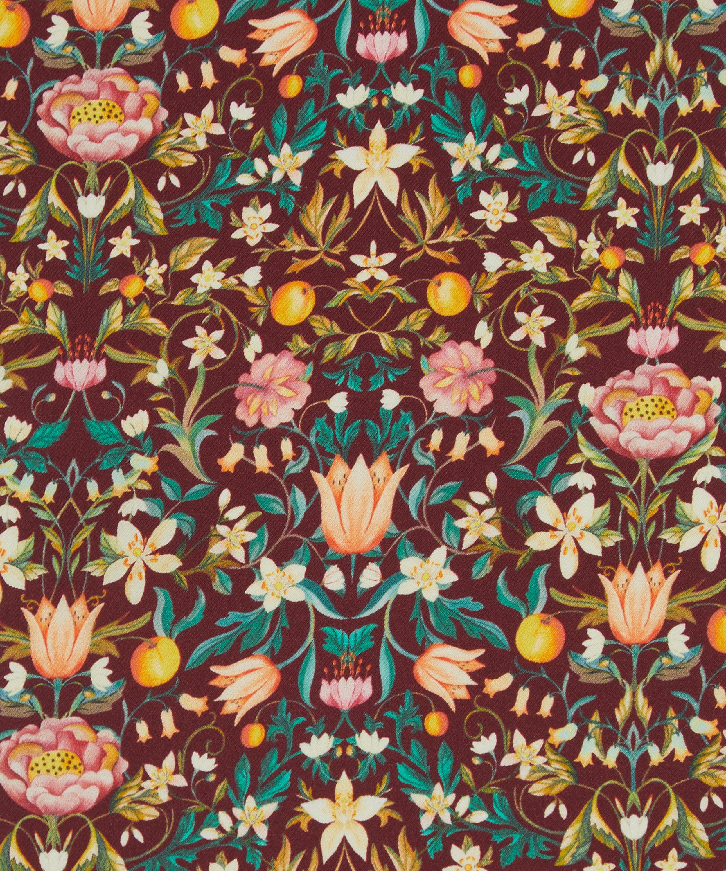 Echoing the exquisite embroideries of May Morris, this contemporary interpretation of a traditional Arts & Crafts style design was meticulously hand-painted in our Liberty London studio. Adorned with intricate botanical details, May’s Orchard features an array of blooming flowers and spring blossom, intertwined with trailing foliage and a variety of delectable orchard fruits. Drenched in richly saturated colour and soft watercolour washes, this sophisticated structured repeat is a celebration of spring, captured through a quintessential Liberty lens.