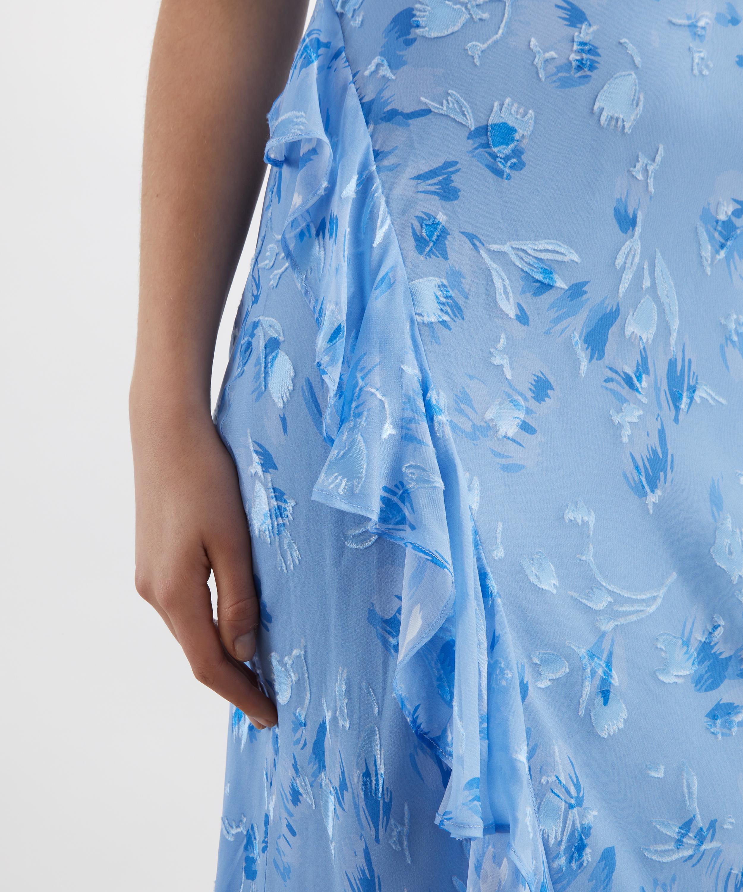 Crafted from opulent silk-satin devoré adorned with a blue bouquet print, this romantic, vintage-inspired dress captures a sense of refined femininity. A modest V-neckline, short butterfly sleeves, and fluttering ruffles channel a subtle 1970s sensibility, making it equally suited to weddings, work, or holidays.