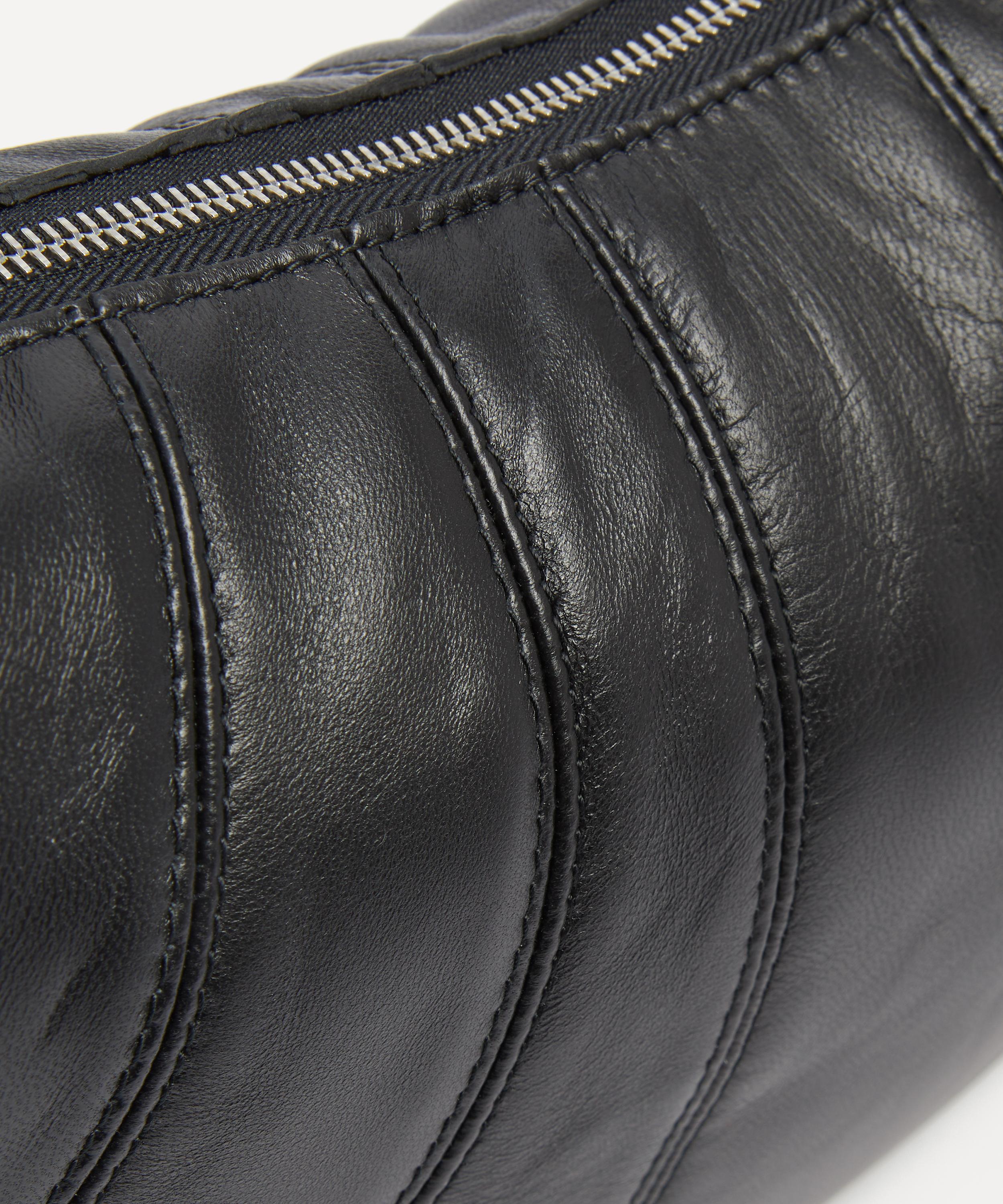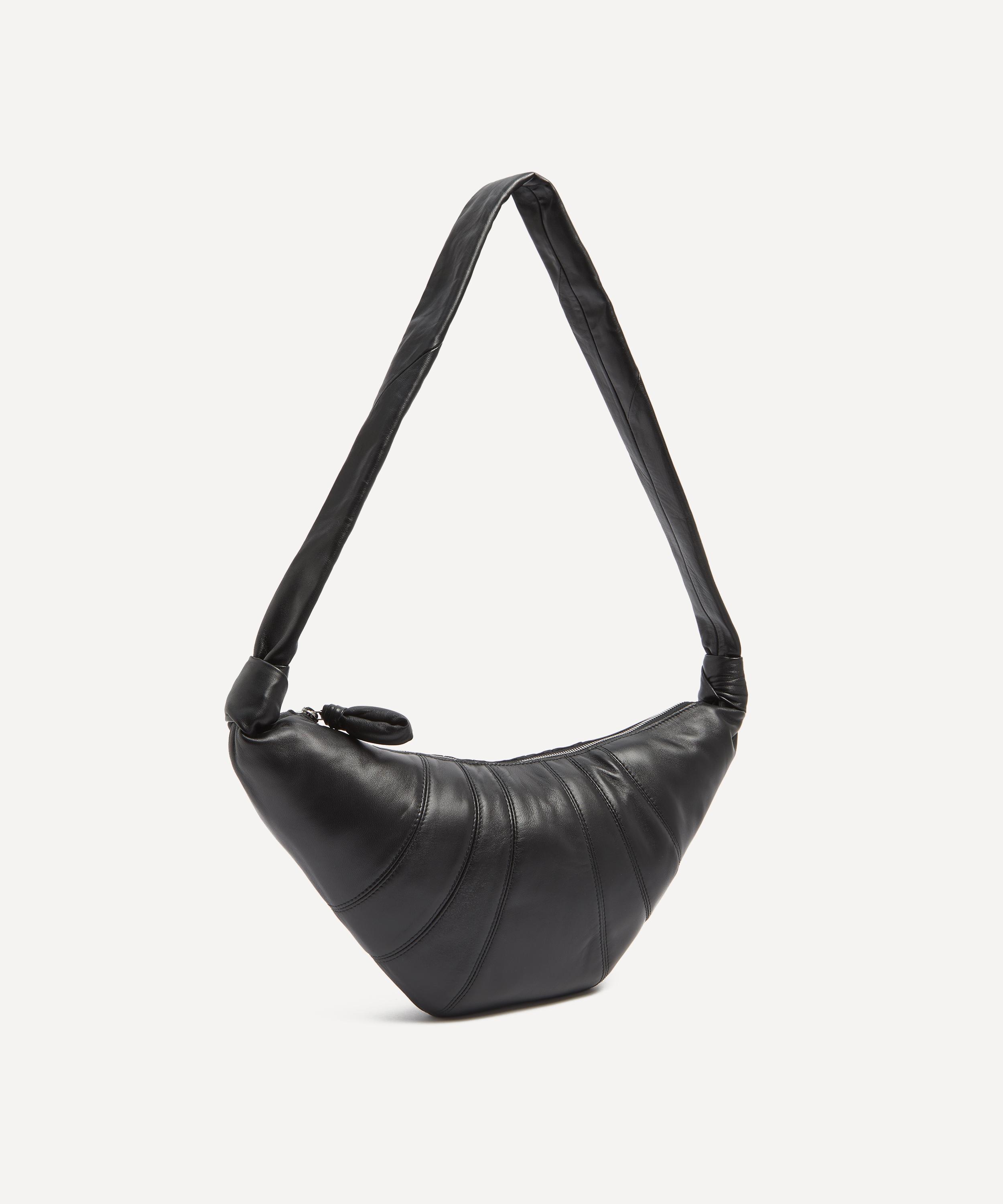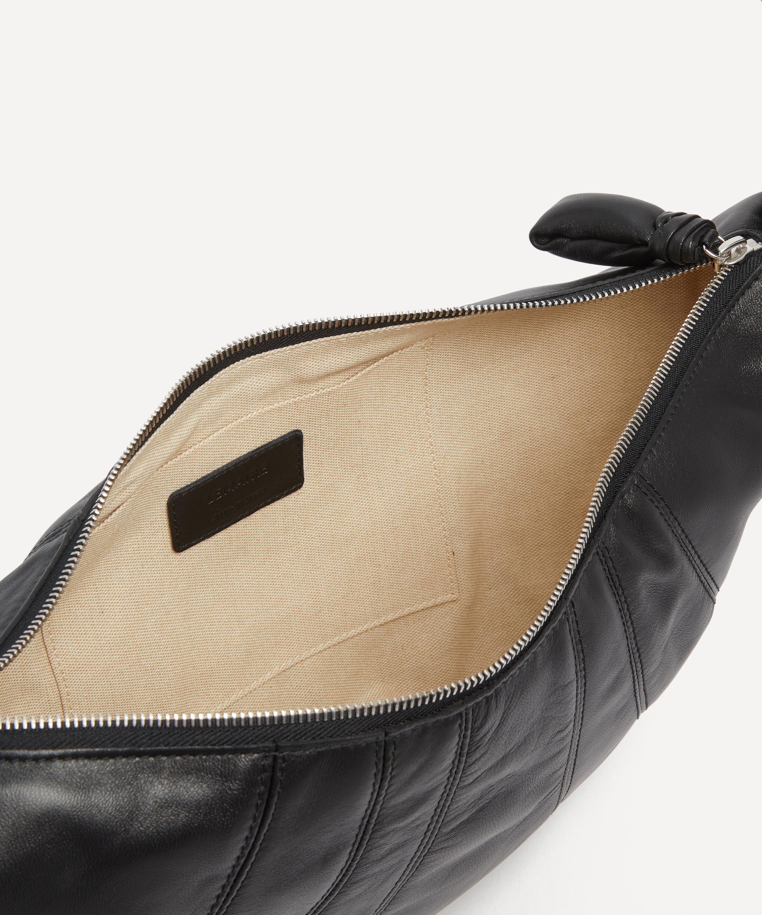 Crafted from a soft and supple lamb nappa leather with a cotton canvas lining, it features the brand’s iconic croissant-inspired silhouette – a design achieved through an assembly of top-stitched cutouts. Fashioned with a top zip pull to secure the main compartment and one interior patch pocket, it’s complete with a wide leather strap that can be worn over the shoulder or cross-body.