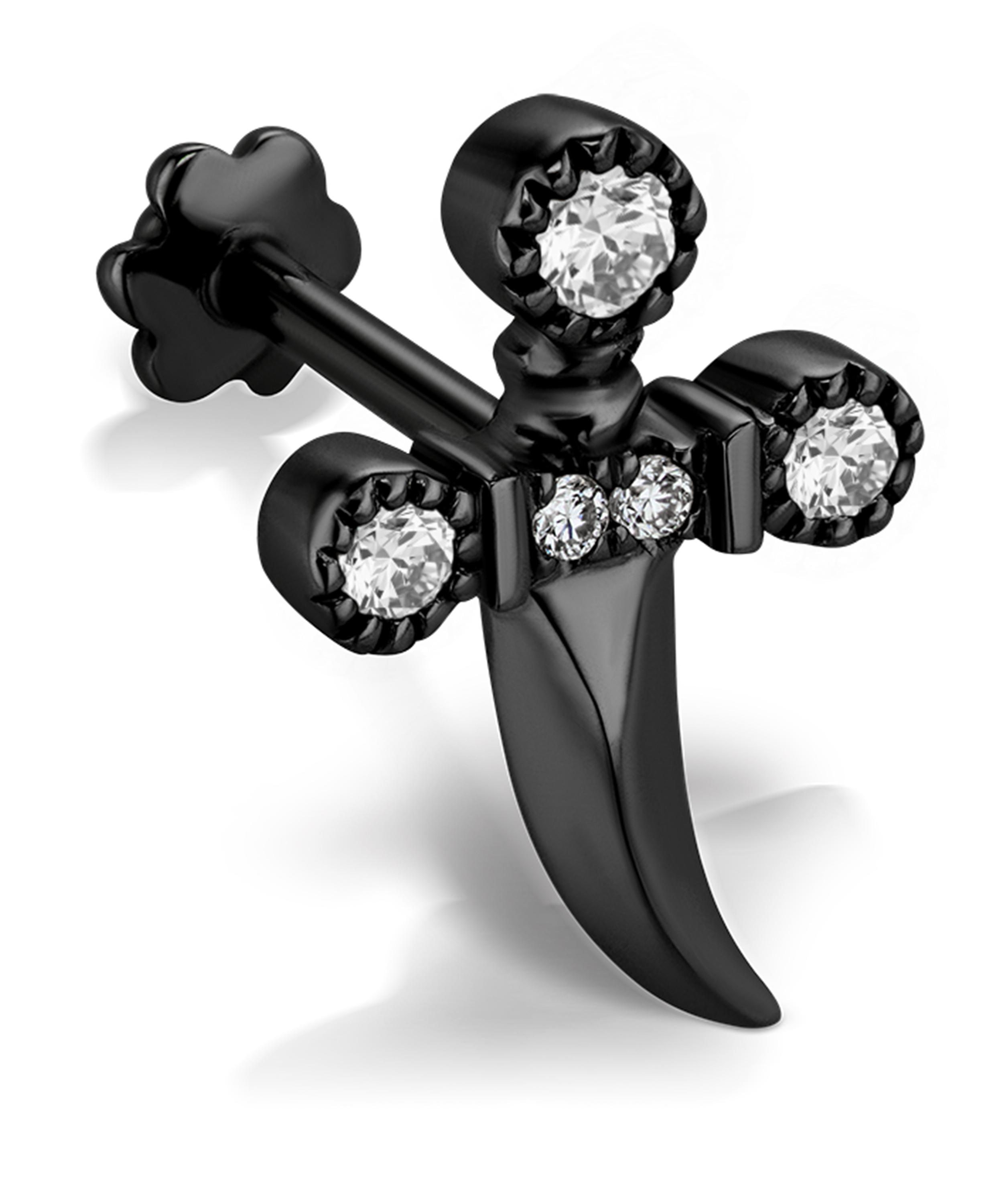 Available in multiple varations of high-polished 18 carat gold, this single stud features a small, right-curving dagger. Designed to mimic a real weapon, the sculptural blade is raised at the centre, while the intricately detailed pommel is set with five white diamonds - three in milgrain bezel settings and two at the base of the hilt. Complete with the brand's signature flower threaded backing, it styles beautifully in a range of lobe and cartilage piercings - wear it alone or alongside a contemporary cluster of studs and hoops for a subtle sparkle.