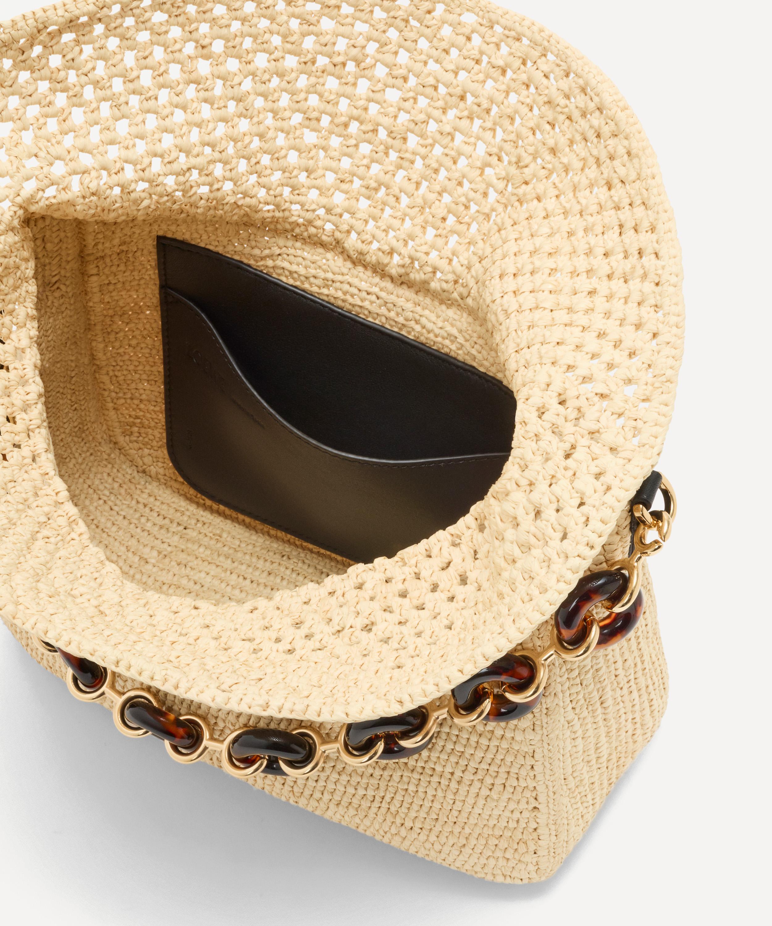 Crafted from raffia and calfskin leather, this bag showcases a curved design with a flowing flap closure, equipped with an internal pocket for valuables, and a signature tortoise donut chain. Finished with an engraved Anagram, it can be worn over the shoulder, cross-body or carried by hand - perfect for toting all your daily essentials in true Loewe style.