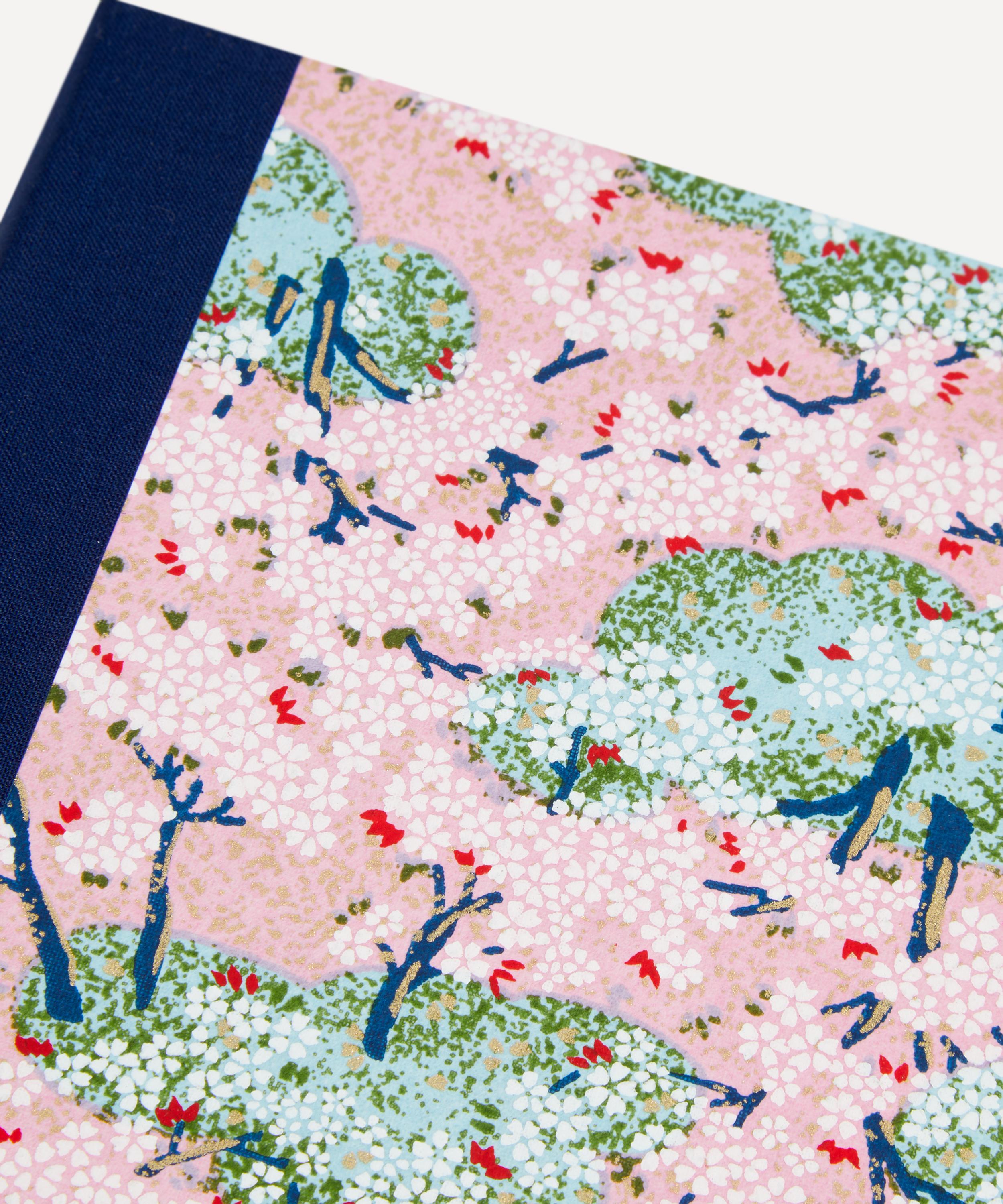 Store precious memories this charming photo album from Esmie - bound by hand, it features 30 off-white leaves overlaid with glassine to protect your beloved photographs. The front is adorned with blossom trees with deep indigo branches, covered in white blossom with vermillion red accent petals, reminiscent of spring in Kyoto.
