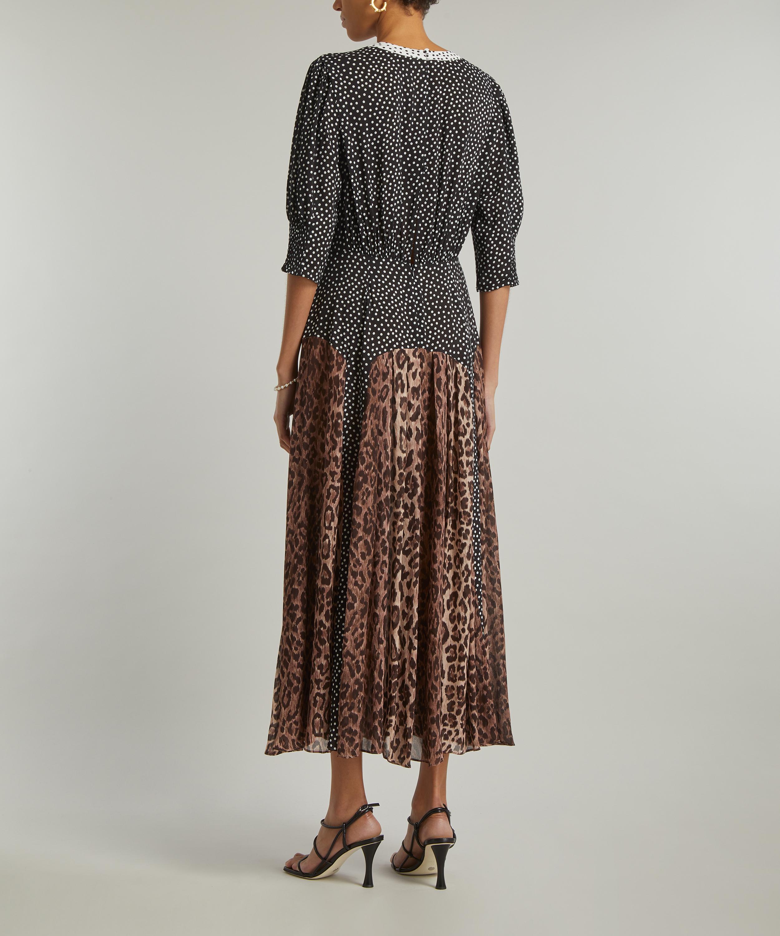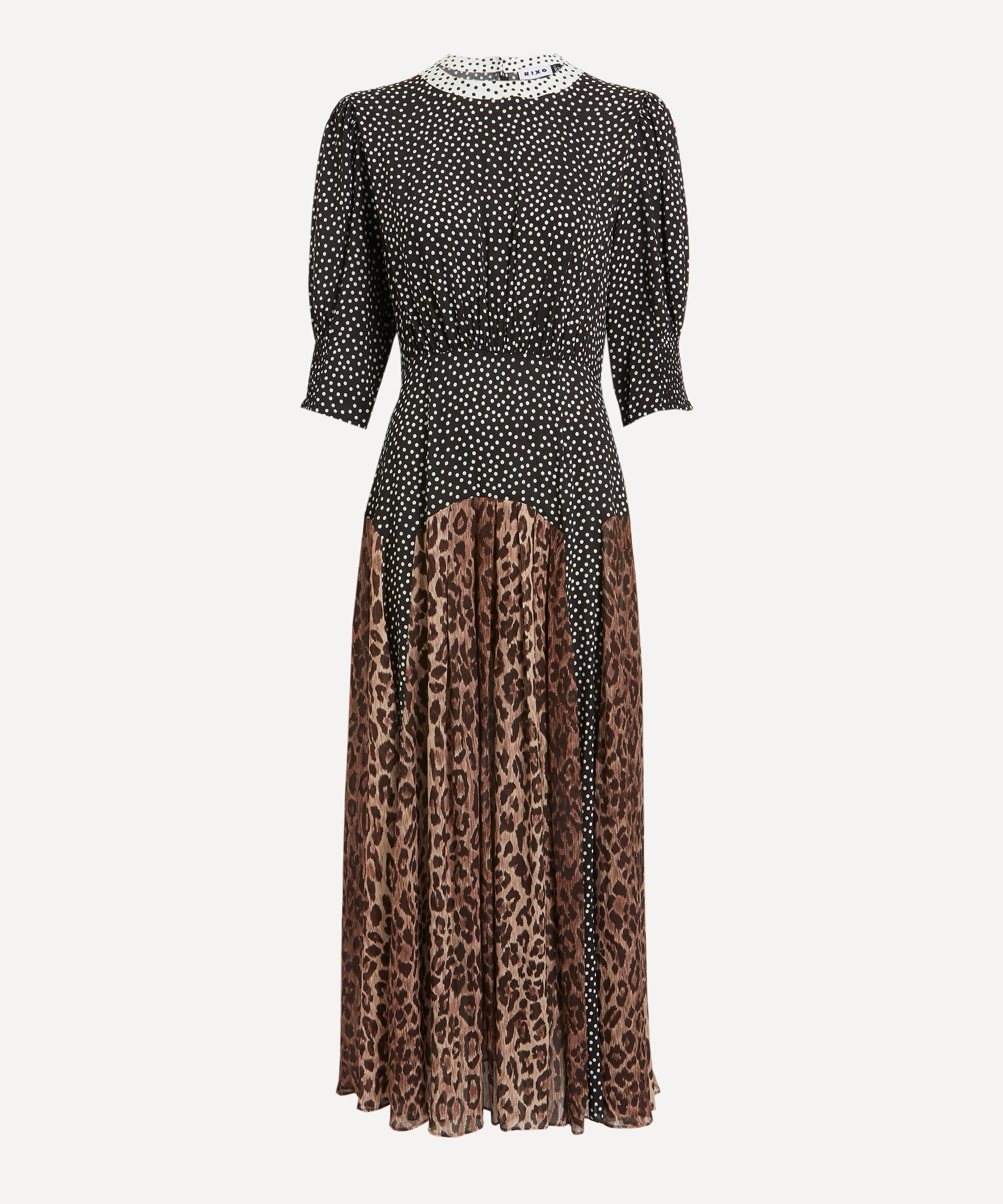 In a retro-infused leopard and polka-dot print, the Meg Dress from RIXO embraces the brand’s contemporary take on classic silhouettes.