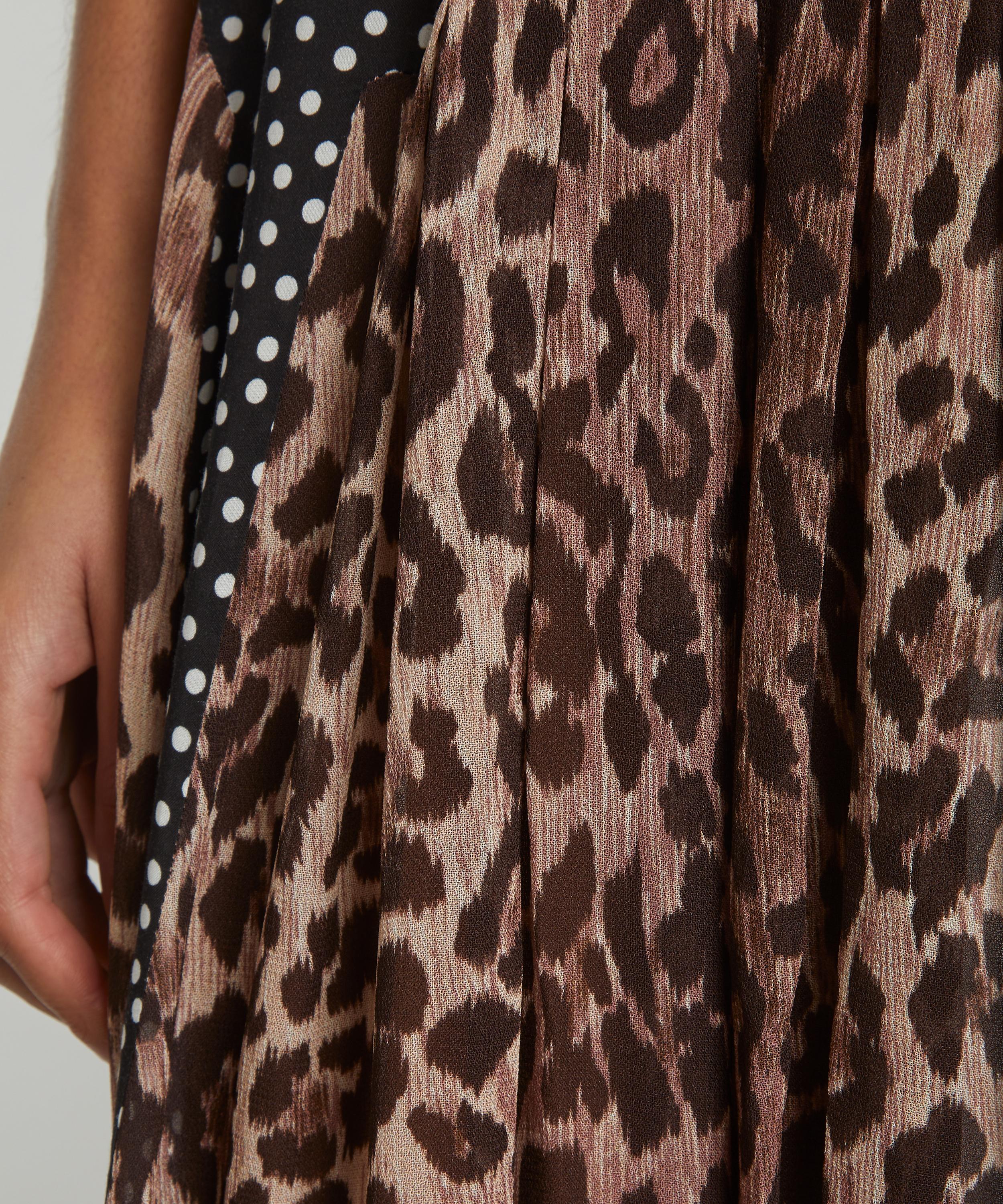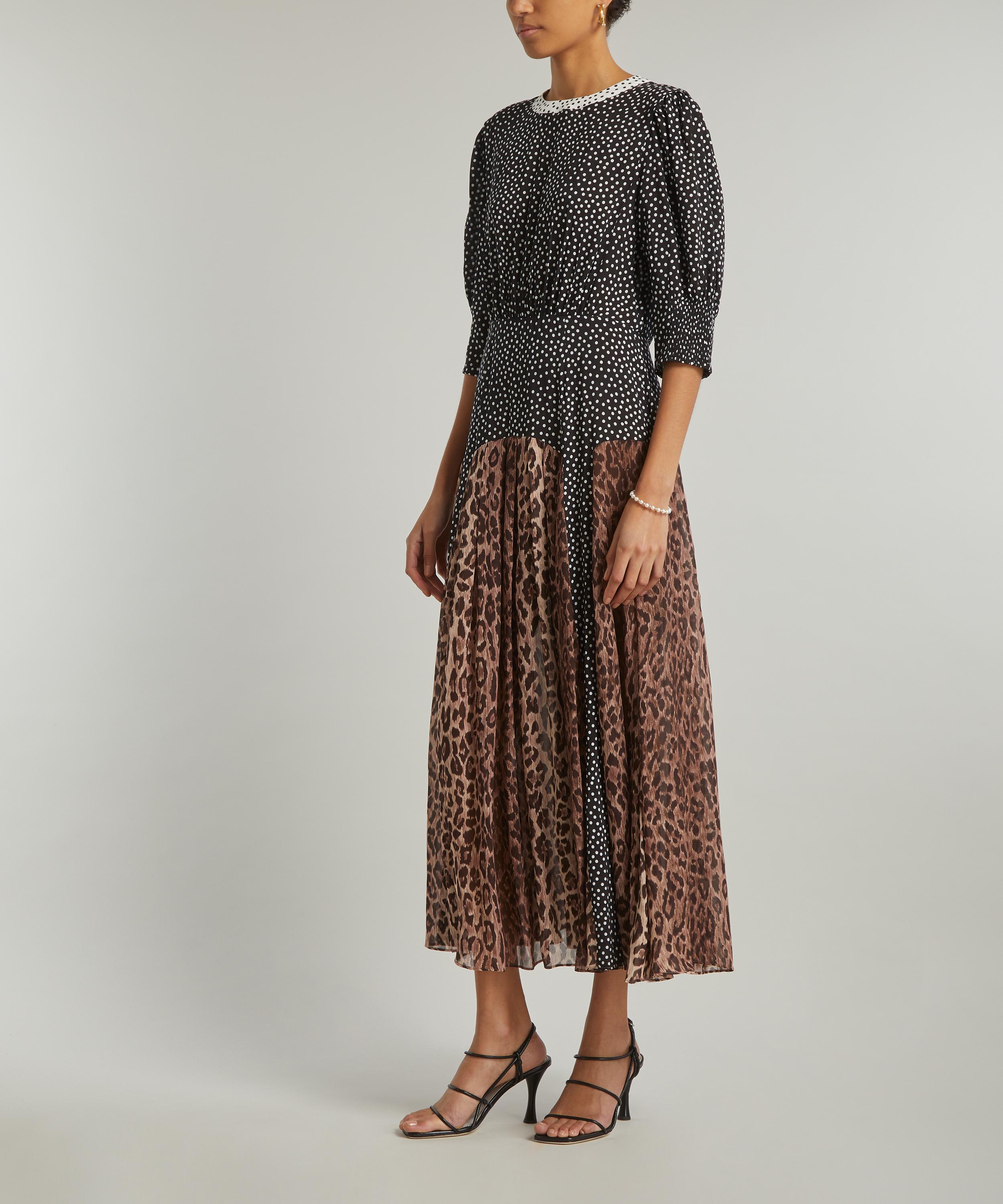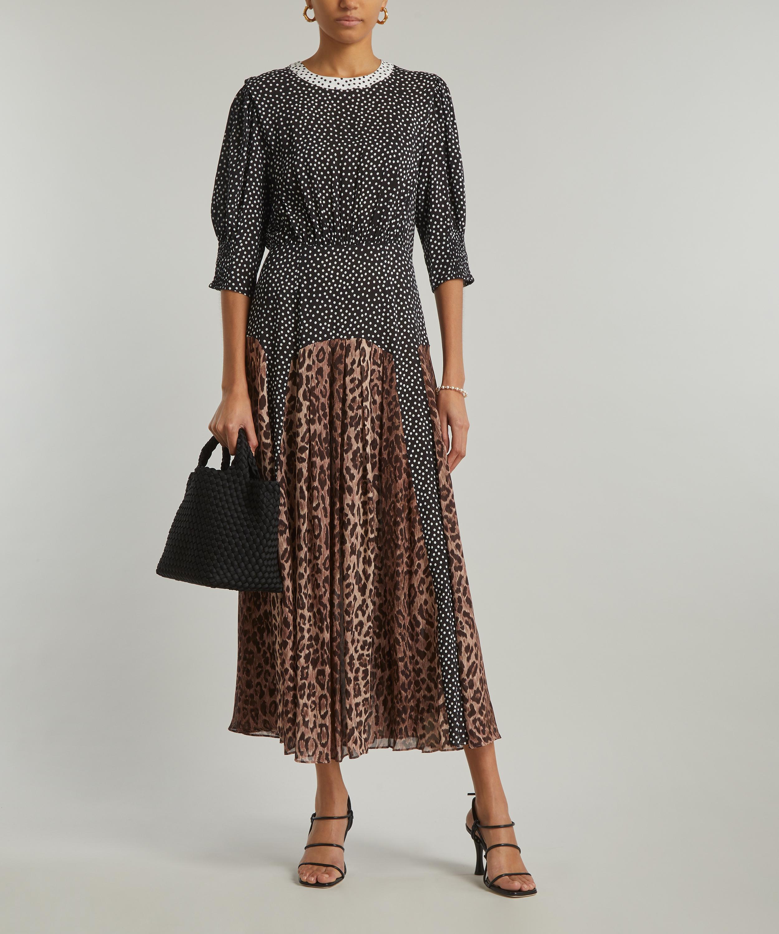 Crafted from crepe, the Meg is an elegant round-neck dress with a blousy body, gently puffed sleeves, and a pleated godet skirt. Adding a dainty dose of vintage flair to your new season edit with its mixed leopard and polka-dot print ,you’ll want to wear this timeless piece for years to come.