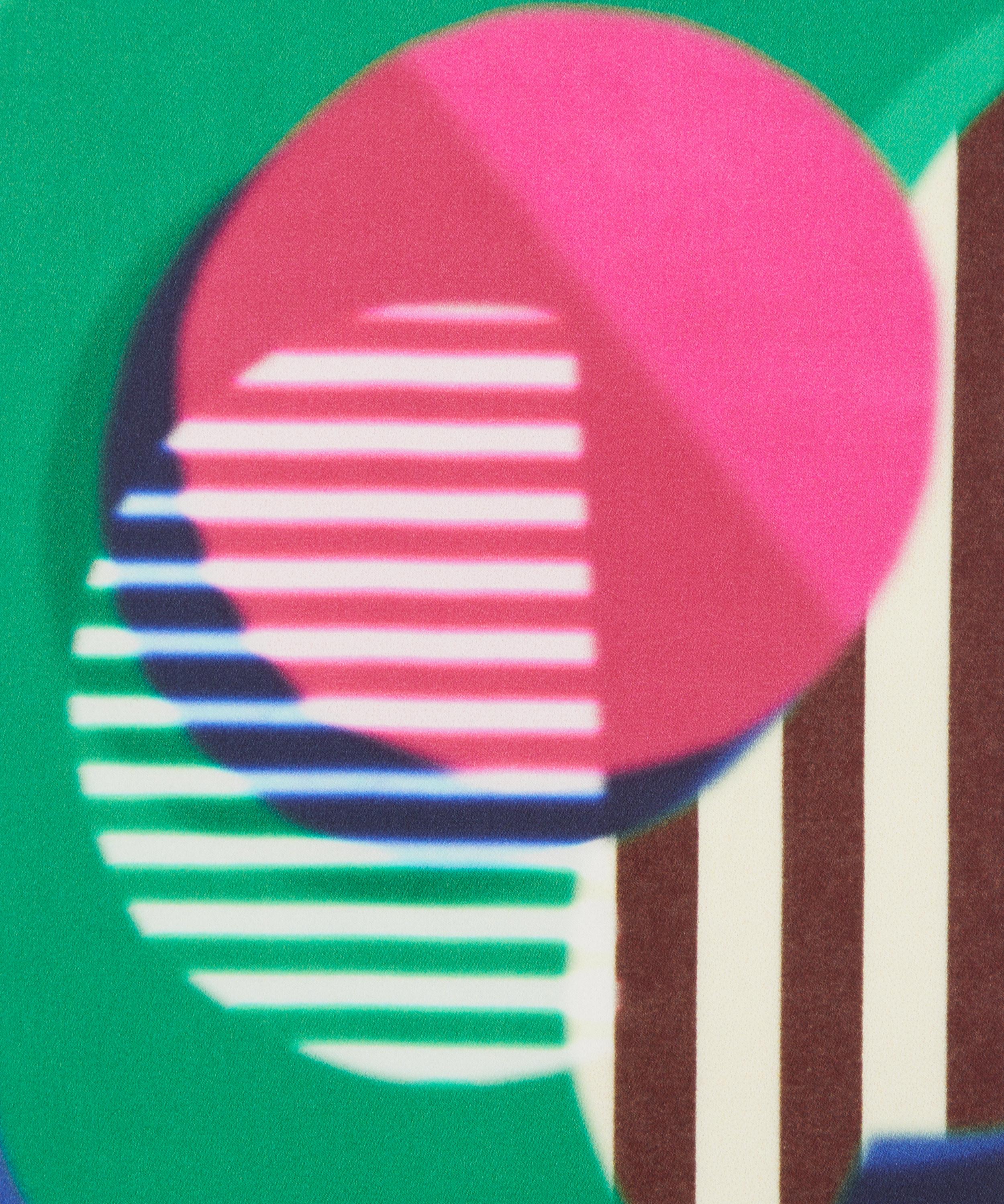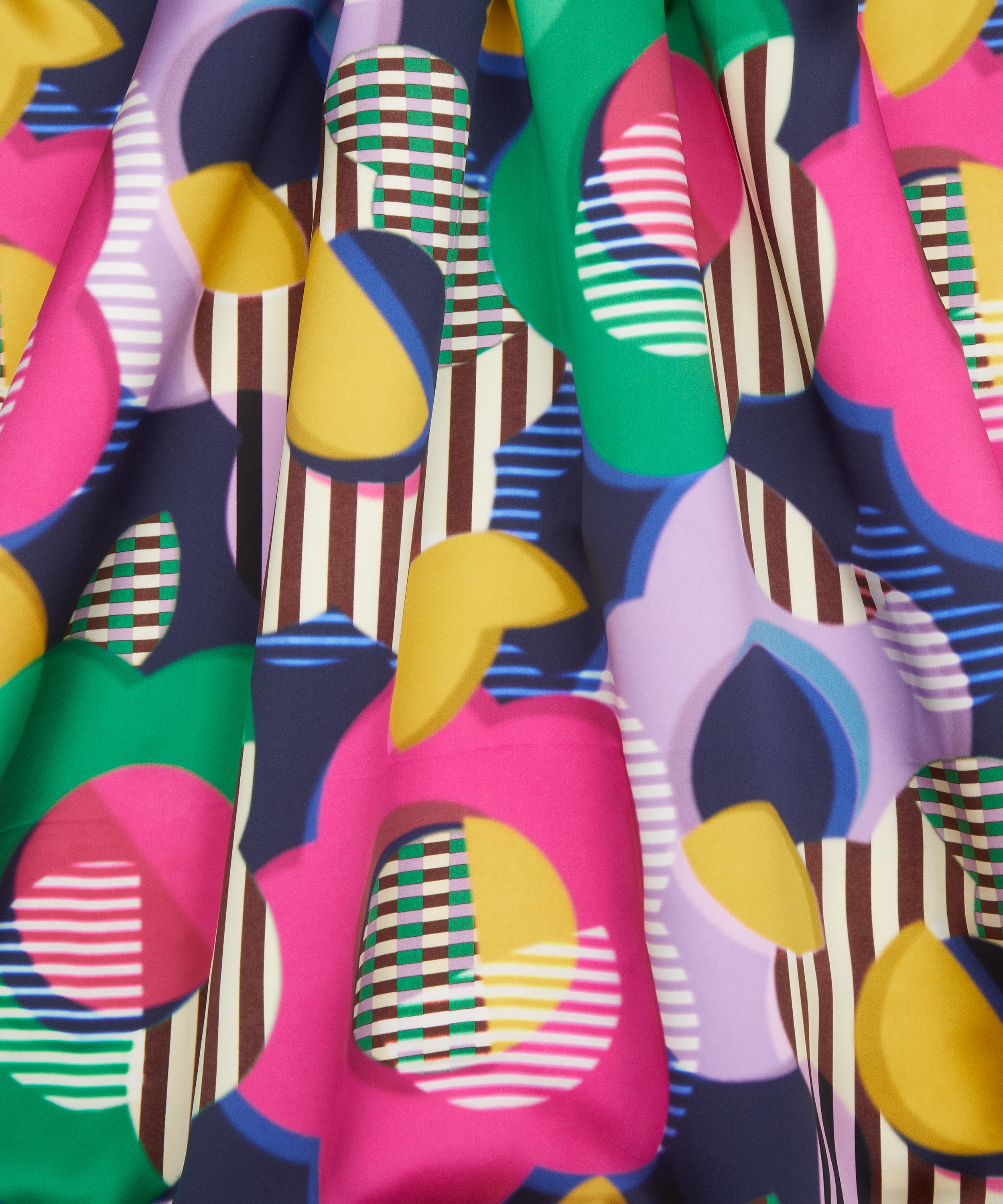 In 1983, Liberty showcased its avant-garde spirit by hosting an exhibition of the radical design group, Memphis Milano. Inspired by the group’s hallmarks of playful, sculptural forms and optical, clashing patterns, Memphis stands out as a visually arresting design brimming with dazzling vitality. Spherical daisies cast soft overlapping shadows, while graphic cutouts dance amidst contrasting stripes, captivating the eye with a riot of illusory geometries. This print is part of the anniversary collection’s final chapter, Collectibles. Offering a design for each decade, this timeline of hero prints encapsulates 150 years - exploring the design house’s varied and influential handwriting while honouring key moments of creativity and discovery.