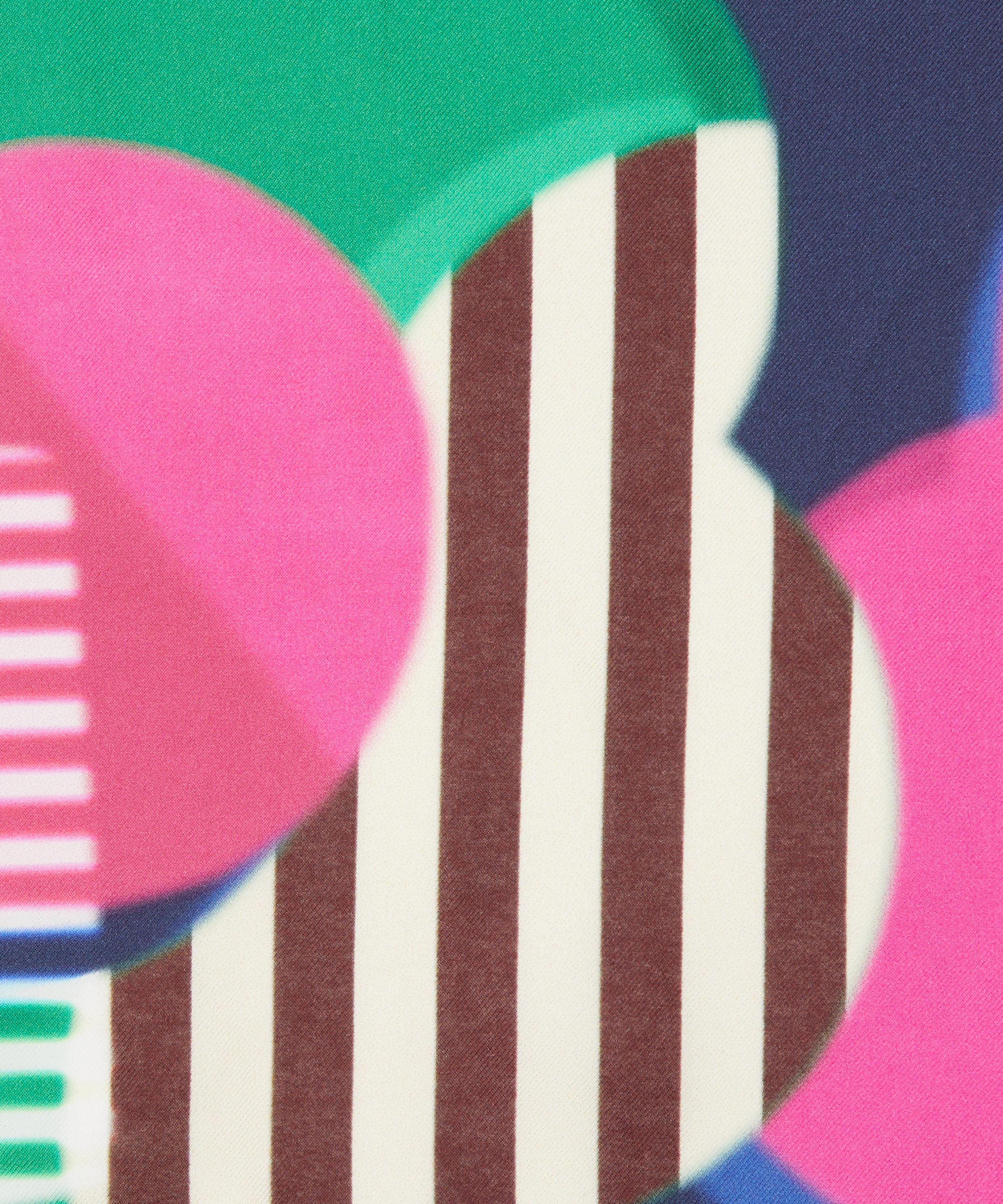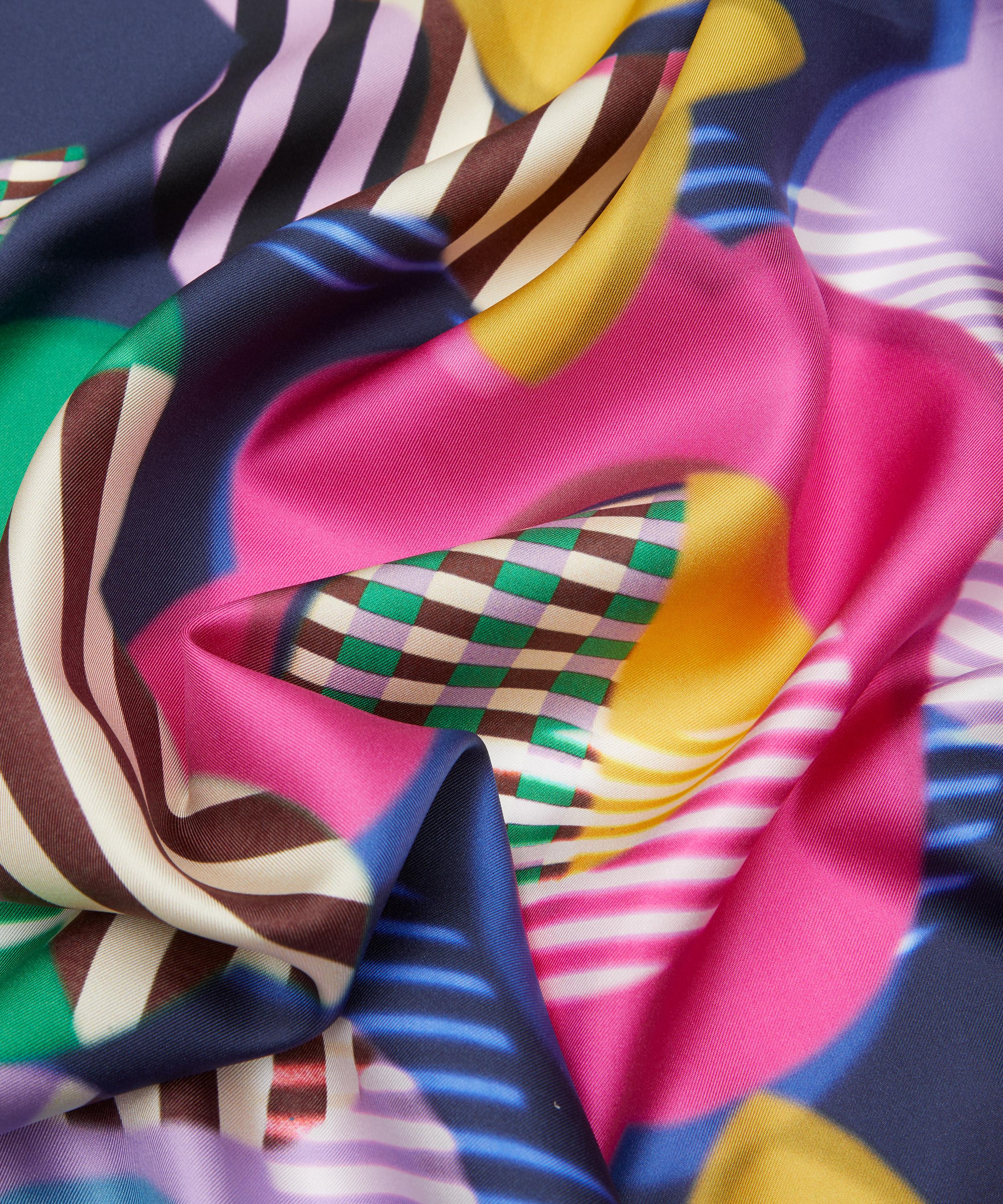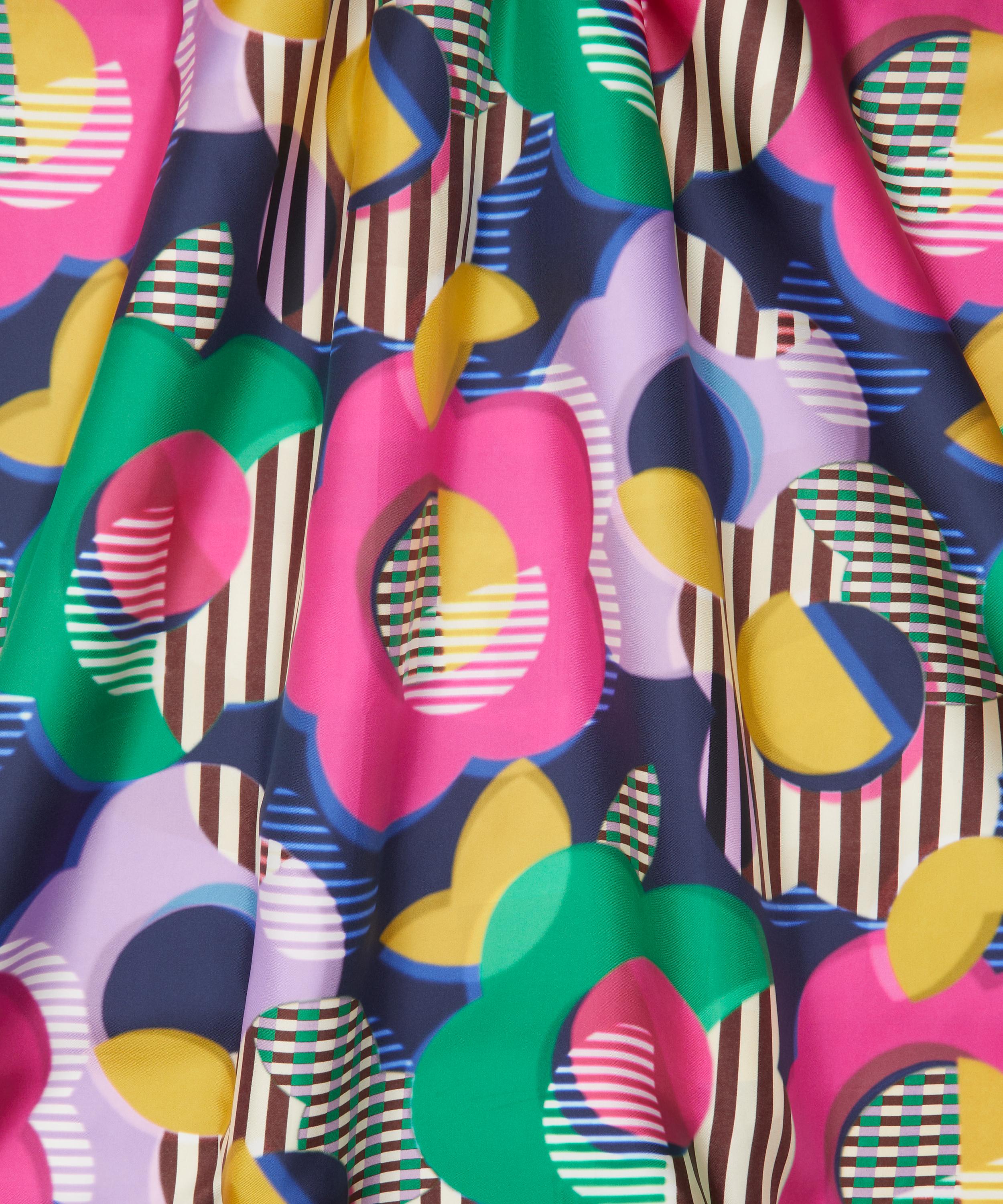 In 1983, Liberty showcased its avant-garde spirit by hosting an exhibition of the radical design group, Memphis Milano. Inspired by the group’s hallmarks of playful, sculptural forms and optical, clashing patterns, Memphis stands out as a visually arresting design brimming with dazzling vitality. Spherical daisies cast soft overlapping shadows, while graphic cutouts dance amidst contrasting stripes, captivating the eye with a riot of illusory geometries. This print is part of the anniversary collection’s final chapter, Collectibles. Offering a design for each decade, this timeline of hero prints encapsulates 150 years - exploring the design house’s varied and influential handwriting while honouring key moments of creativity and discovery.