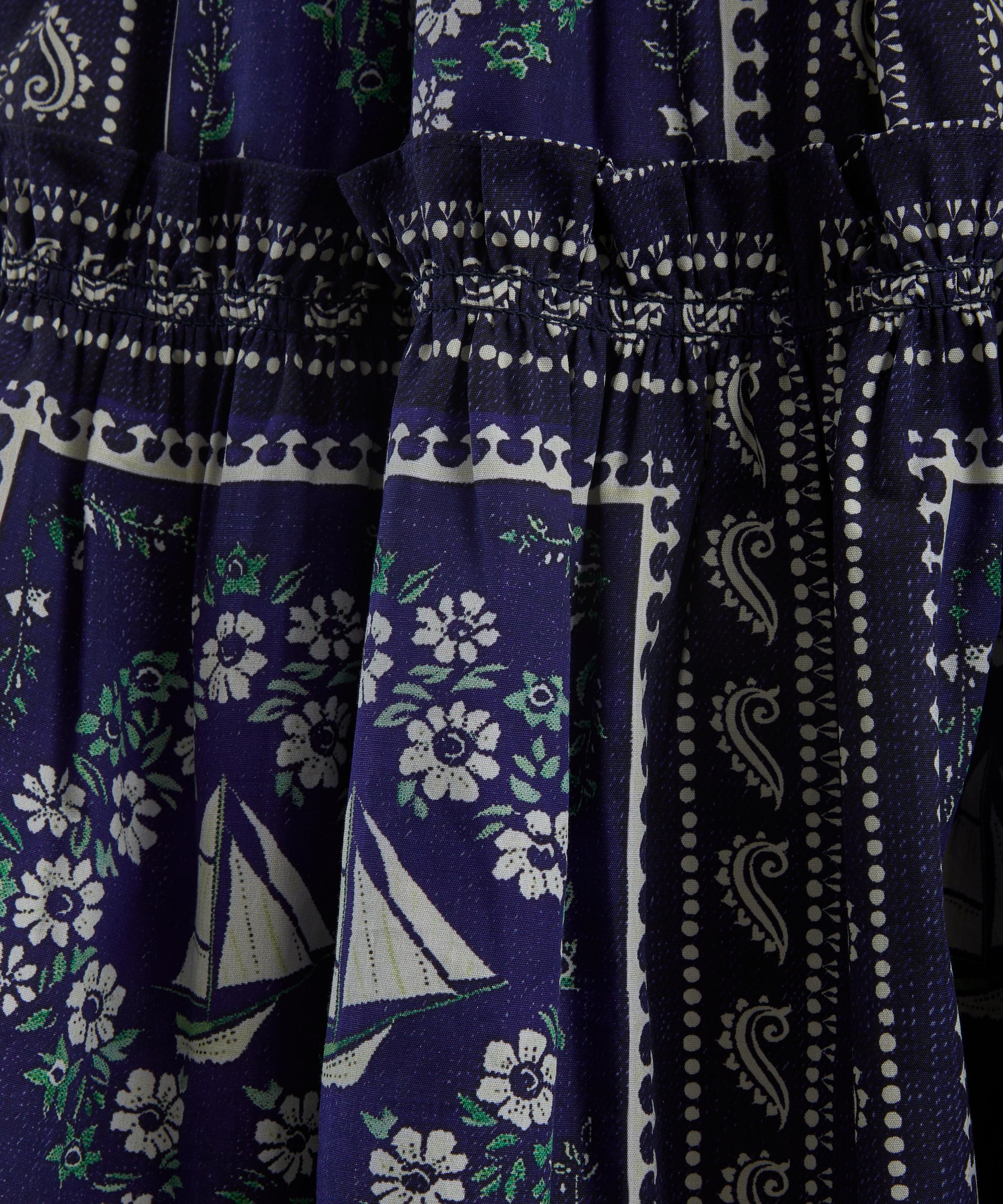 Defined by its breezy silhouette, delicate ruffle detailing, and a tiered bodice, the Merritt Swing dress embodies thoughtful design. Crafted from cotton poplin adorned with the nautical-inspired Bon Voyage print, its short flutter sleeves add an airy feel to this standout piece.