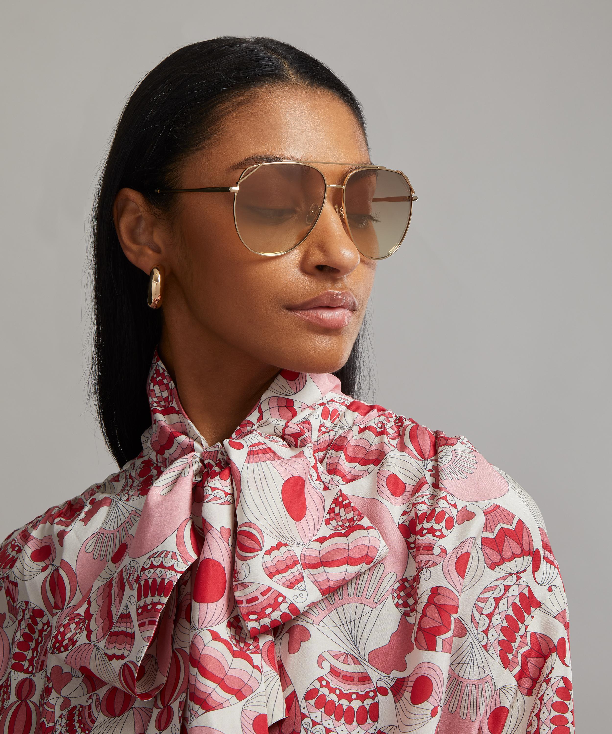 Crafted in Italy from gold-tone metal, these sunglasses feature a sleek aviator frame with gradient tinted lenses and adjustable nose pads. The bridge is enhanced with V-shaped detailing for a distinctive finish, while the acetate temple tips are heat-moulded for a comfortable fit. Designed to style seamlessly with any outfit, wear them with muted separates or clashing prints for an equally sleek finish.