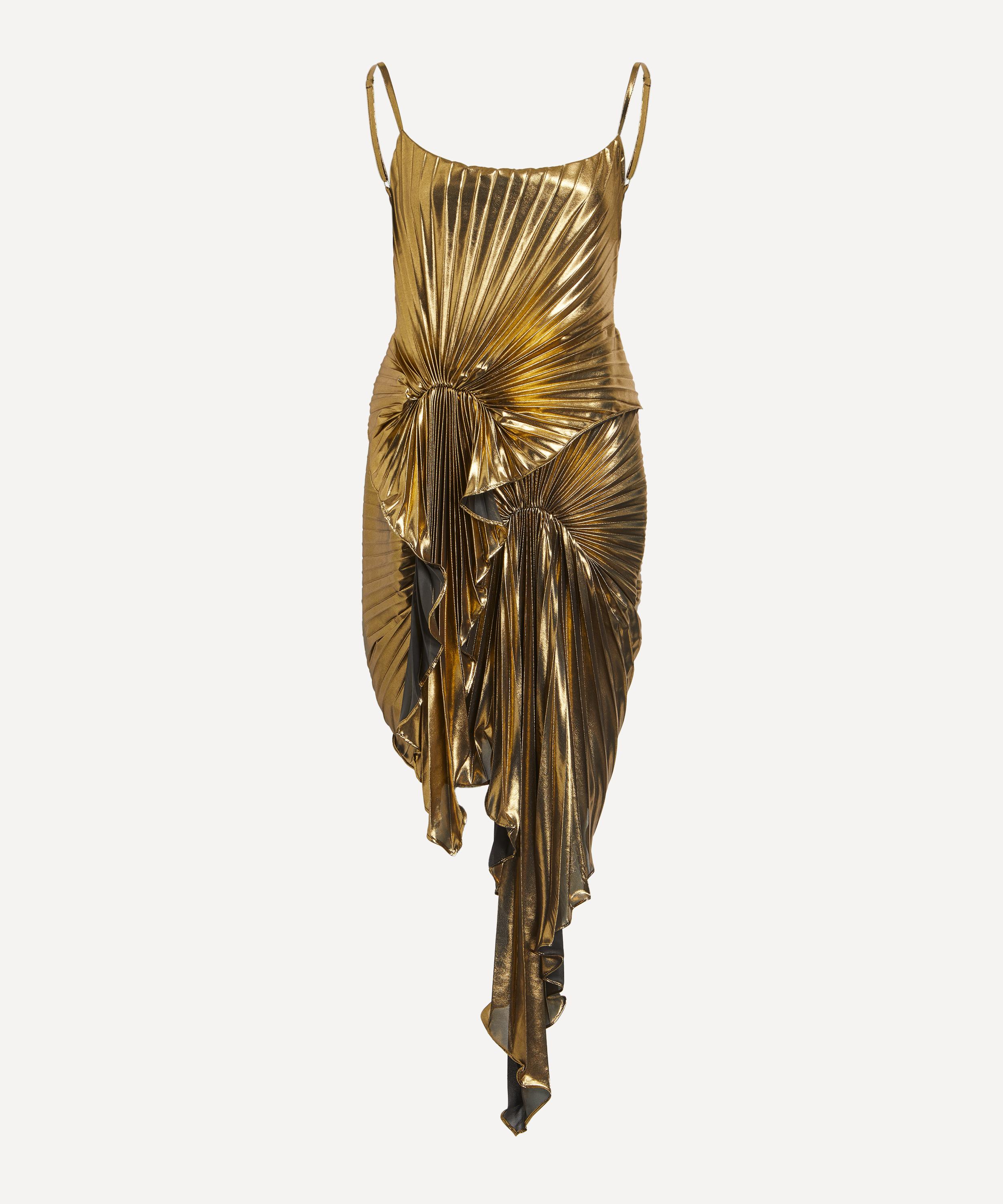 The Metallic Gold Torrent Dress by Georgia Hardinge exemplifies the brand’s signature sculptural aesthetic.