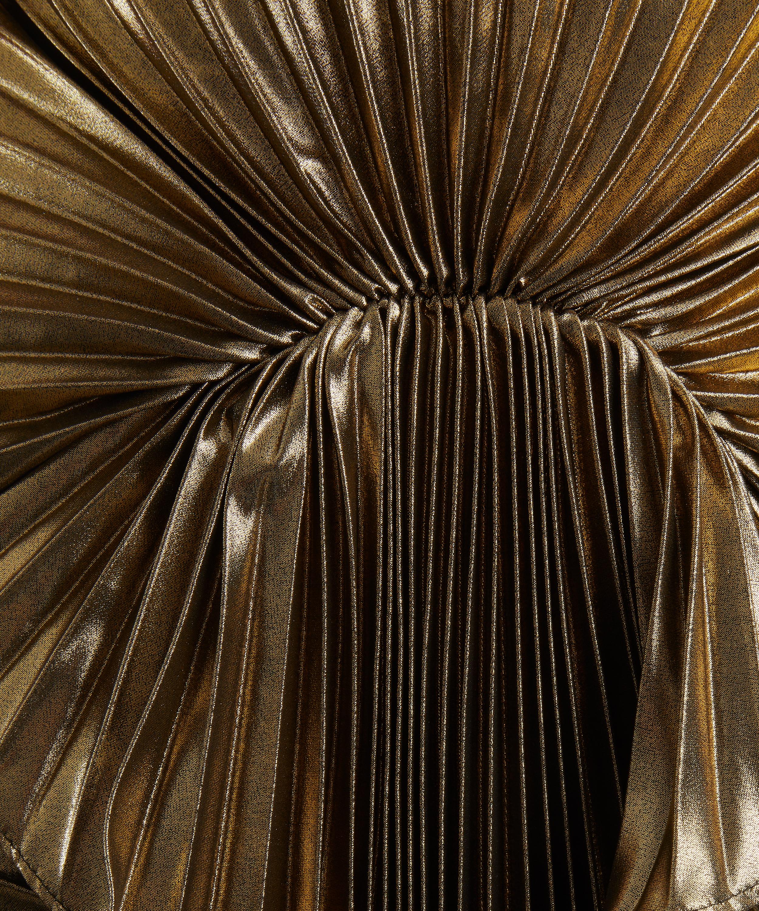 A bold expression of modern elegance, this metallic mid-length dress is defined by delicate pleating that flows in a waterfall design, enhanced by artful gathering throughout. An open neckline with adjustable straps adds a touch of allure, while the slip-on style and waist tie effortlessly sculpt a flattering silhouette.