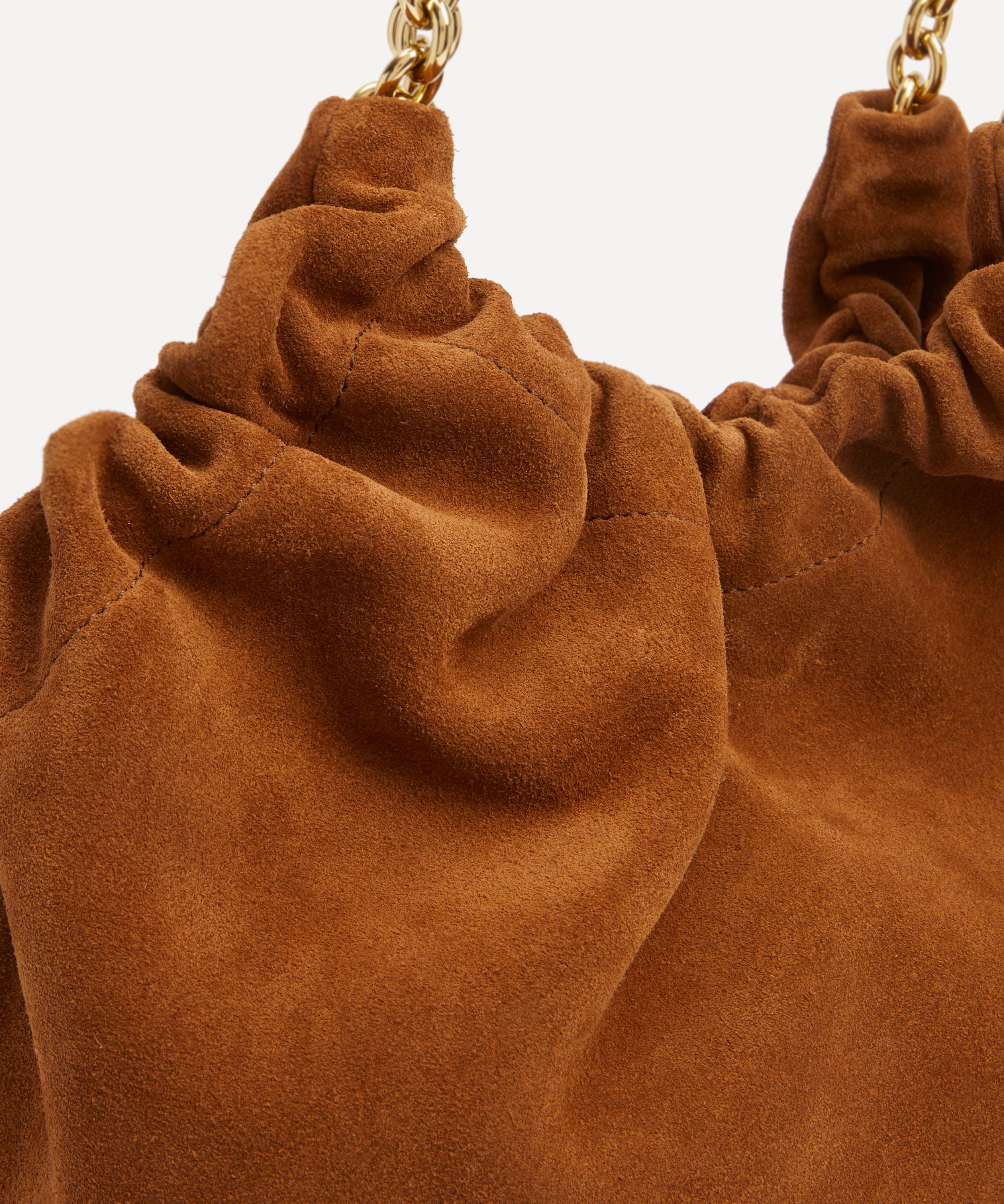 Boasting a relaxed, slouchy silhouette, it is handcrafted by artisans from soft Italian suede and covered with a bold leopard print. Imbued with textural ruched details, it features chunky gold-plated chain hardware with two leather straps. The spacious cotton-lined interior is finished with a central pocket, a zip pocket, and a secure magnetic closure.