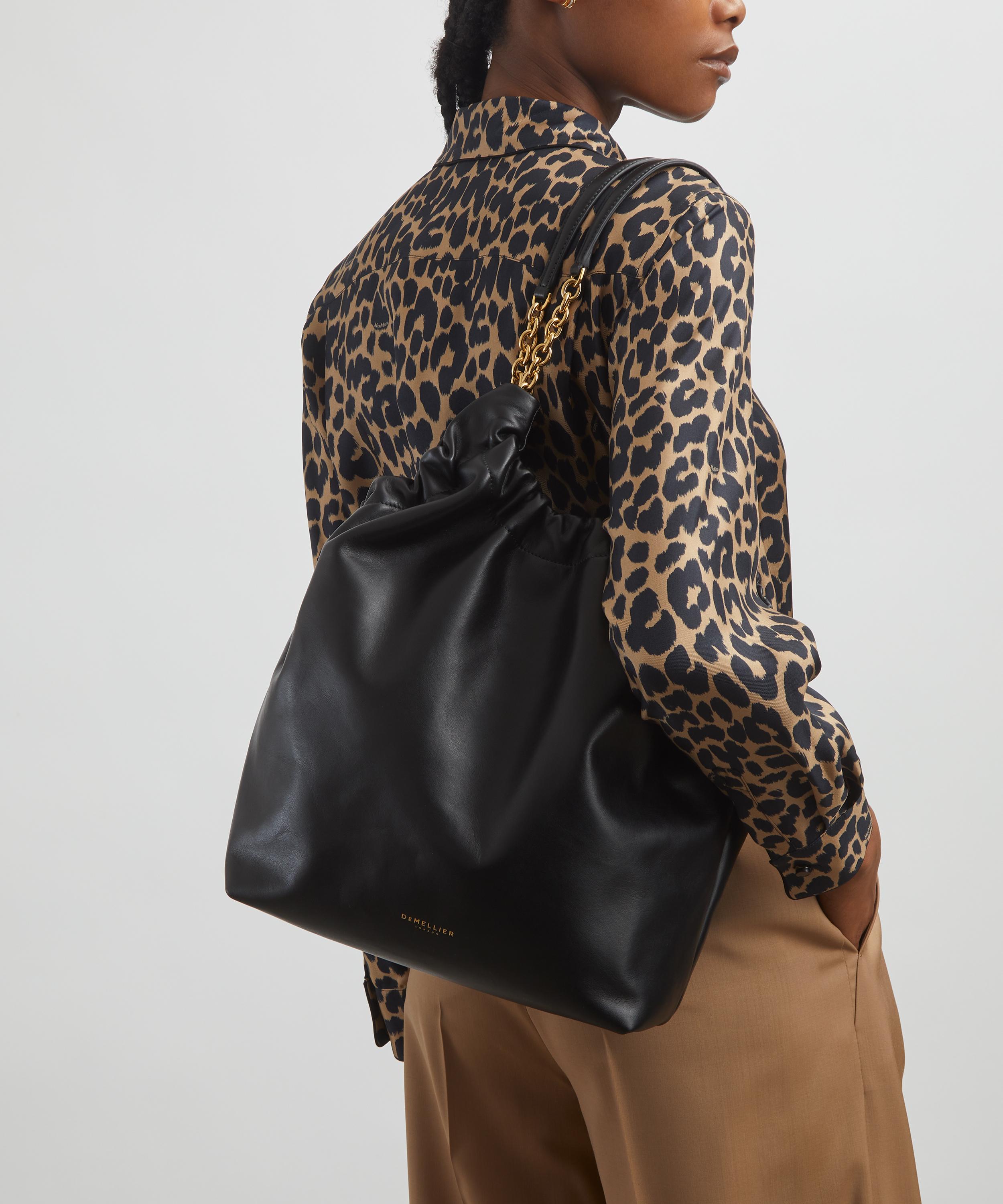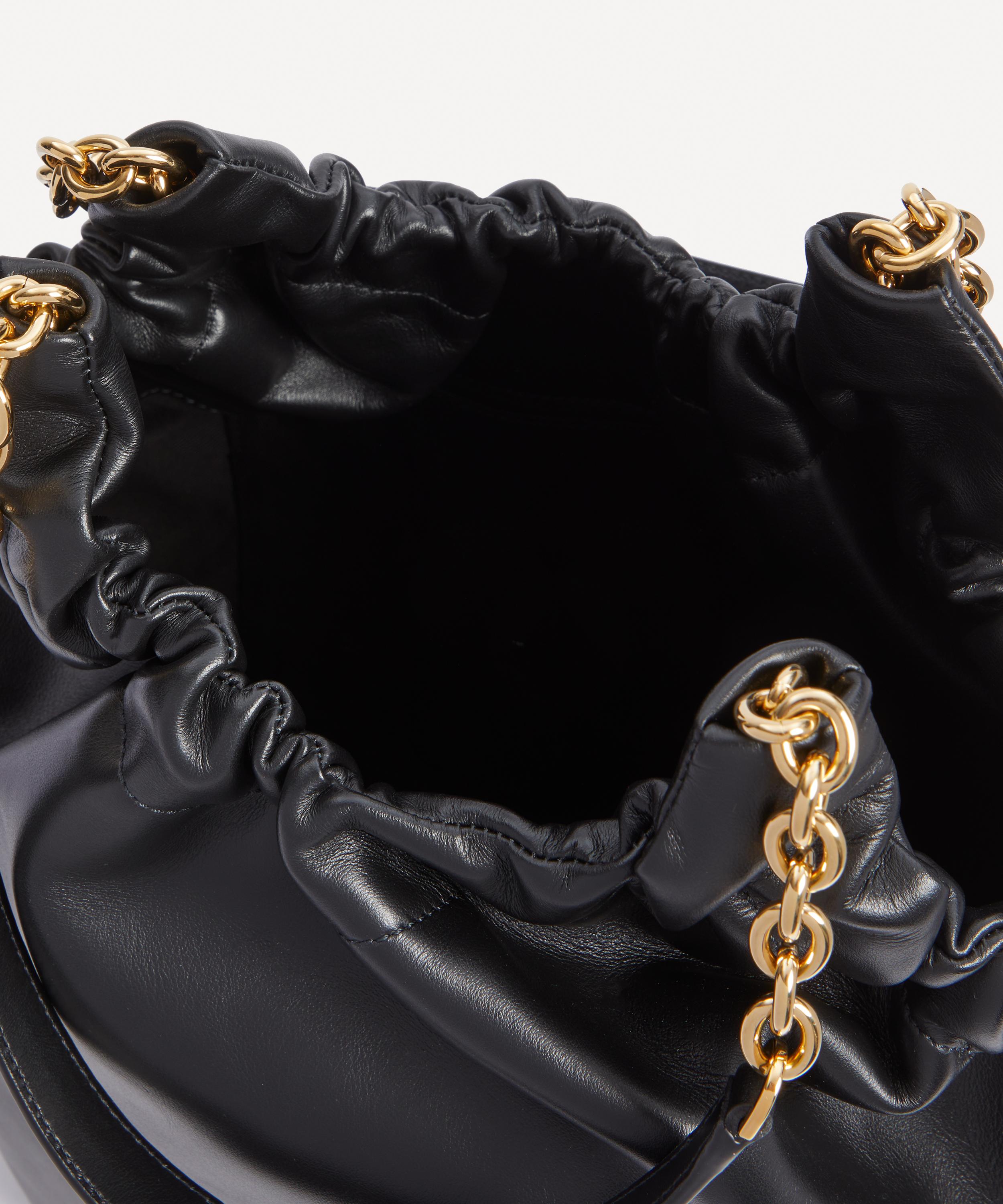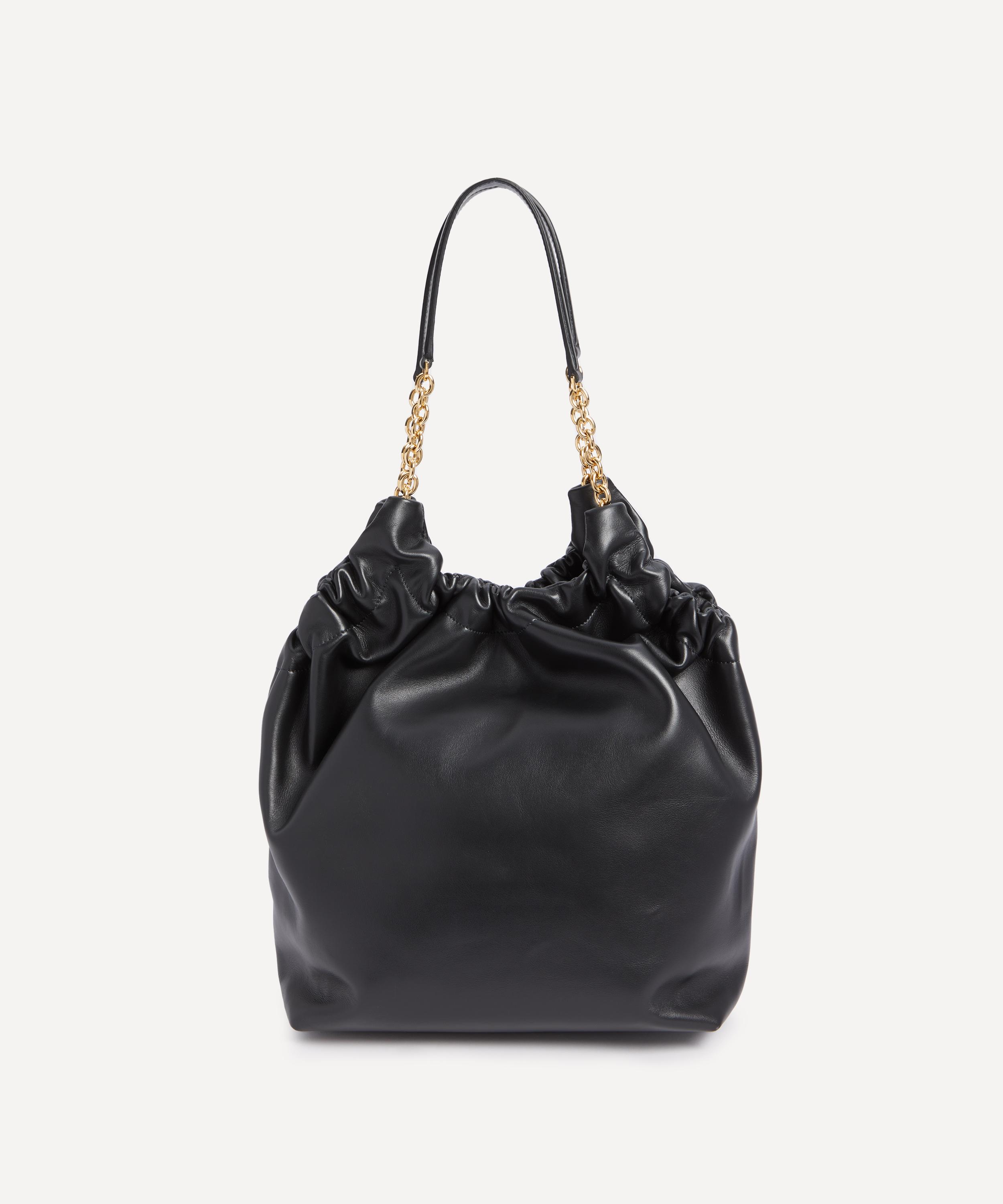 Showcasing a modern yet timeless slouchy silhouette with its ruched details across the top, its elegant gold-tone chain top-handles easily swing under your shoulder. The perfect size to carry all your essentials, its roomy interior includes an internal magnet closure as well as a zip pocket.