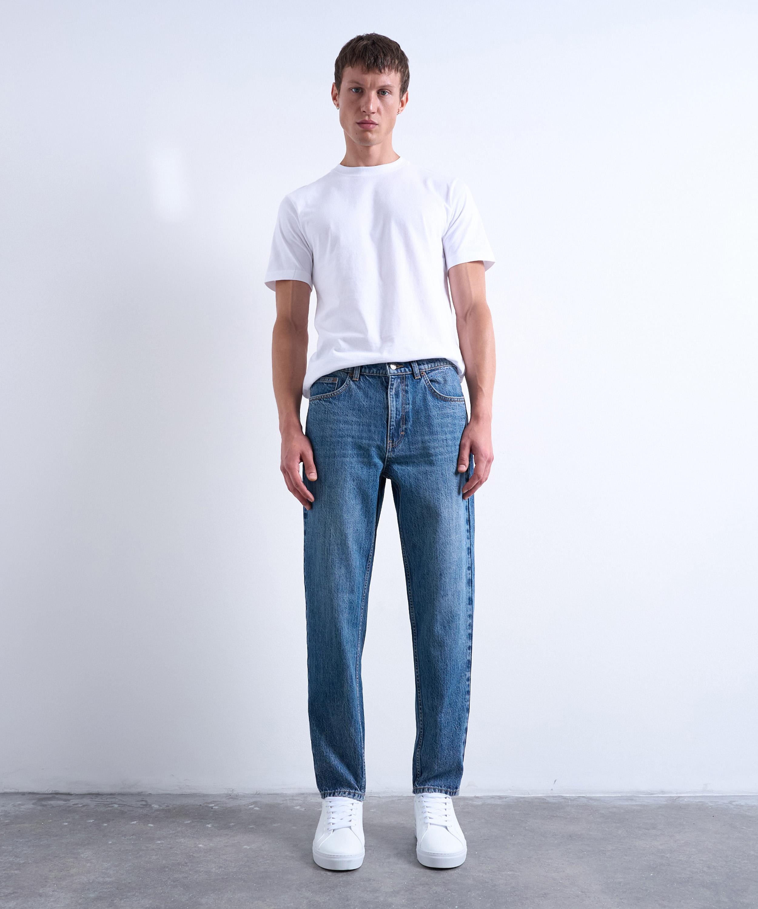 Crafted from non-stretch denim in a versatile mid-blue wash, these jeans are cut to a tapered leg that finishes at the ankle. Staying true to a classic silhouette, they feature five pockets, belt loops, and a concealed fly.