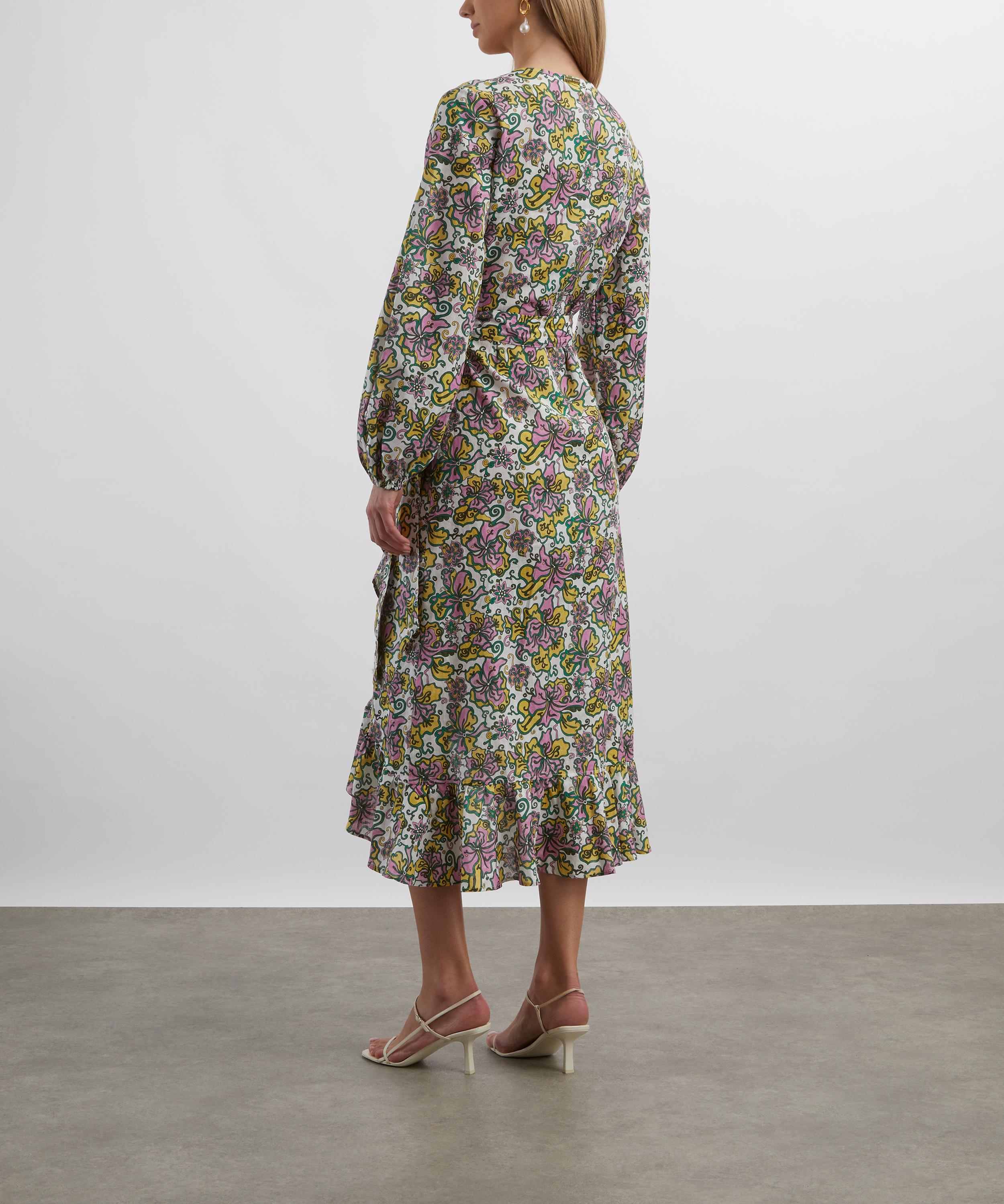 Crafted from a lightweight linen and cotton blend adorned with Liberty Fabrics' vibrant Kings Road print, the Midi Wrap Dress is a romantic and versatile choice for any occasion. Effortlessly chic and comfortable, it features a flattering wrap silhouette with an adjustable waist tie to create the perfect fit.