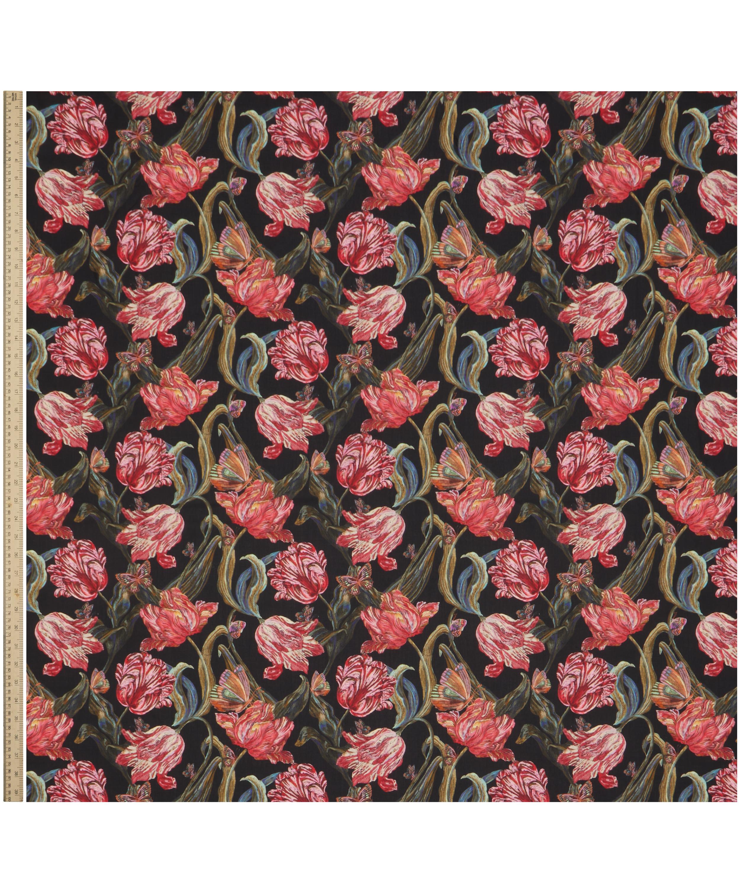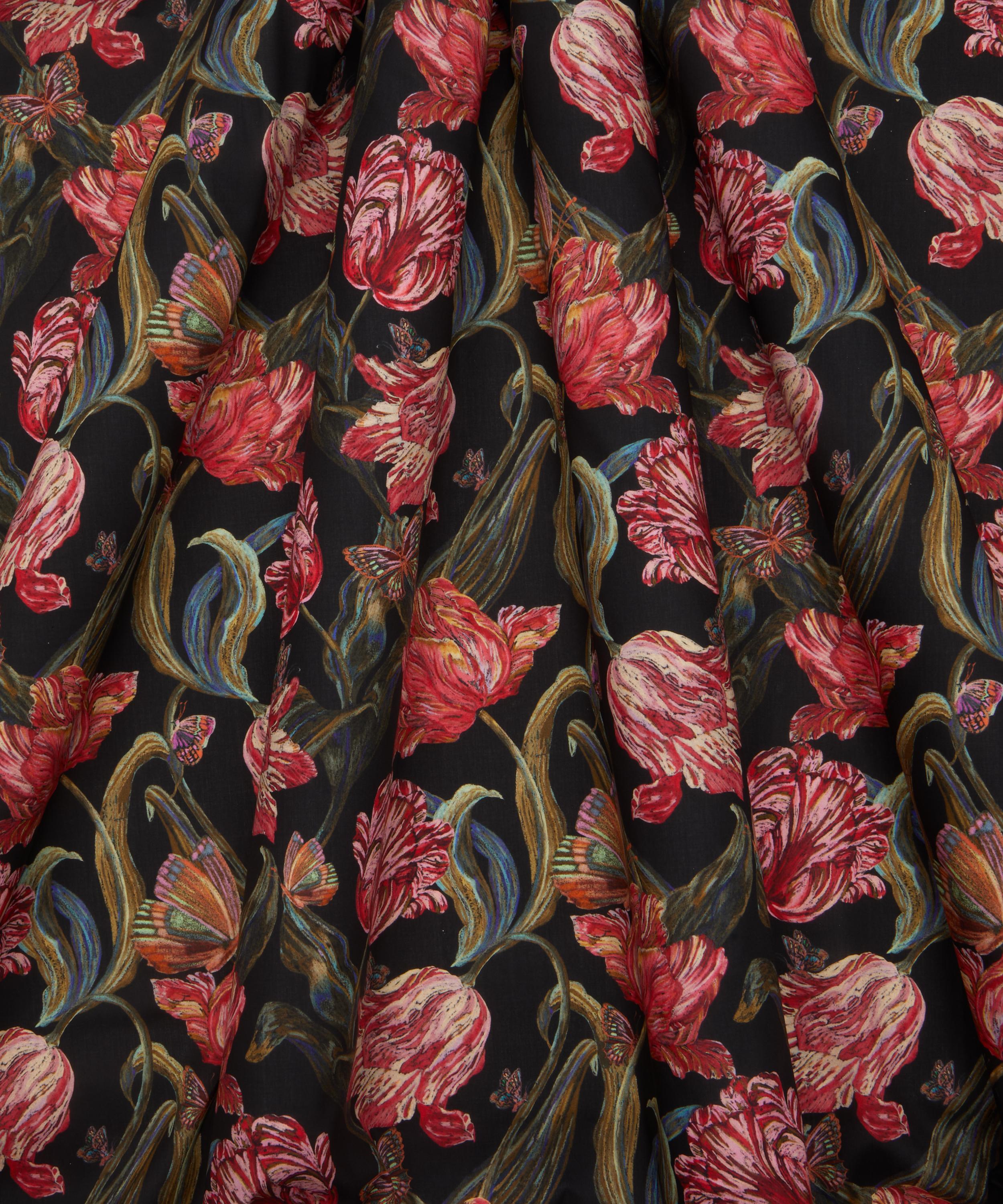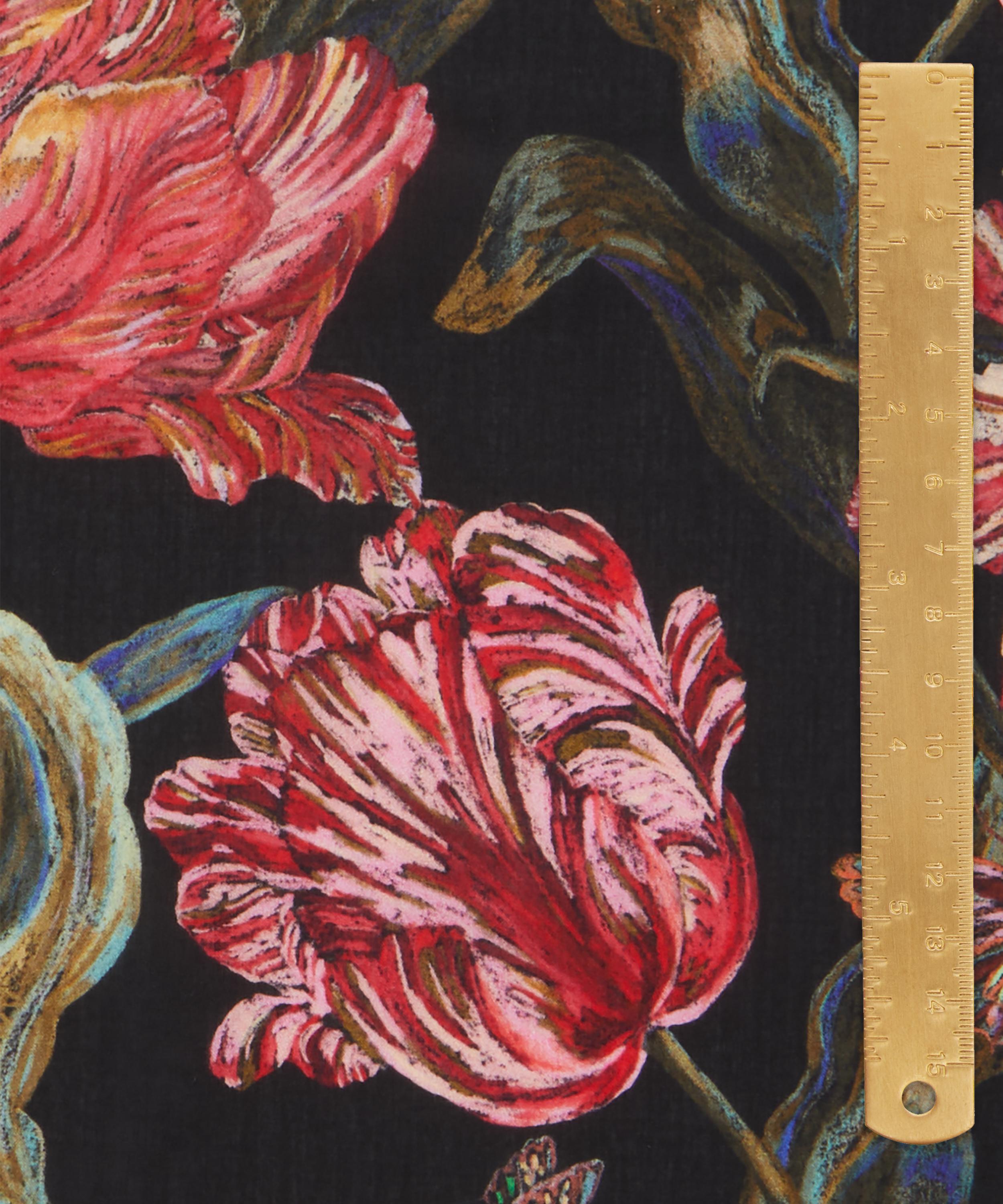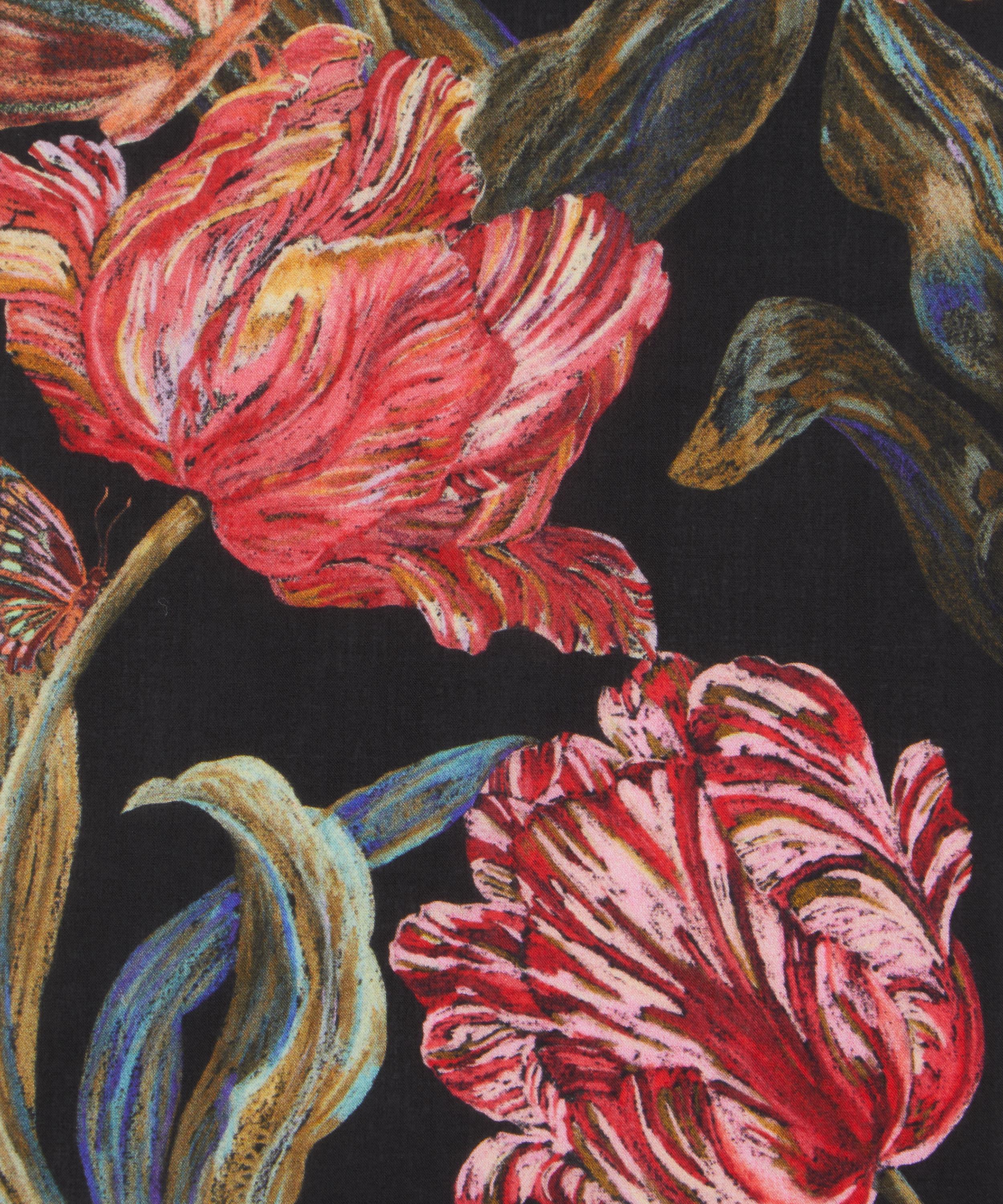 Focusing on a single variety of flower, the tulip, and exploring the many diverse patterns created in its petals, this design was drawn in soft pencil crayon on black paper to create texture and depth. This print is part of the Floral Library narrative of the AW24 collection, which studies the subject through the Botanist’s eye, cataloguing and exploring an assortment of species as well as a being a celebration of key florals throughout Liberty’s history.