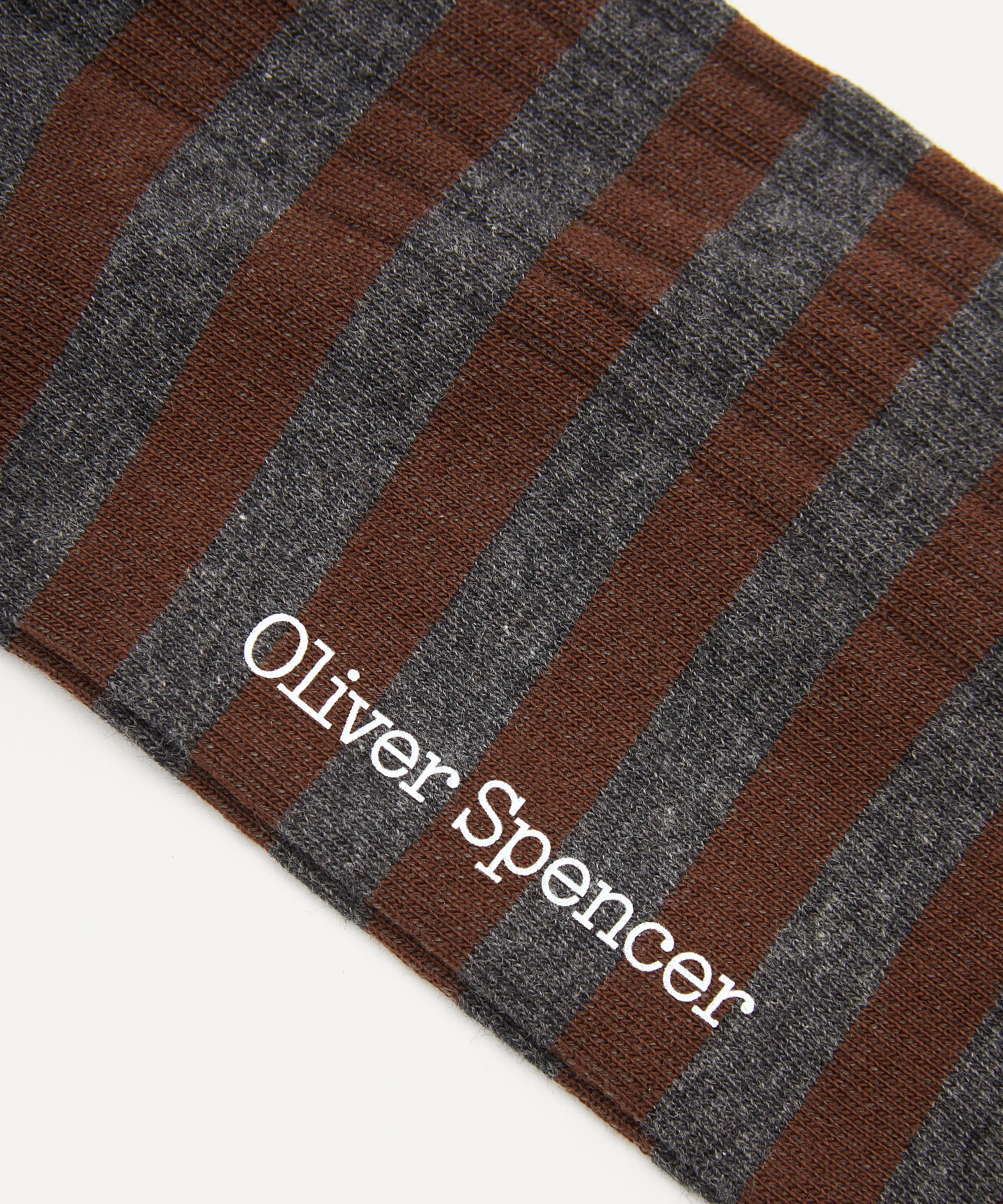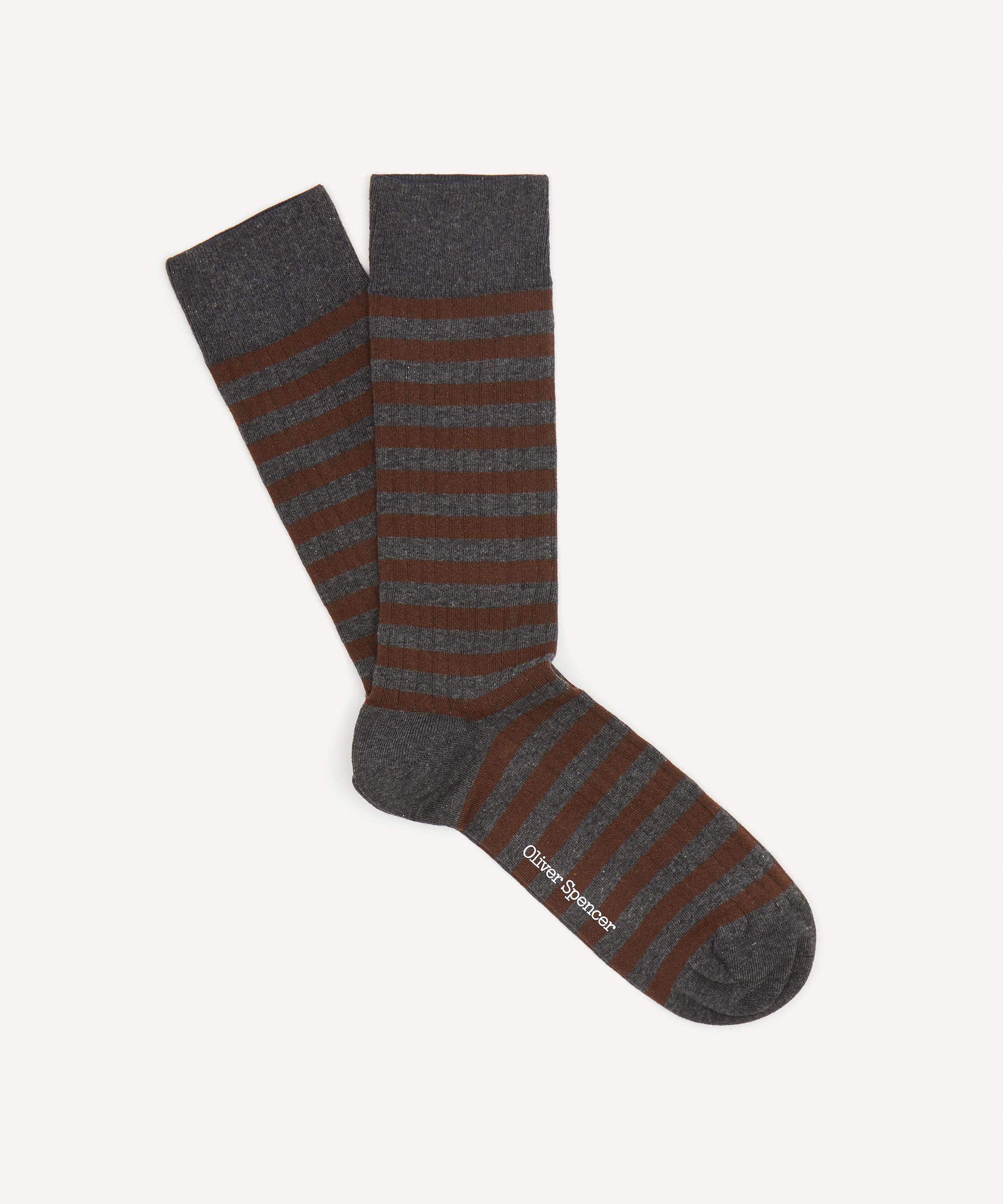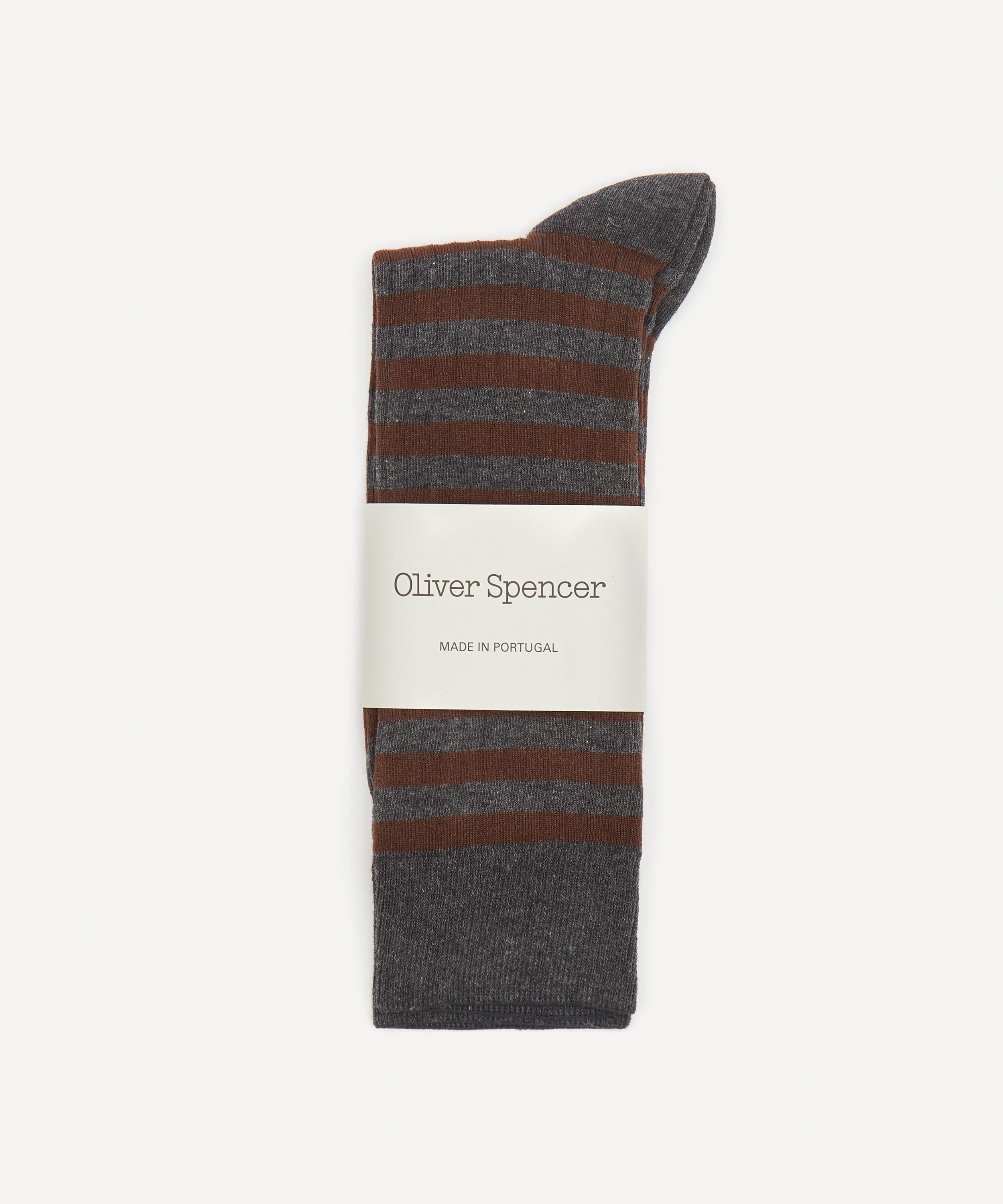 Featuring classic stripes throughout, this ribbed, cotton-rich pair from Oliver Spencer will make a stylish and comfortable addition to your sock drawer. They’re made with a touch of stretch and ribbed trims for a secure fit and are finished with a printed logo on the sole.