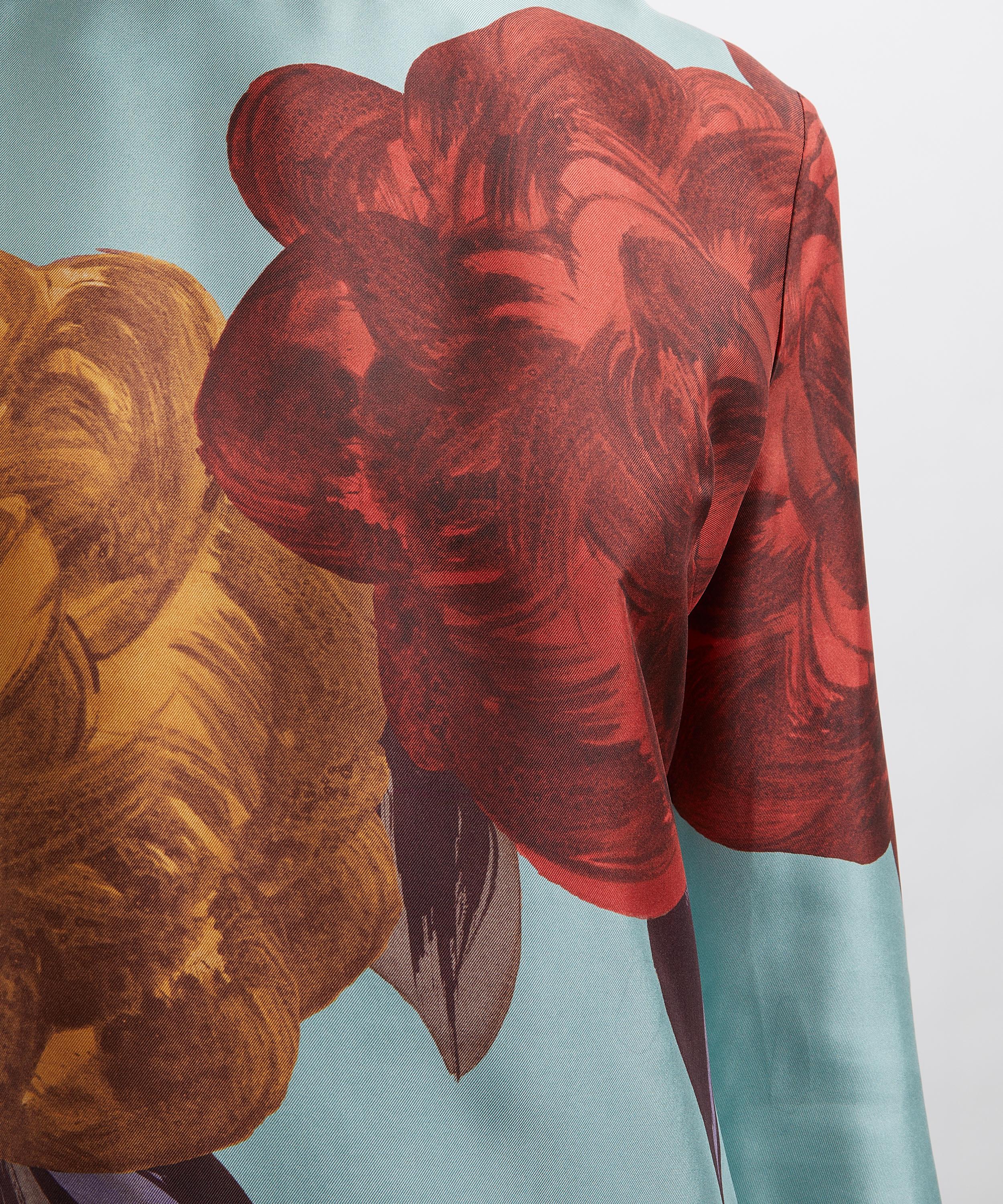 Masterfully crafted in Italy from pure silk twill, this chic cocktail dress flatters with its long fluted sleeves and thigh-skimming silhouette, while the hand-placed Peony print brings striking impact to an otherwise demure design.