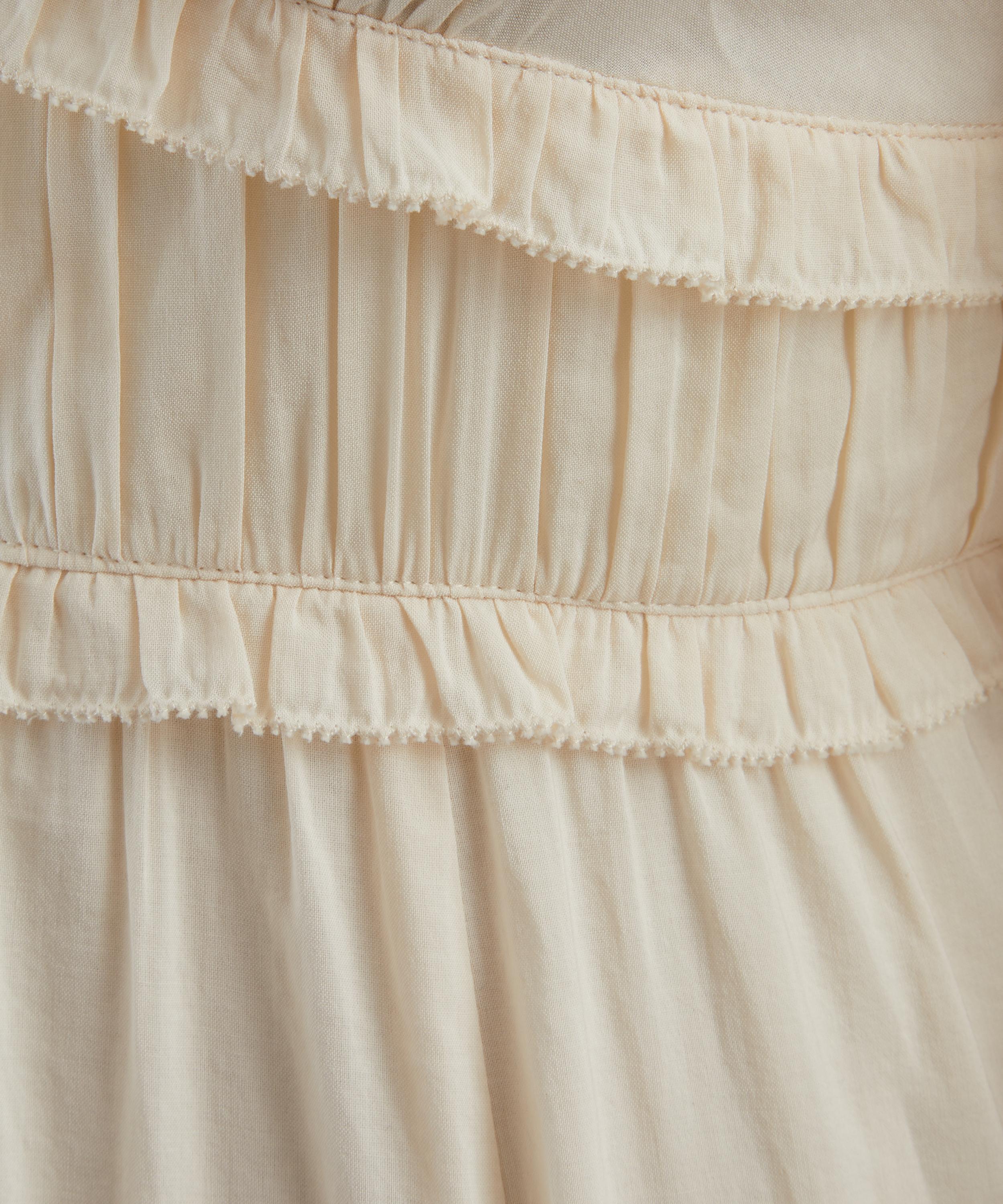Crafted from a lightweight voile fabric, the Mireille dress exudes effortless elegance. Designed with a V-neckline, short puffed sleeves, and a fitted bodice, its ruffle-embellished empire waist falls into a softly swaying A-line skirt for a romantic, feminine silhouette.