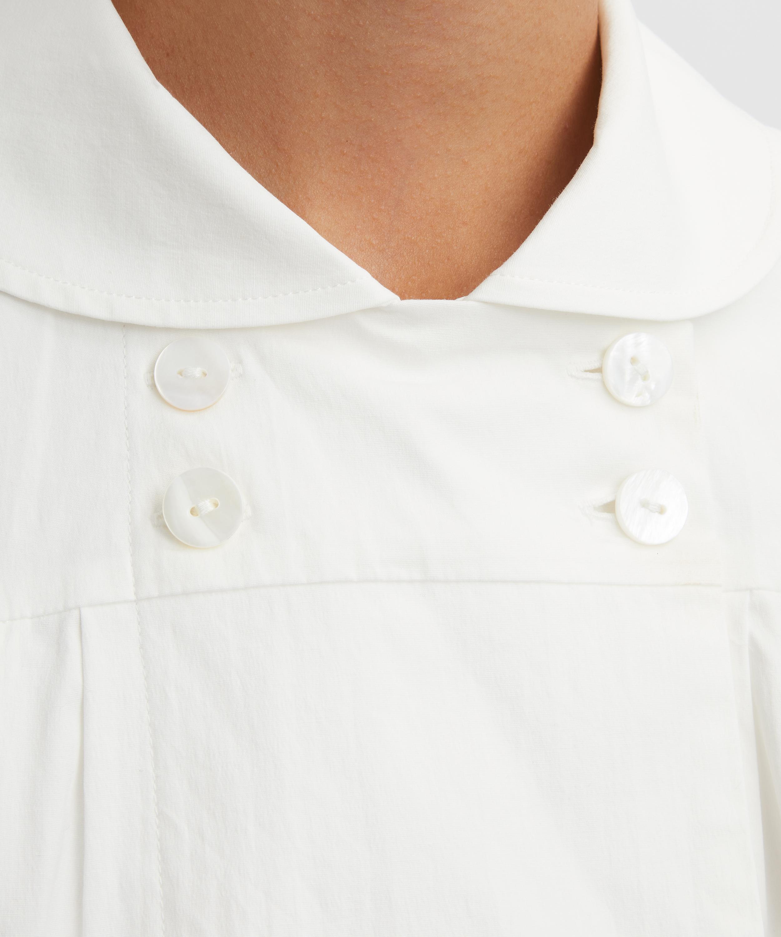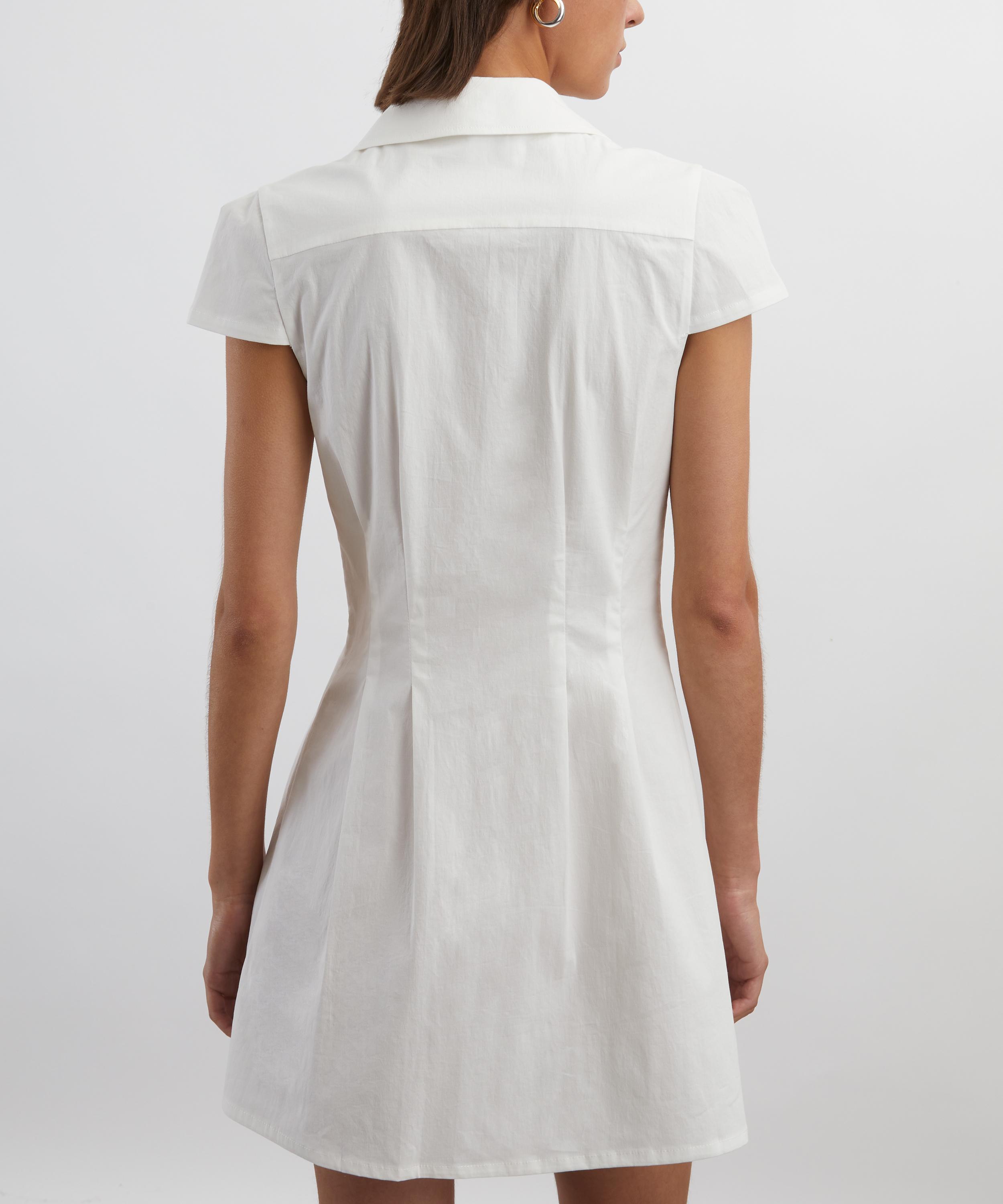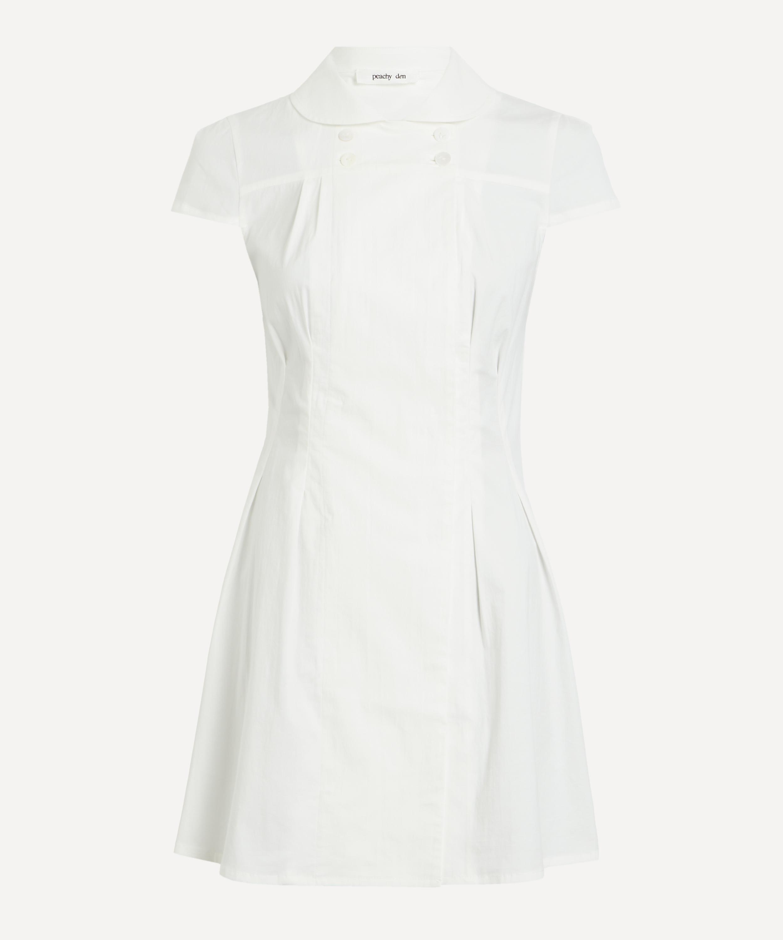 Effortlessly feminine, this fitted cap sleeve dress exudes elegance with its curved wide collar and dainty mother of pearl style buttons. A form-fitting design neatly cinched at the waist, it’s made from crisp white cotton for effortless versatility.