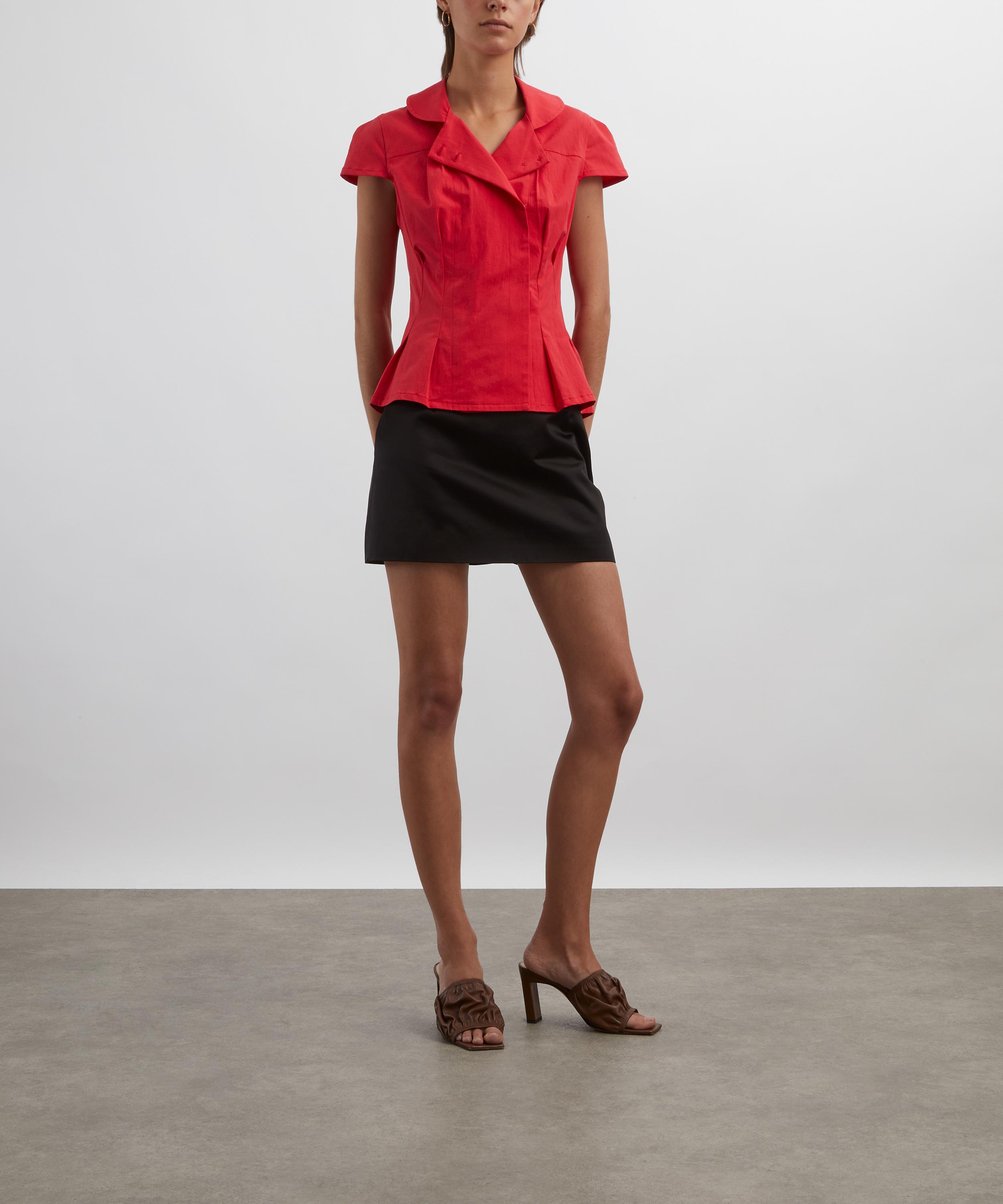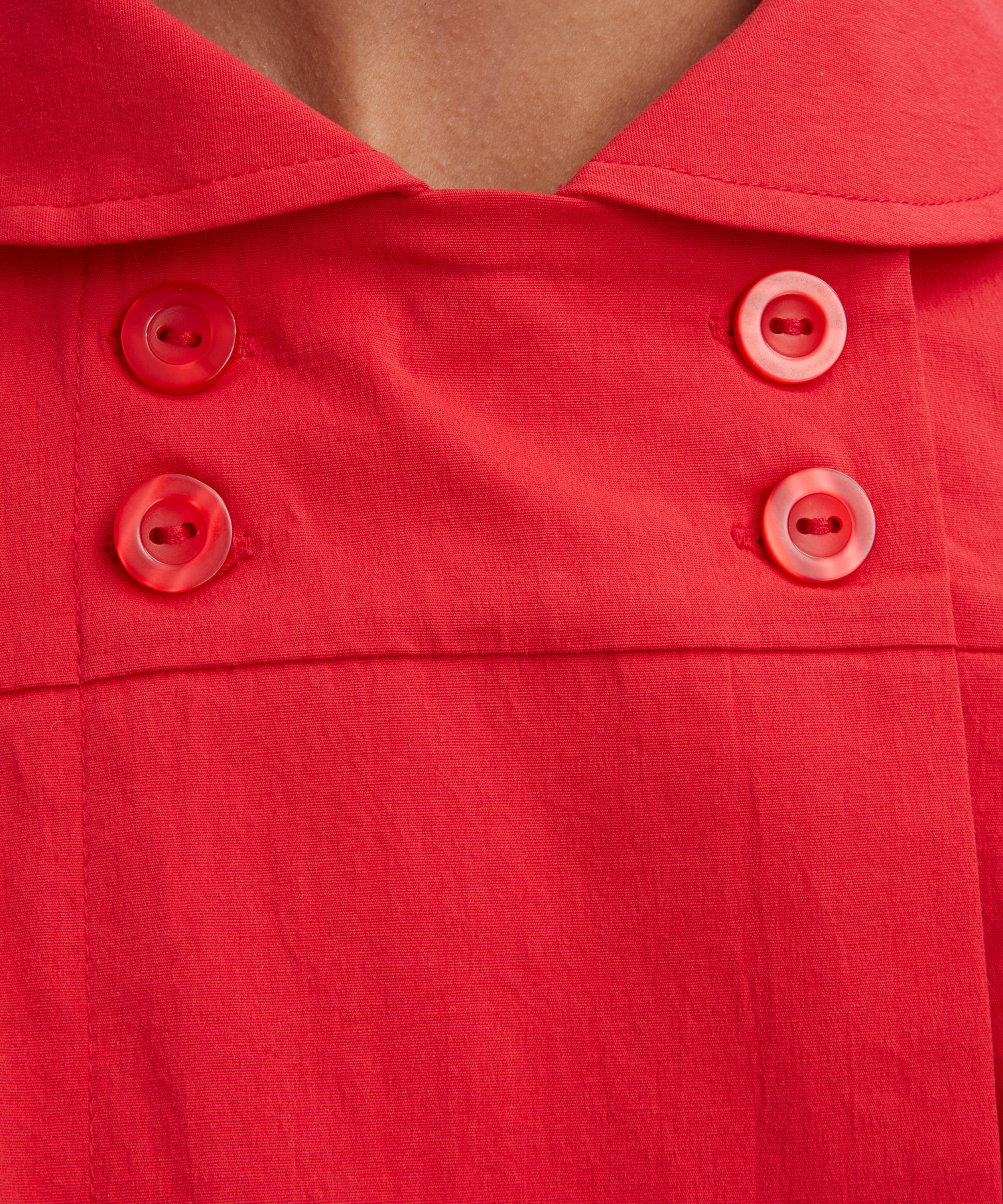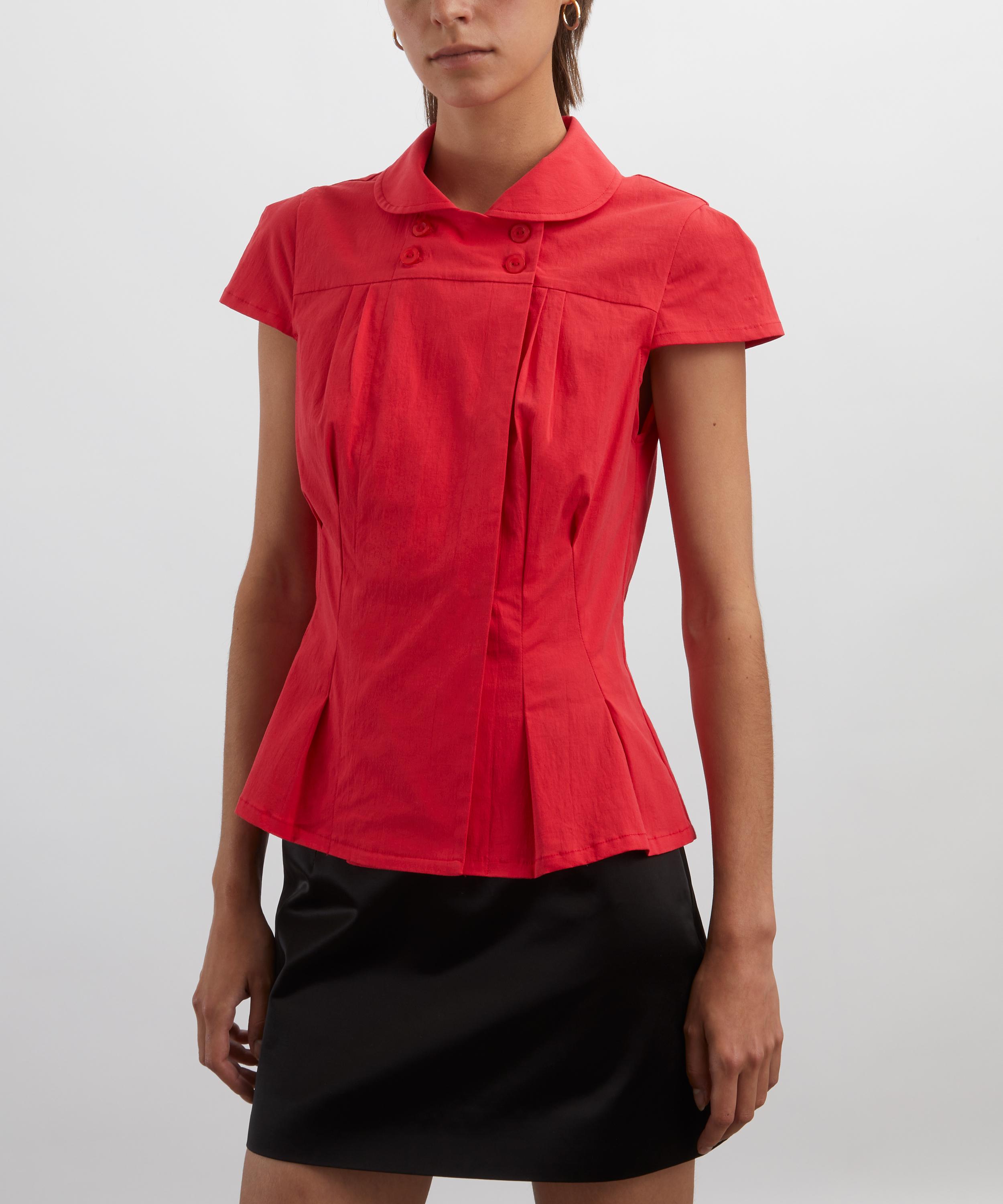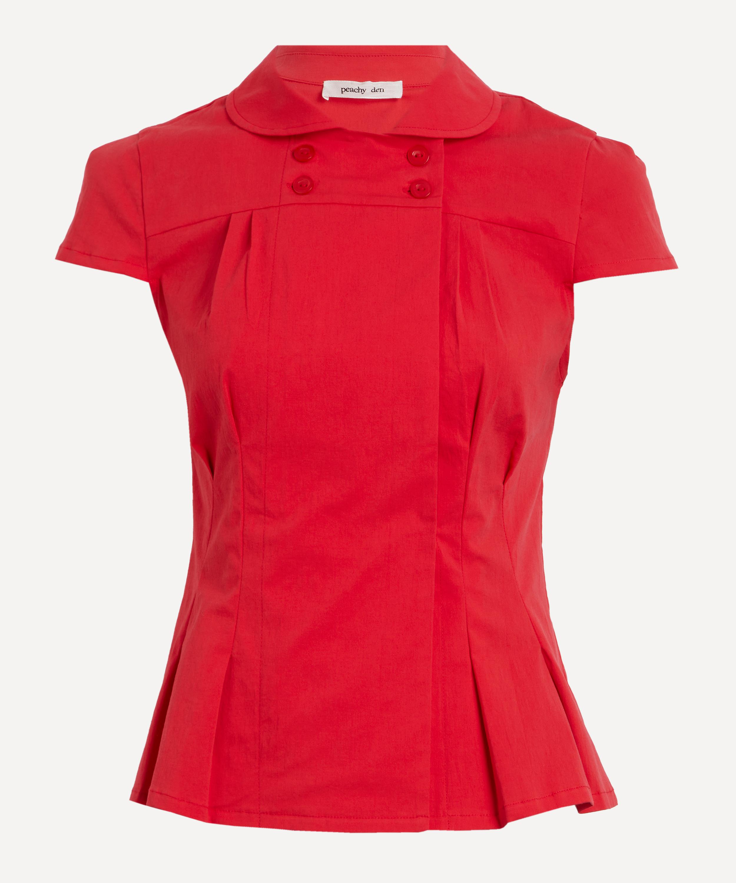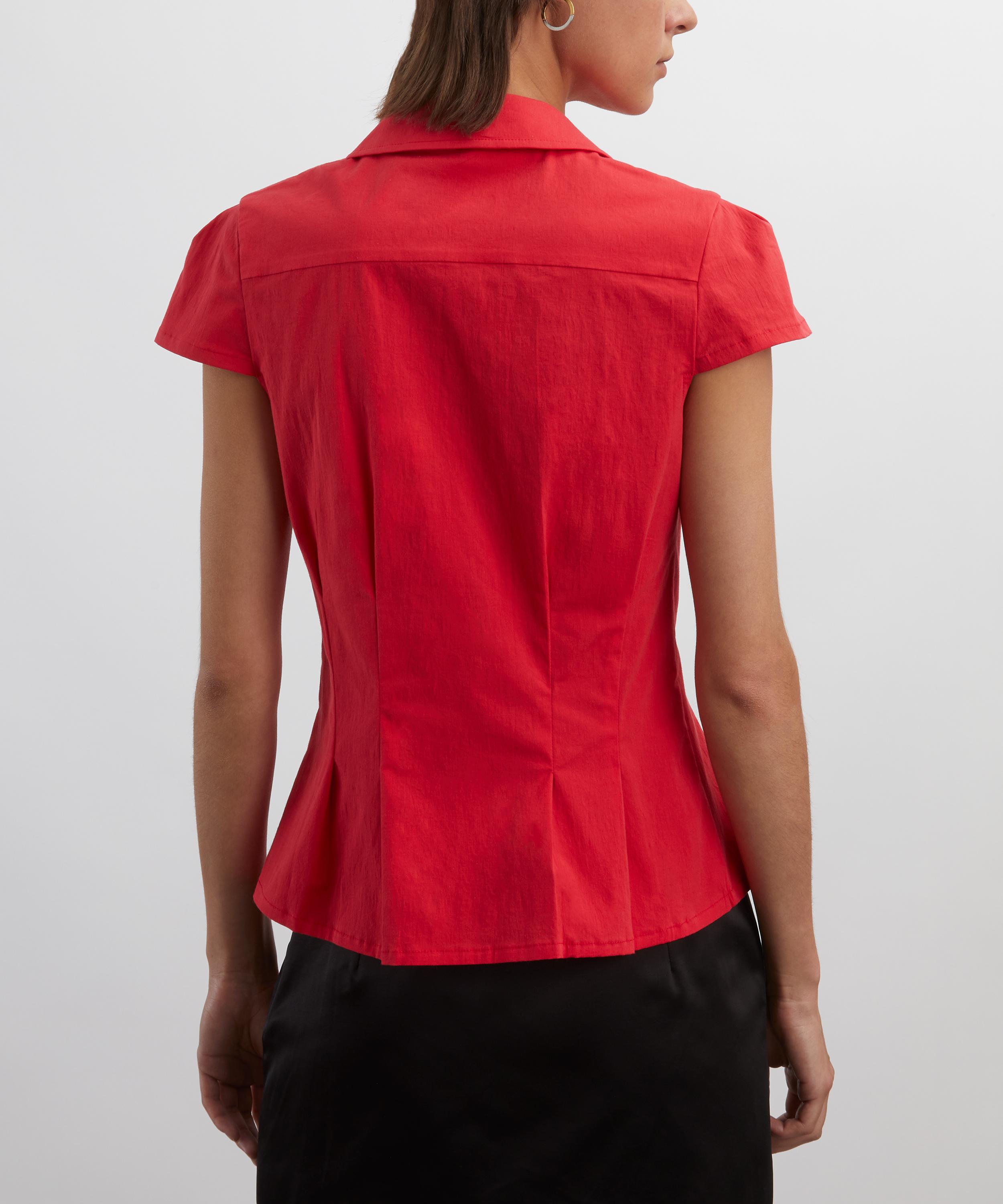 Effortlessly feminine, this fitted cap sleeve blouse exudes elegance with its curved wide collar and dainty mother of pearl style buttons. A form-fitting design, it’s made from a tomato-hued cotton blend for effortless versatility.
