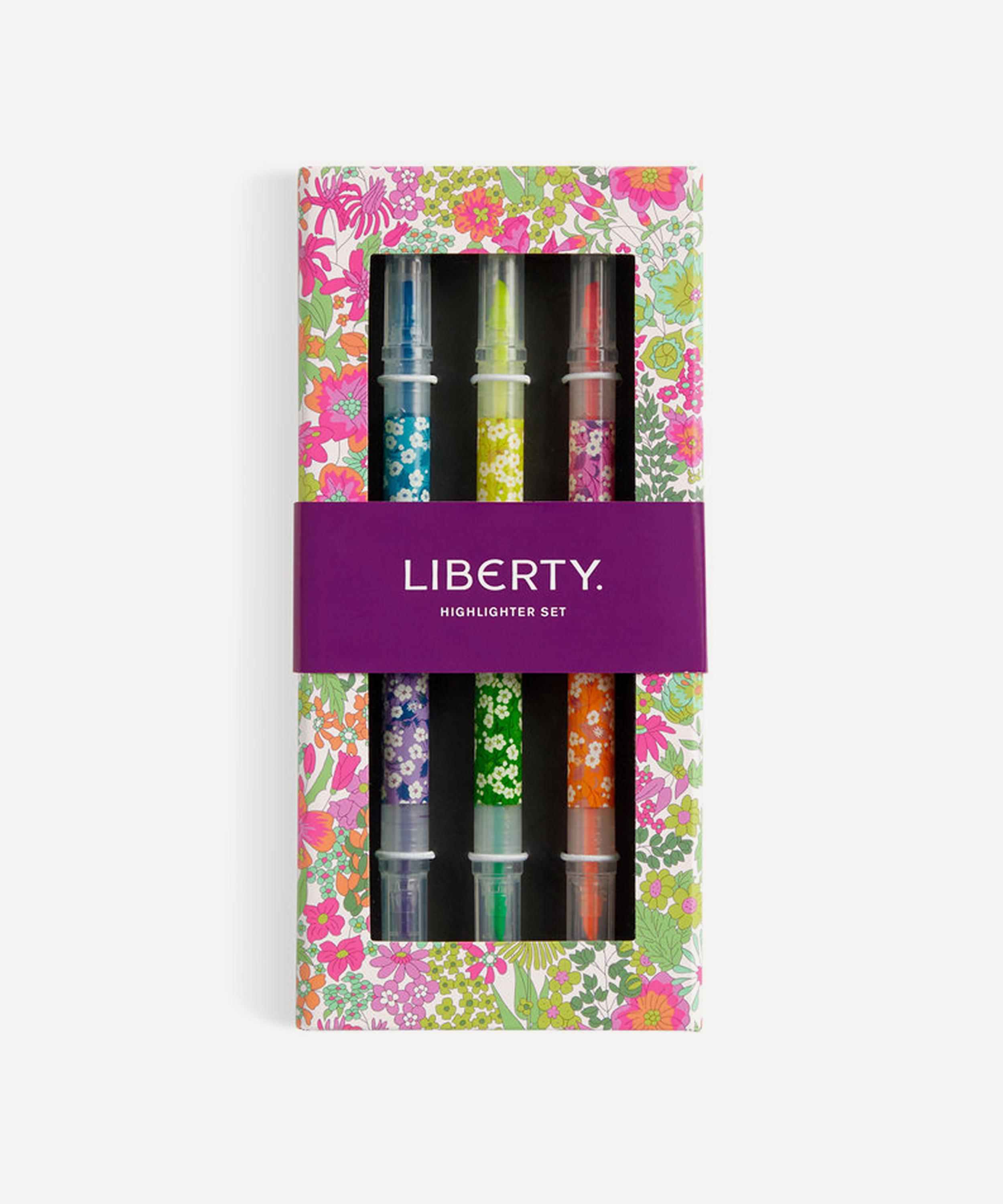 Elevate your stationary collection with Liberty’s charming Mitsi highlighter set. This stationary essential features three double-tipped highlighters for a total of six neon ink colours - purple, blue, green, yellow, orange and pink. The barrels are wrapped our Mitsi print designed by Gillian Farr, a member of the Liberty Fabrics studio in the 1950s. The pattern pays homage to Liberty’s historical love for Japanese design motifs, featuring delicate cherry blossom. Presented together in a matching box, the highlighters can be slipped into a drawer or displayed in a handy desktop pot.