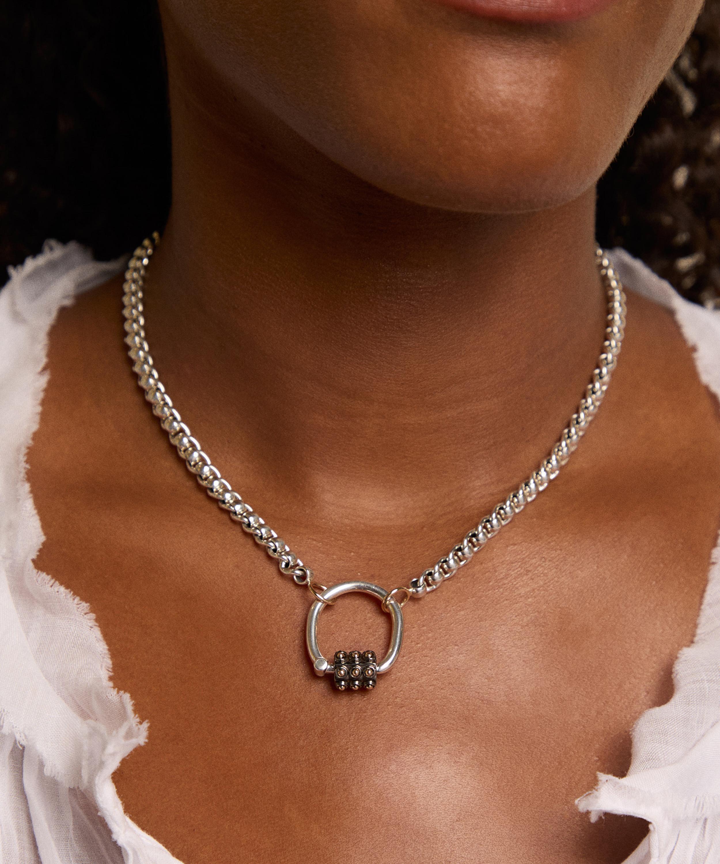 Expand your jewellery collection and curate an eye-catching stack with the Trundle Lock Ring from Marla Aaron. Crafted from sterling silver, it features a flat band with a small Trundle – a 16th-centry word for wheel or roller. Decorated with 14ct gold balls, it opens with a delightful mechanism, allowing it to hold any of Aaron’s locks or charms. Spotlighting functional maximalism with a bold, yet refined look, it boasts endless styling possibilities. Wear it alone for a minimalist statement, team it with other rings or personalise it with a charm from the brand to create your own bespoke stack.