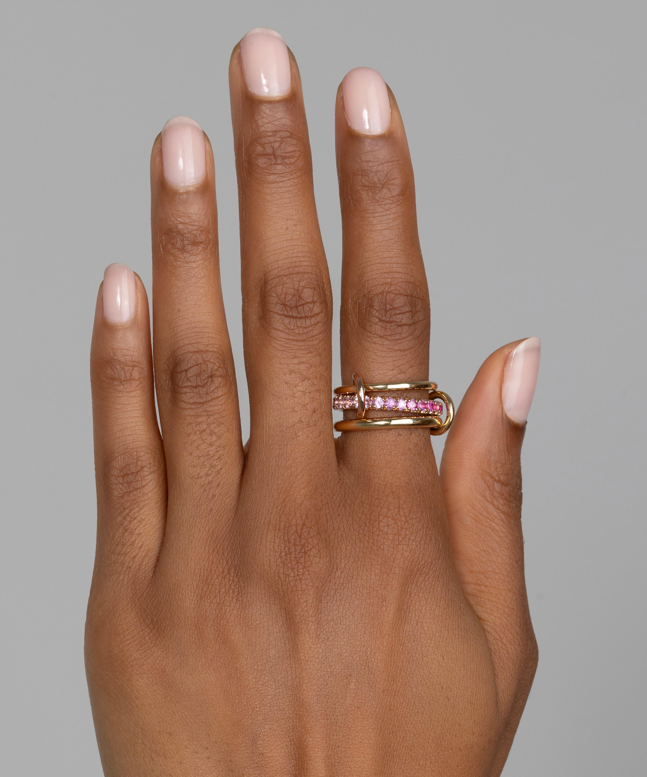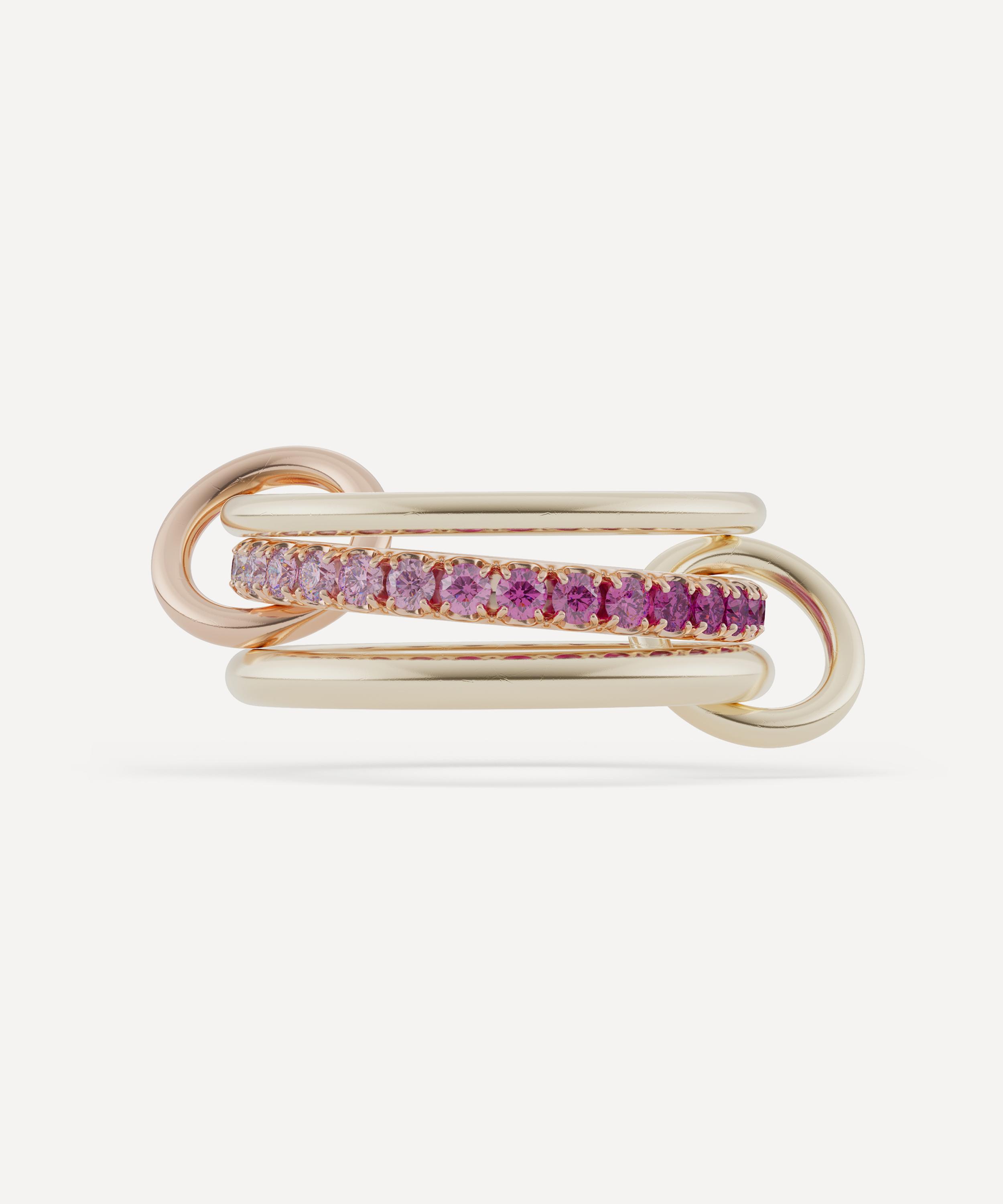 Designed to bring colour to your curated stack, the Petunia Sapphire Ring from Spinelli Kilcollin boasts a striking design. It features Kilcollin’s signature interconnected silhouette, illuminated by pavé-set pink ombré sapphires. Handmade in Los Angeles from 18ct gold and 18ct rose gold, it can be paired with other rings or worn across multiple fingers.