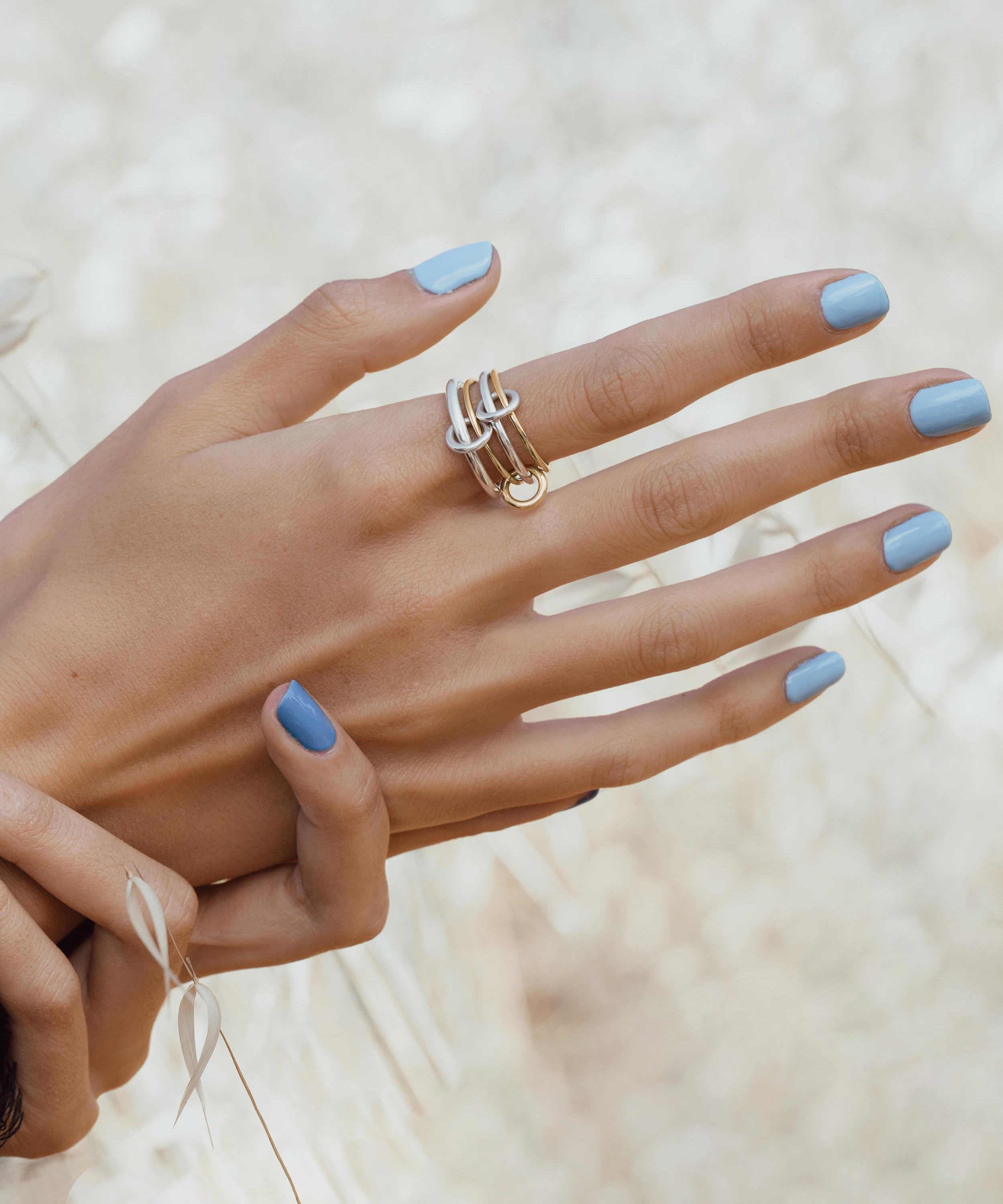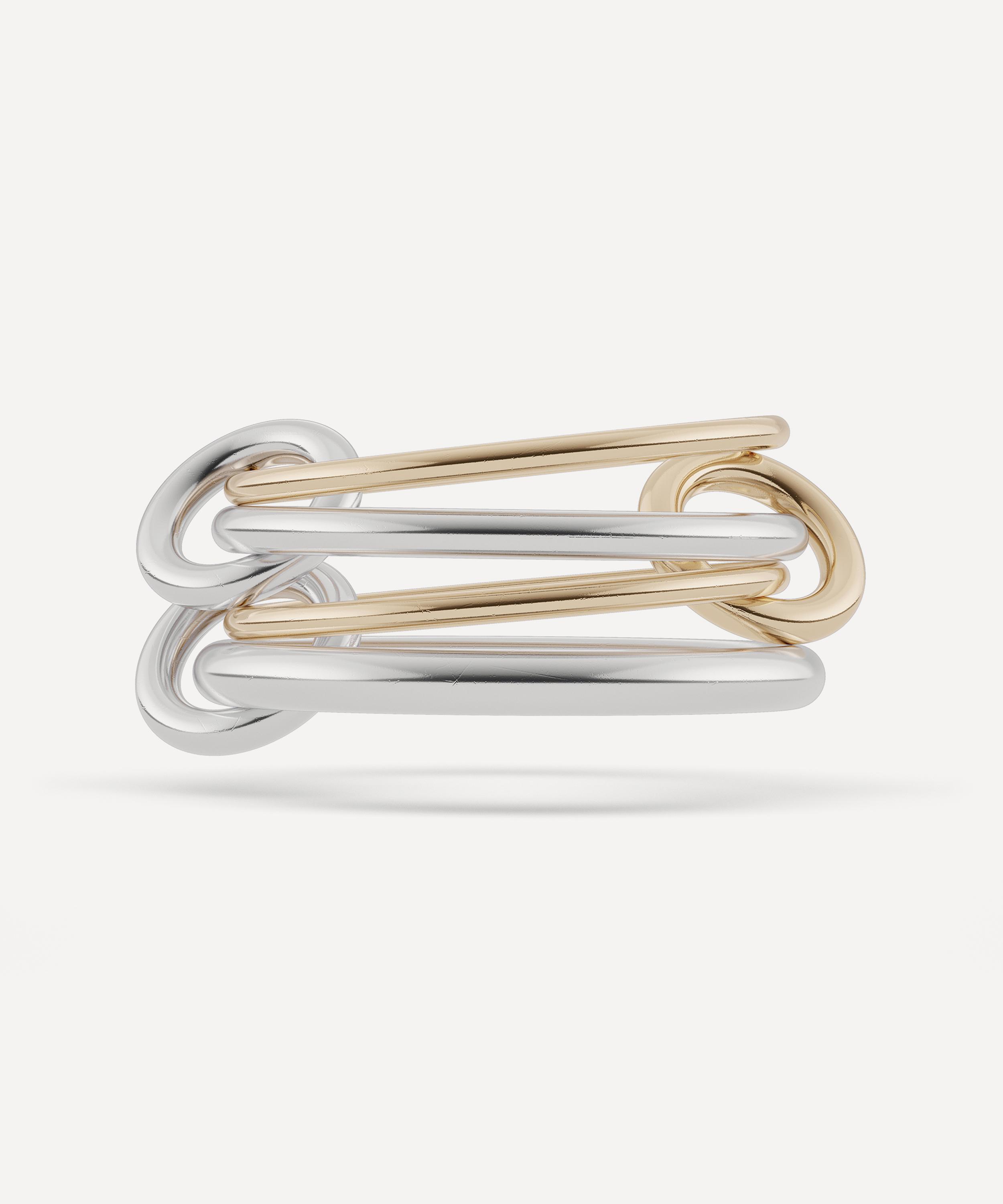 Build the perfect elevated ring stack and create your unique style with the Pisces ring from Spinelli Kilcollin. Renowned for their clean, conceptual and innovative designs, this contemporary piece features an interconnected silhouette composed of four bands crafted from 18ct gold and sterling silver. Two sterling silver connectors, and a 18ct gold connector, link each band together, encouraging the ring to be worn spread across multiple fingers, or stacked as a sculptural whole.