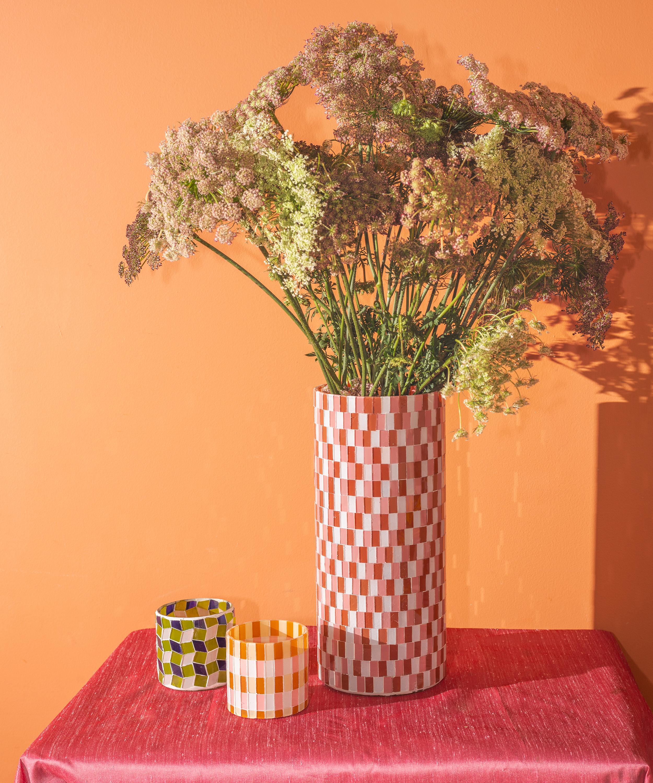 This striking mosaic glass vase presents a charming array of red, white and pink tones, wrapping its tall, cylindrical silhouette in a mesmerising tiled design. Fill with fresh blooms for a wonderful centrepiece or experiment with maximalist styling by pairing with other bold and brightly hued pieces from the brand.