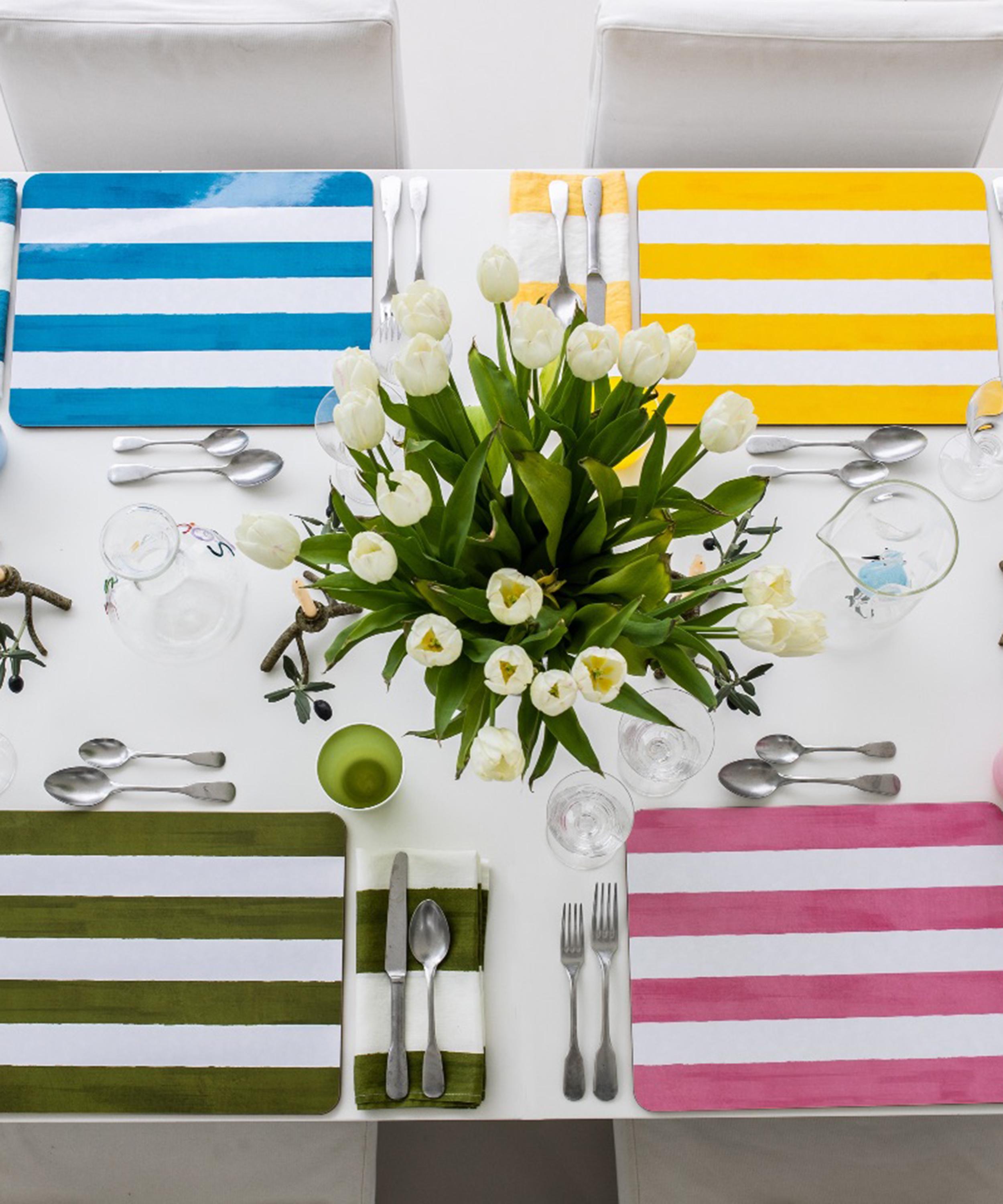 Expertly crafted in England, each placemat is made with a sustainably sourced eucalyptus base and a wipeable high-gloss melamine finish. With sweeping stripes in four versatile colourways, use the four-piece set to create a colourful and organic finishing touch to your dining table.
