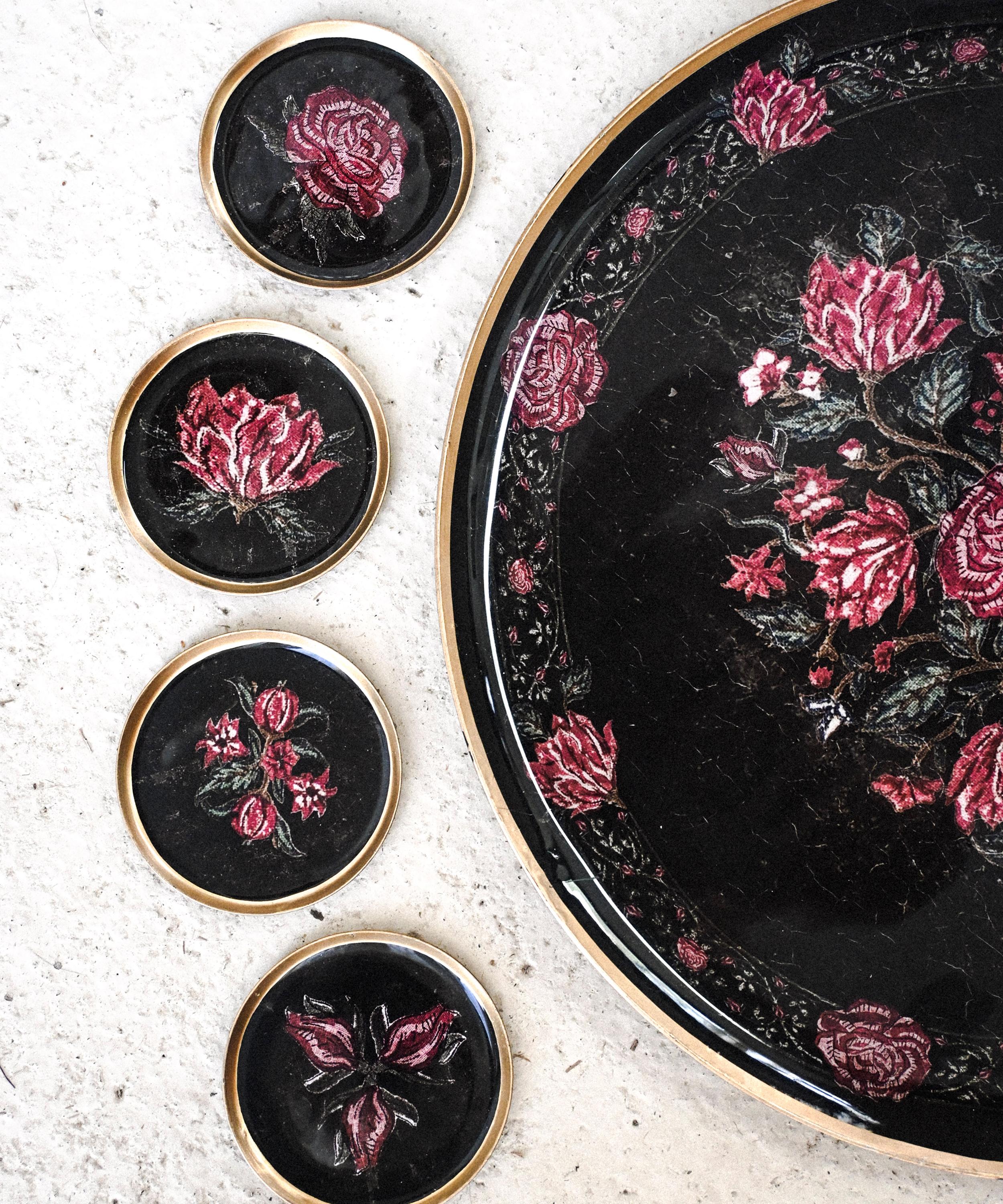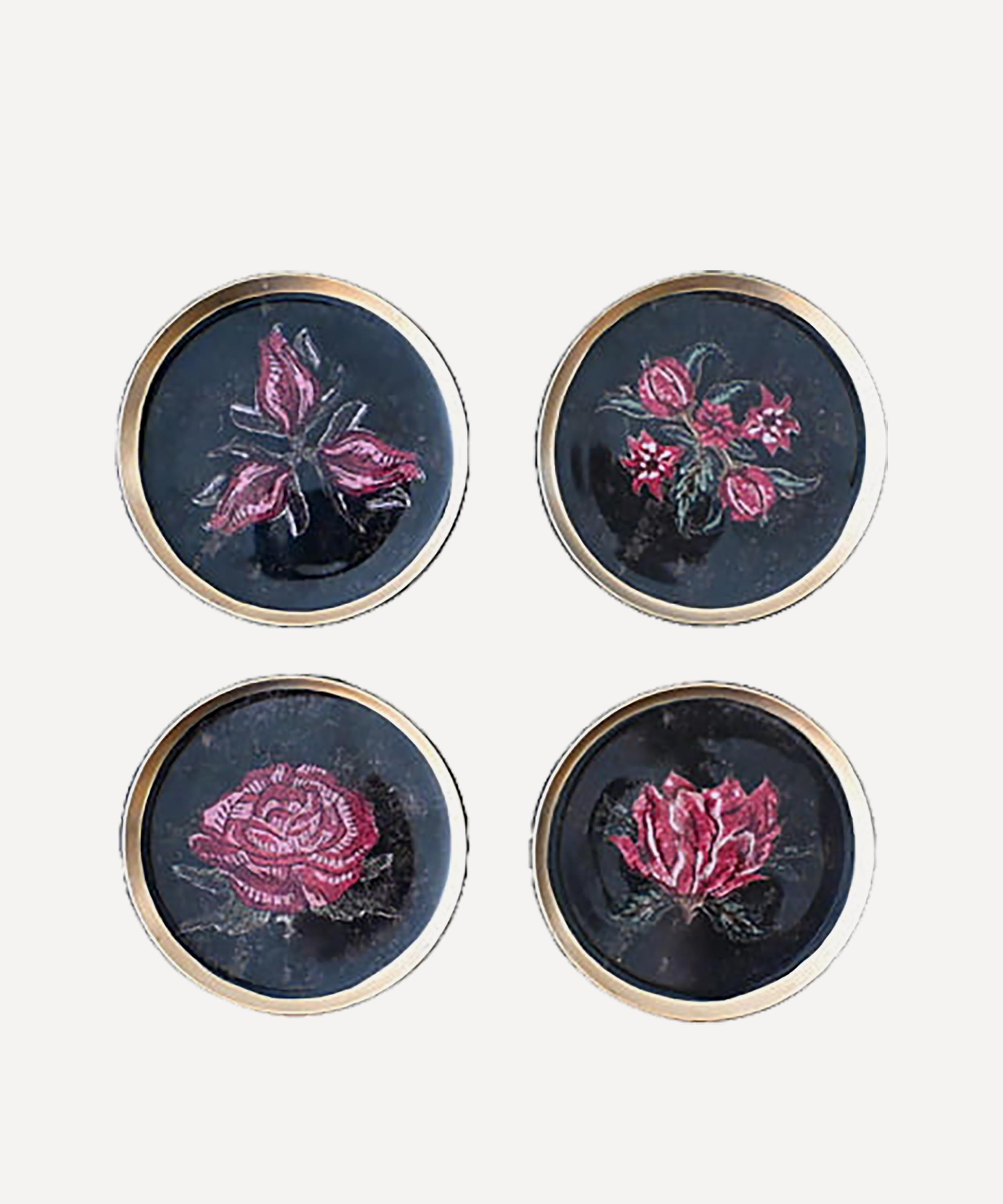 Meticulously crafted from durable enamelled iron, these coasters feature a delicate floral design for a joyful, mesmerising motif. Delicately finished with a hand-gilded edge, these make a charming hostess gift or scatter them around your living space to elevate cocktail hour.