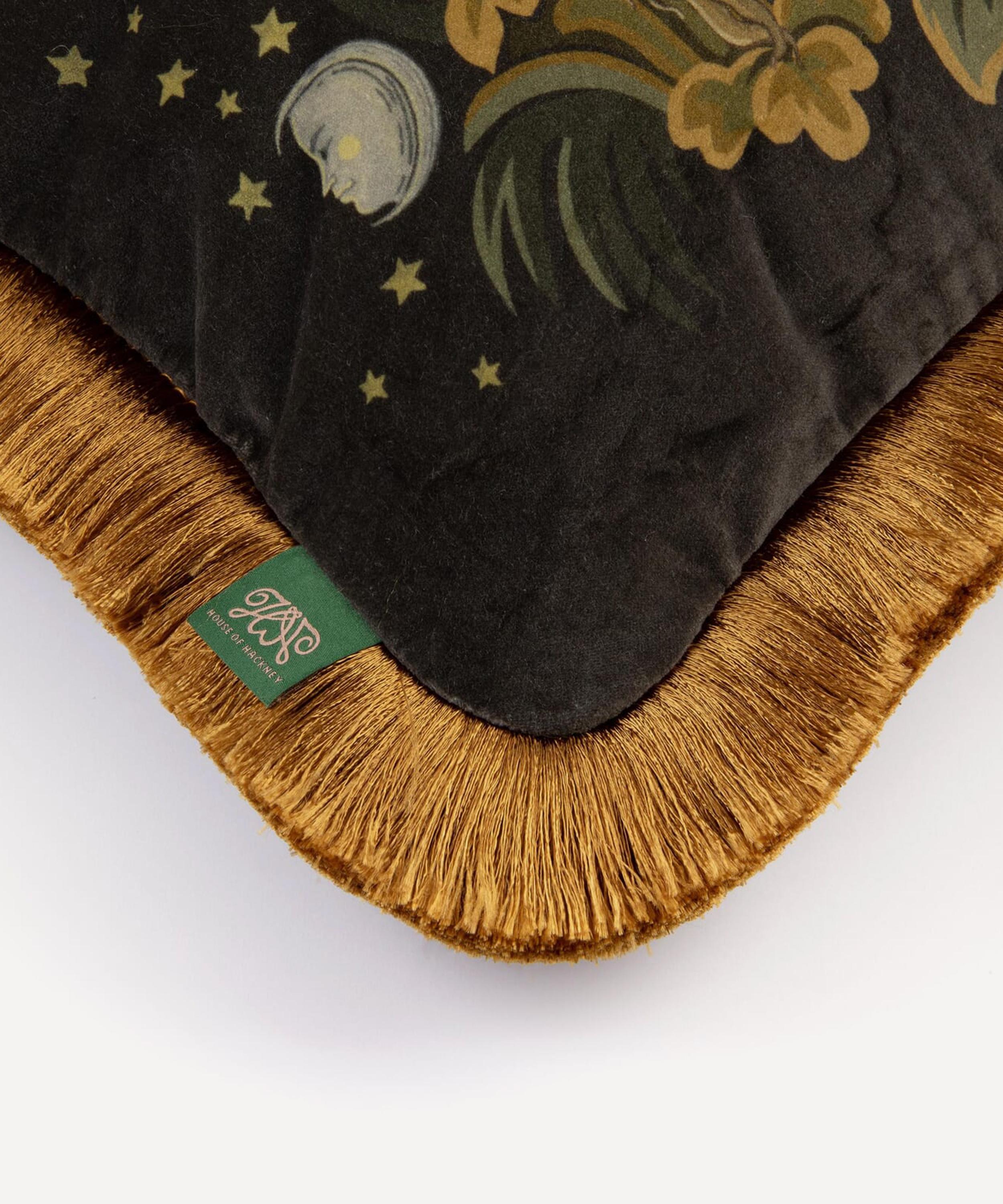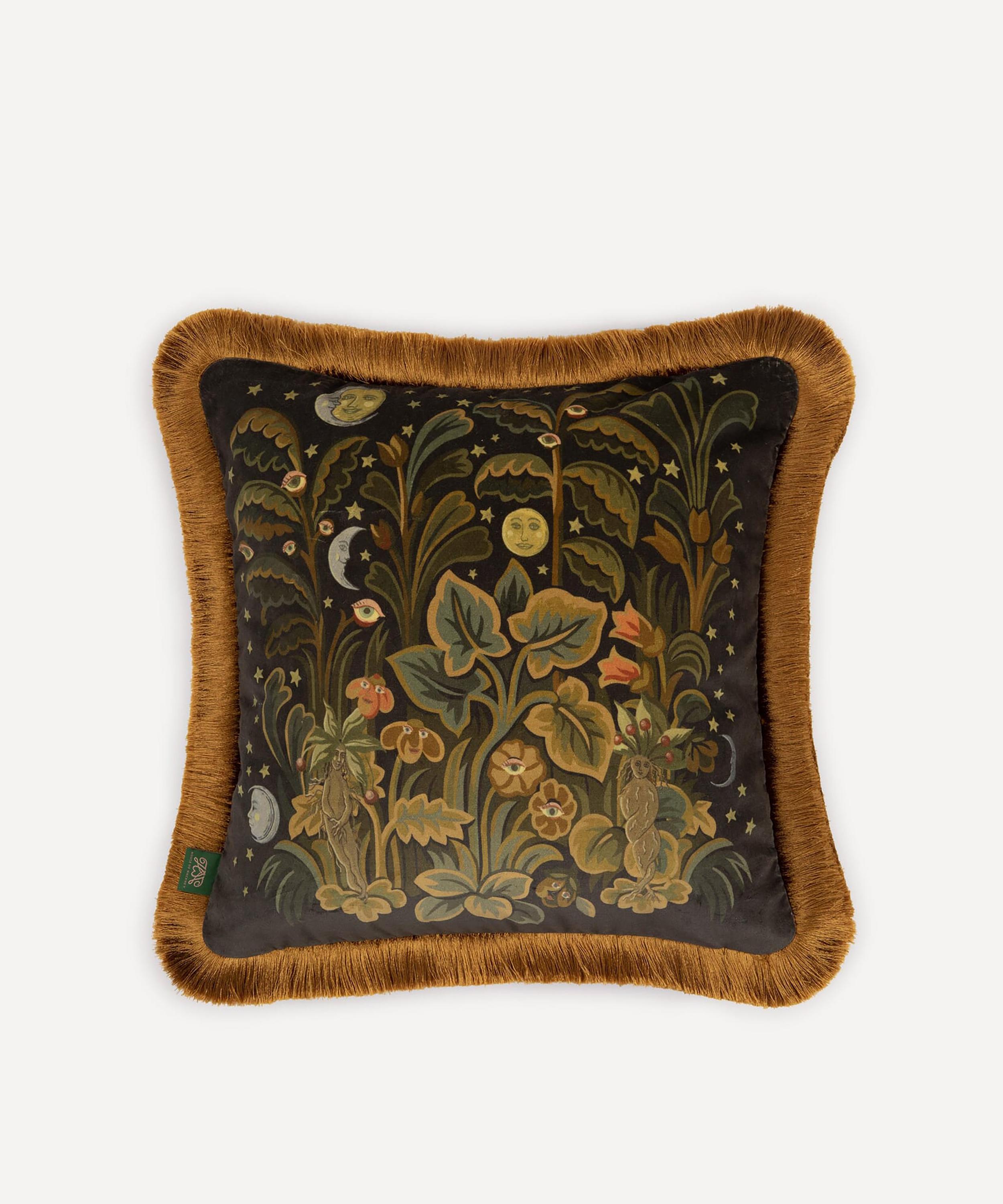 A garden of earthly delights, this sumptuous black velvet cushion features midnight plants, fantastical creatures, twinkling stars and the four phases of the moon, under which the garden comes alive. Made in Britain from smooth cotton-velvet, use to breathe life into love-worn sofas and chairs - beautifully enhancing any room to opulent new heights.