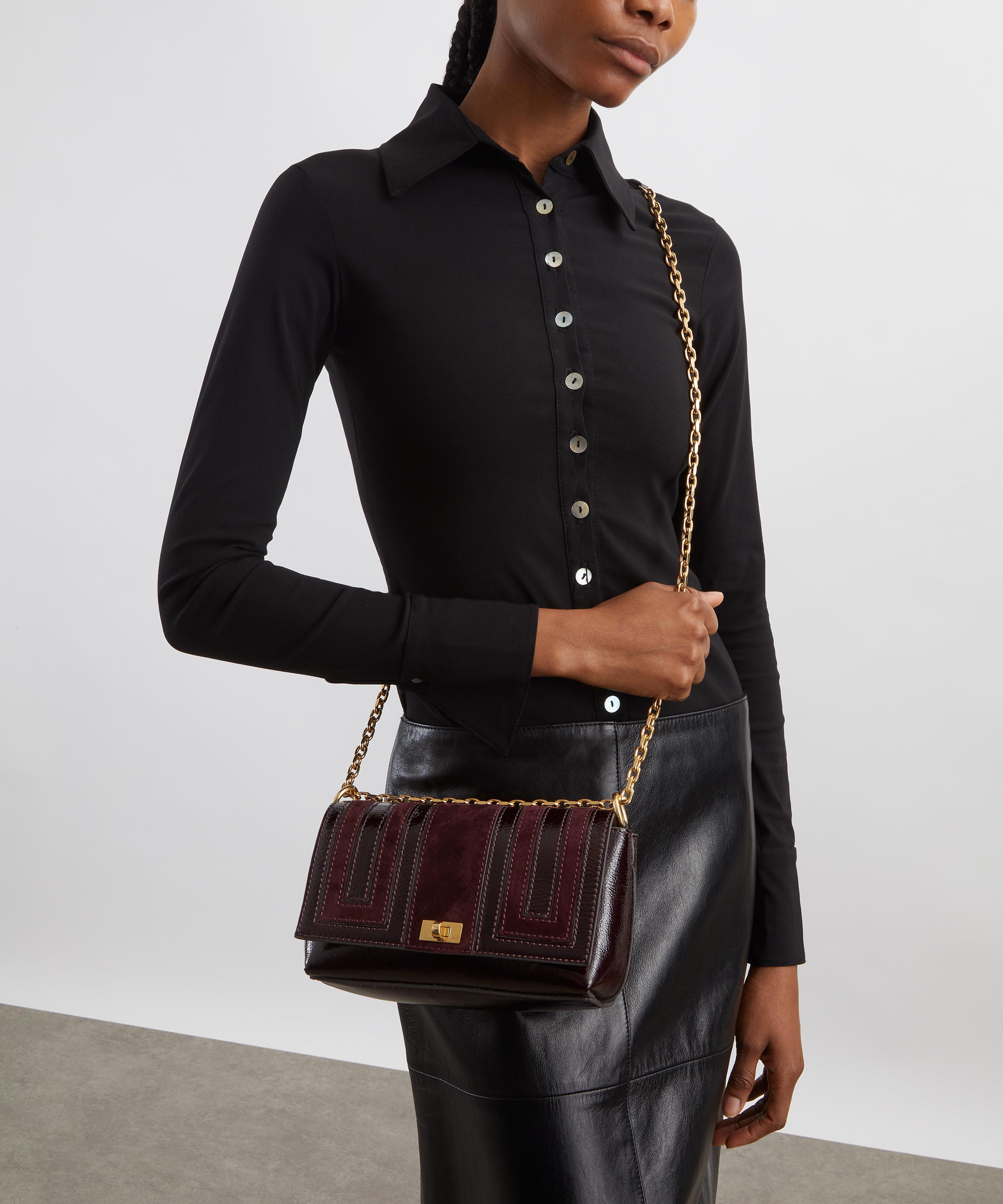 It’s expertly crafted from patent and suede leather, and augmented with a leather-chain strap, opening to reveal a spacious interior with a leather pocket, designed to carry your wallet, phone, notebook and essential make-up. Ideal for both formal and daily dressing, it’s finished with gold-tone hardware for further polish.
