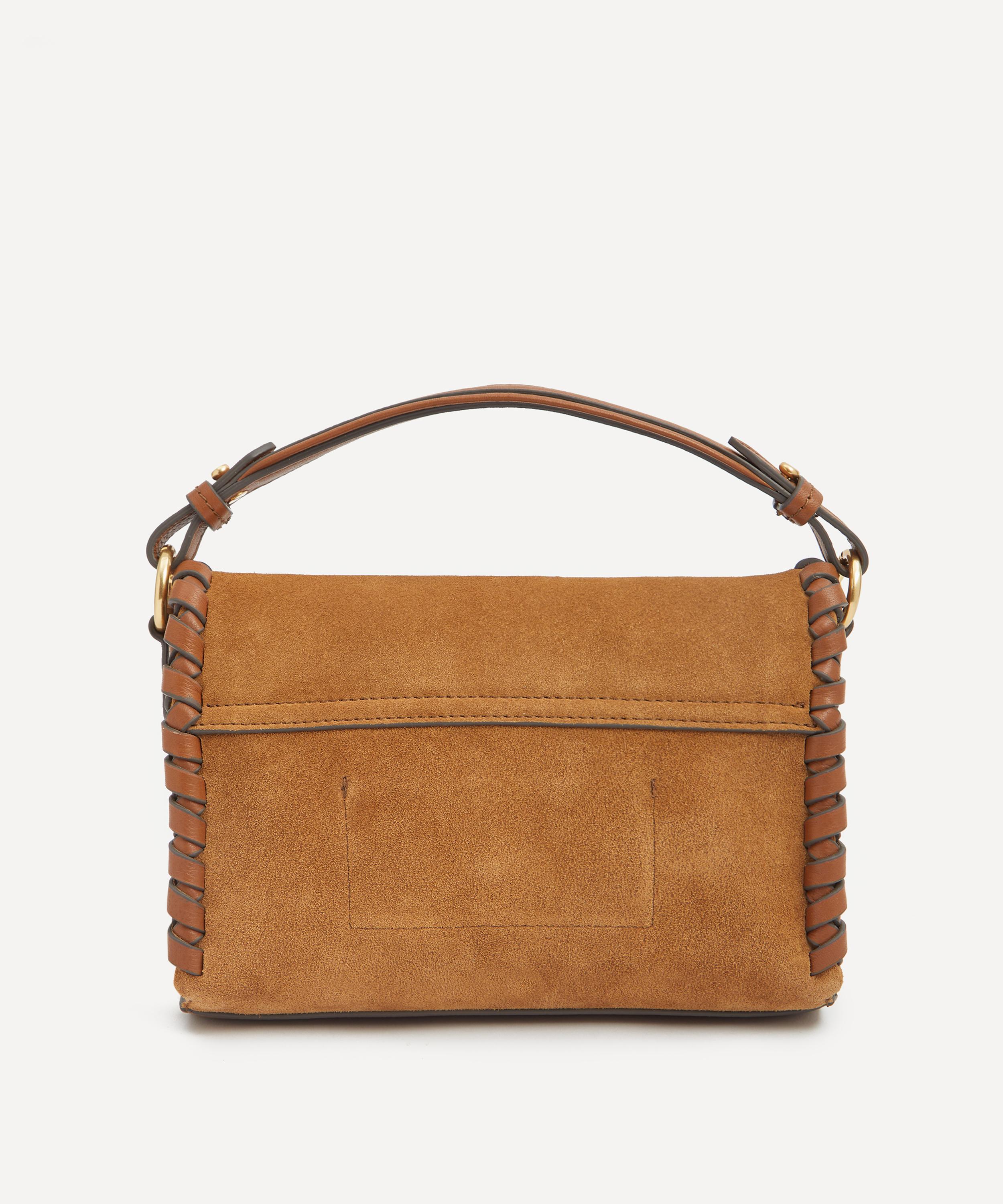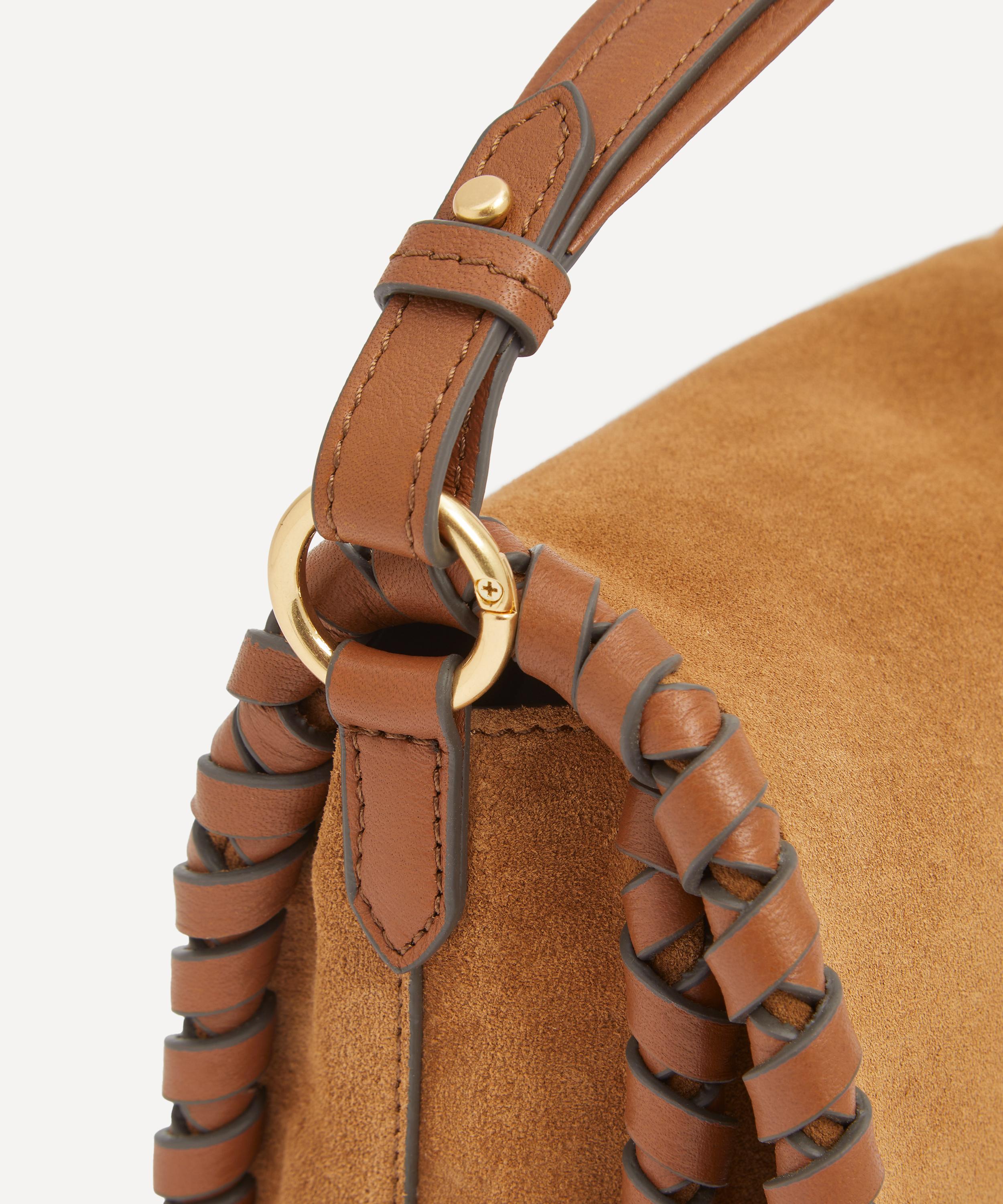 Crafted from suede leather, with leather-woven edges, it features a suede top-handle, an adjustable and removeable shoulder strap, and is finished with gold-tone hardware.