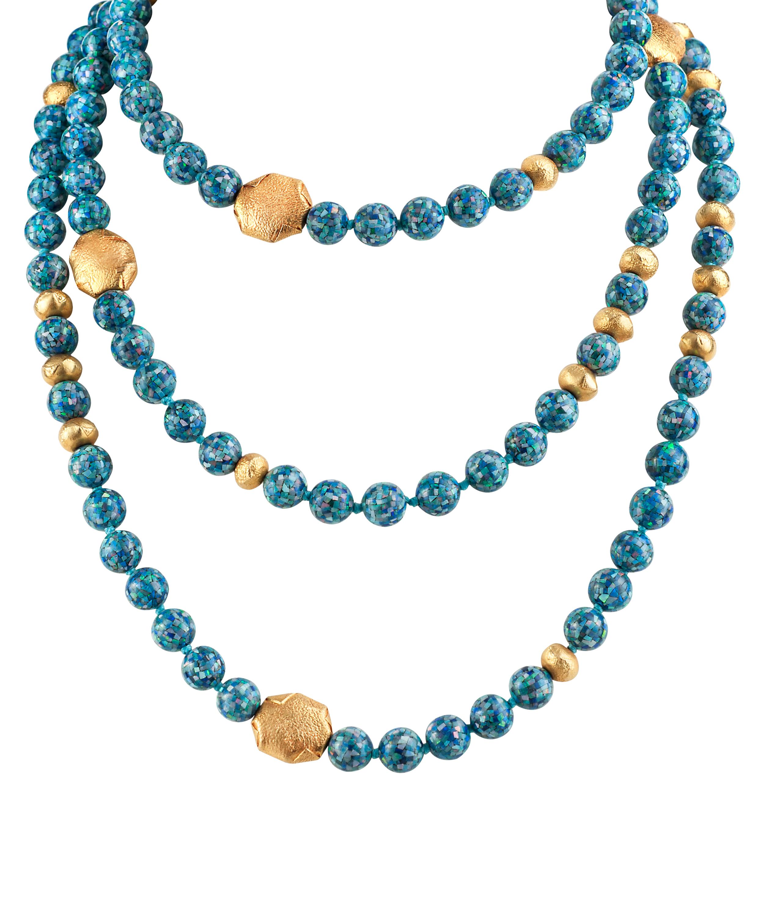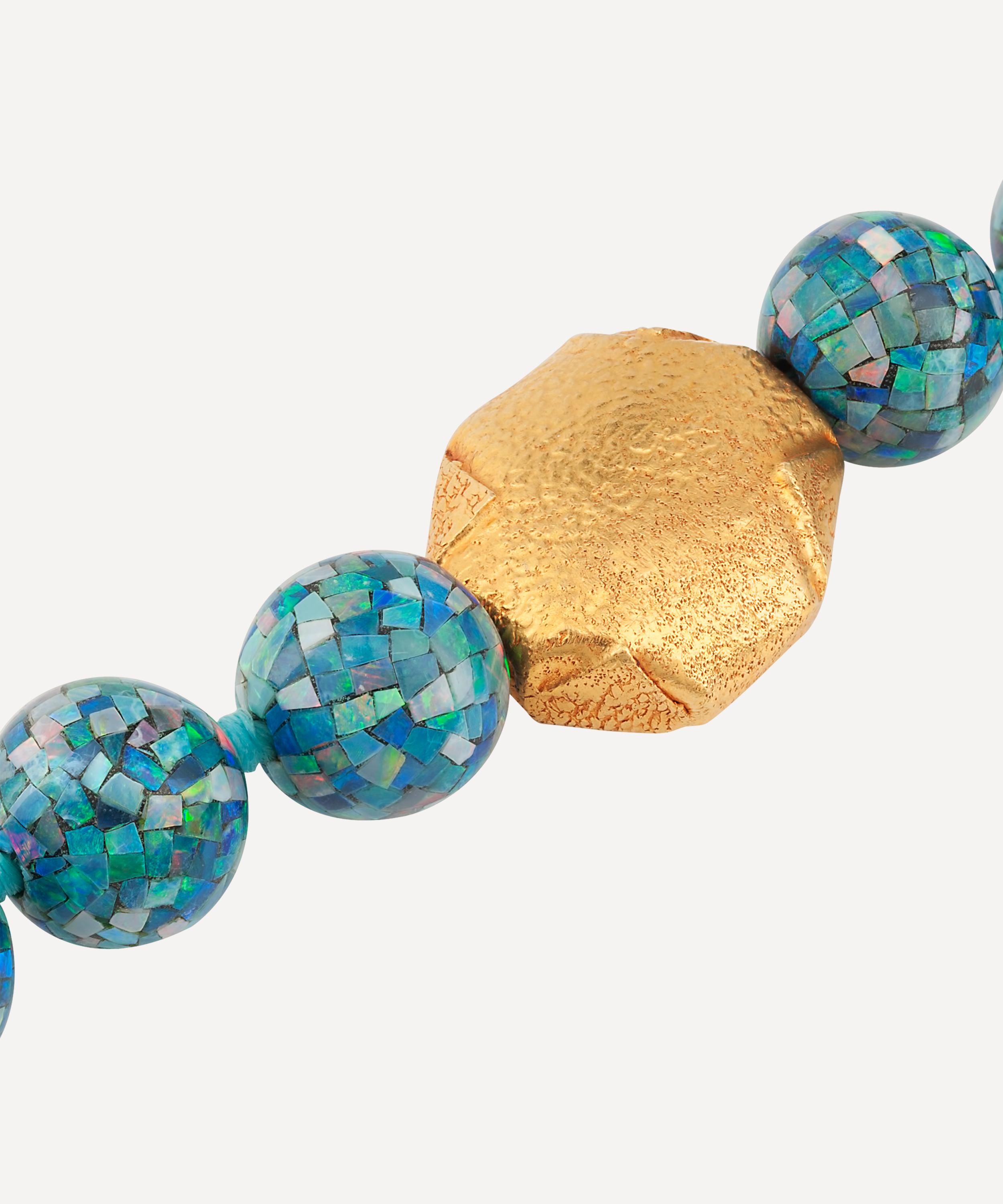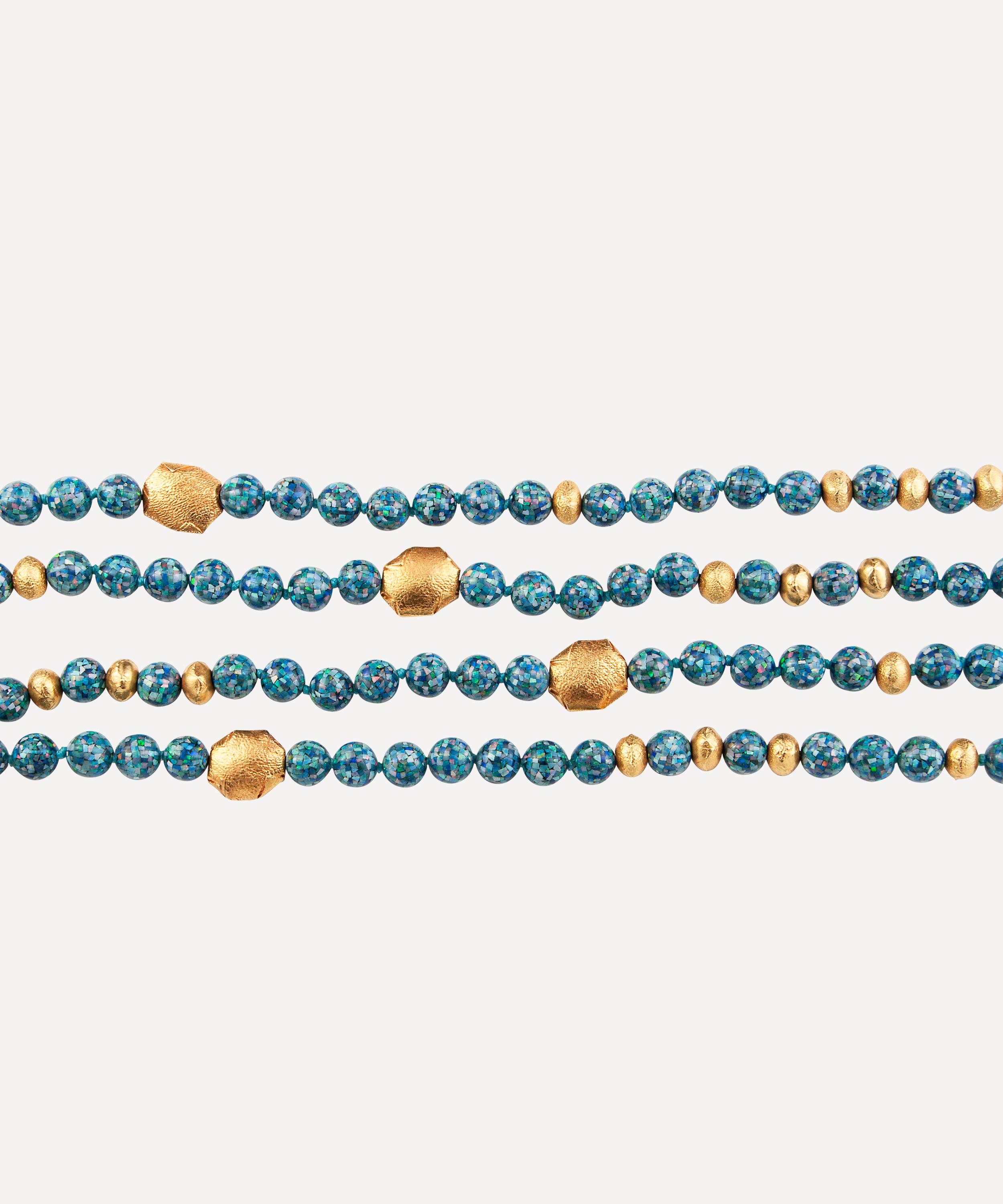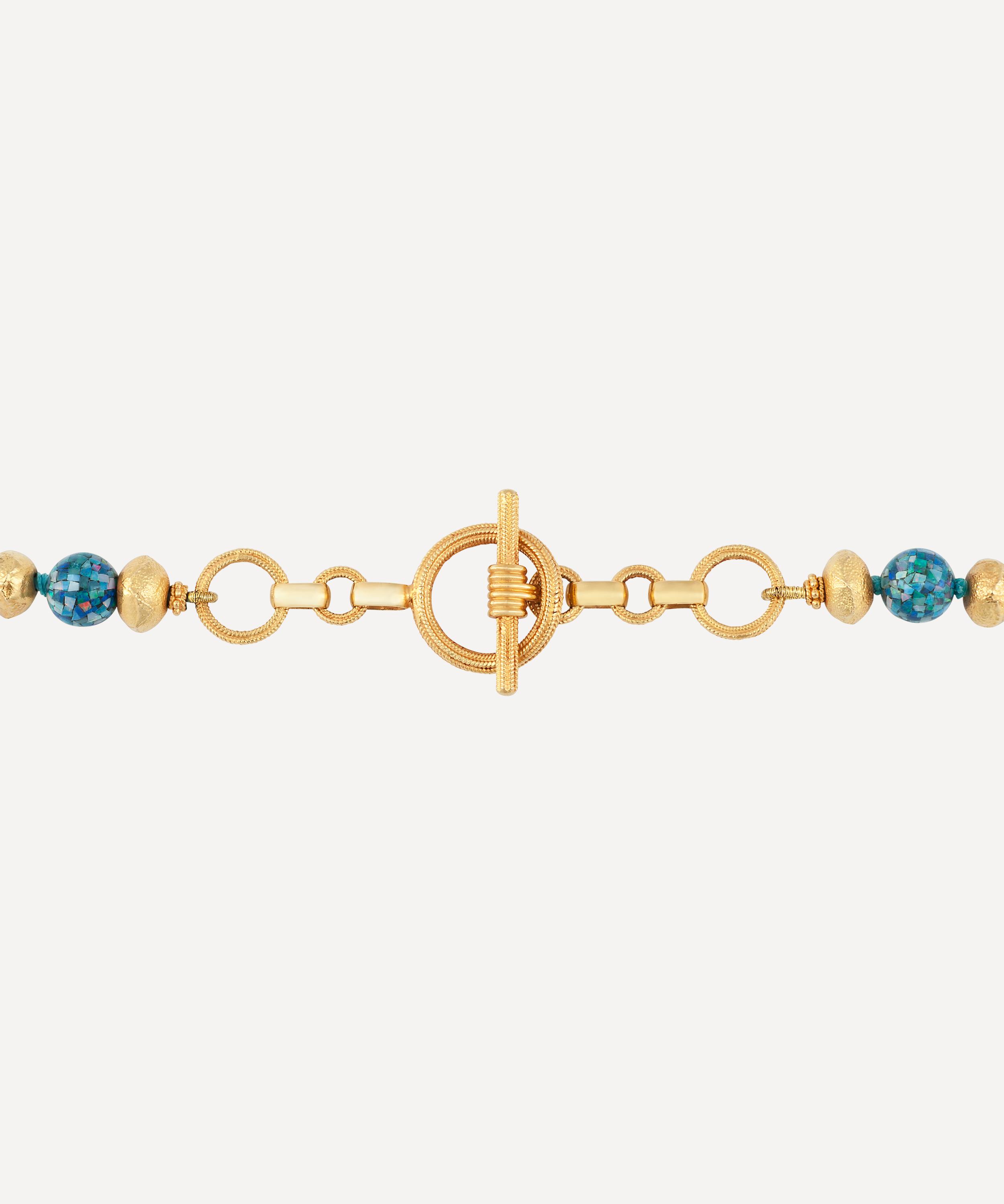 This necklace comprises 111 blue beads, each one painstakingly crafted from shards of iridescent opal. Arranged in three tiers, the beads are interspersed with contrasting stations wrapped in hammered 14ct gold, for a warming effect on the complexion. Style this necklace alone over flowing layers, or stack it with additional gold chains for a harmonious maximalist look.