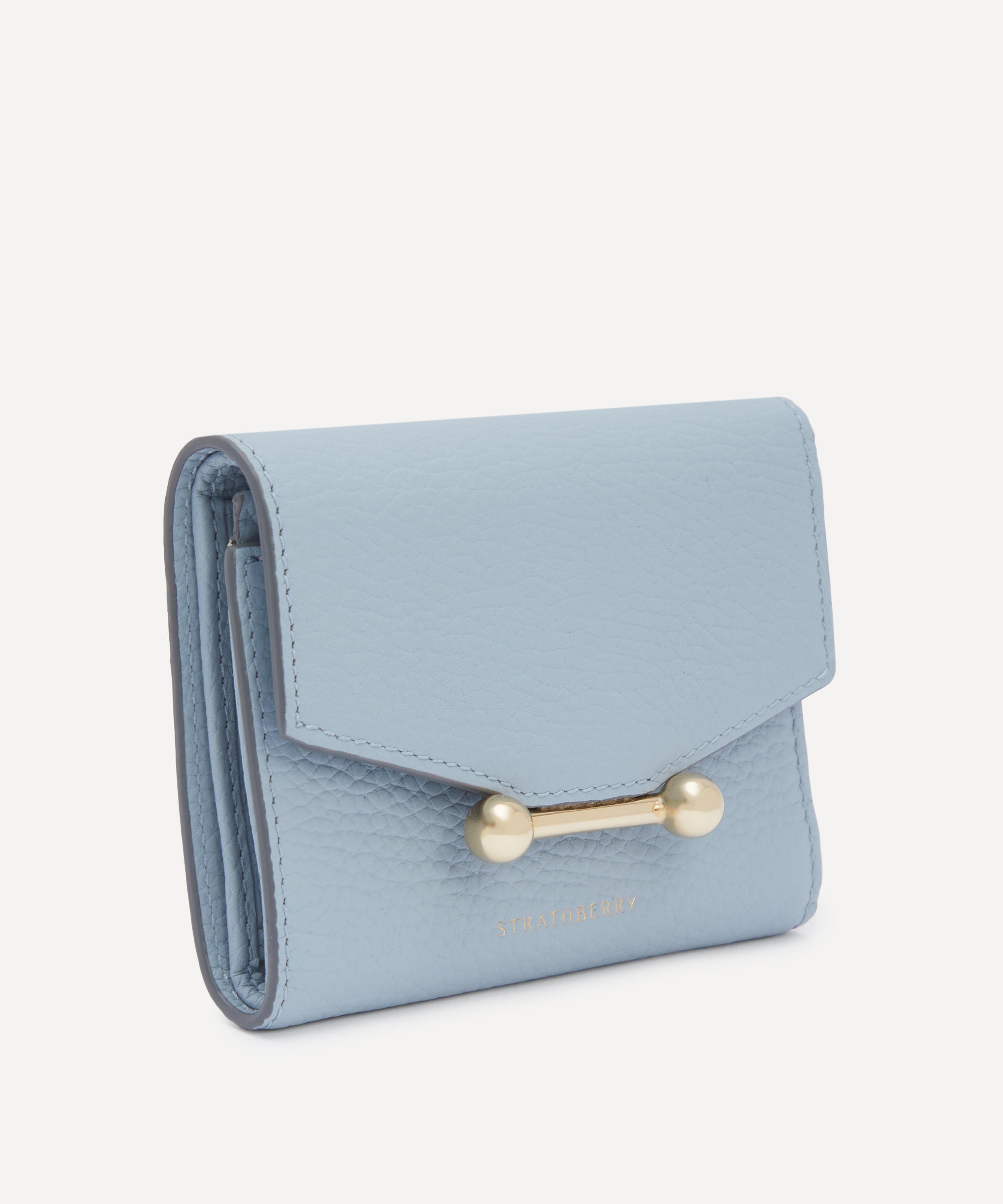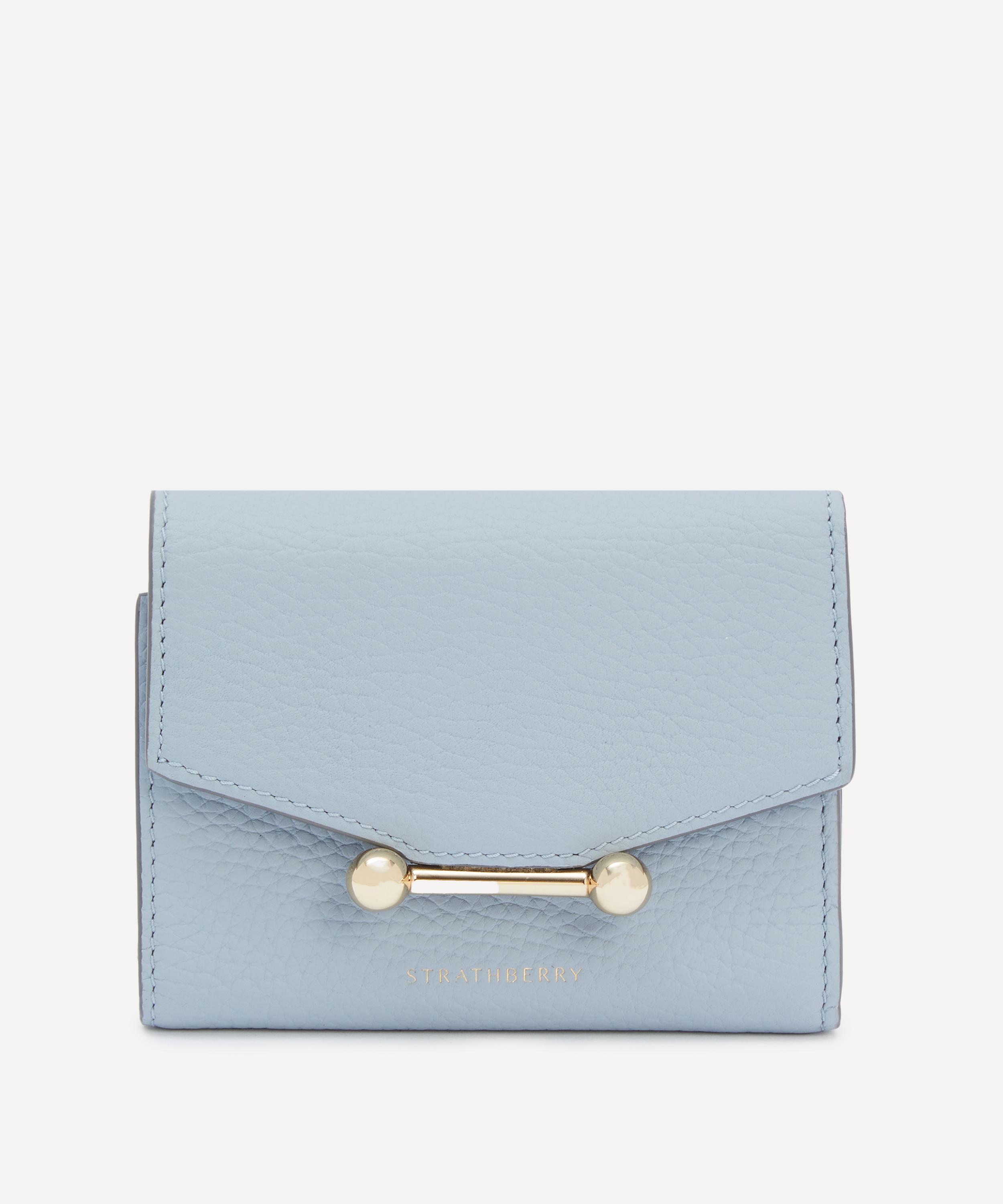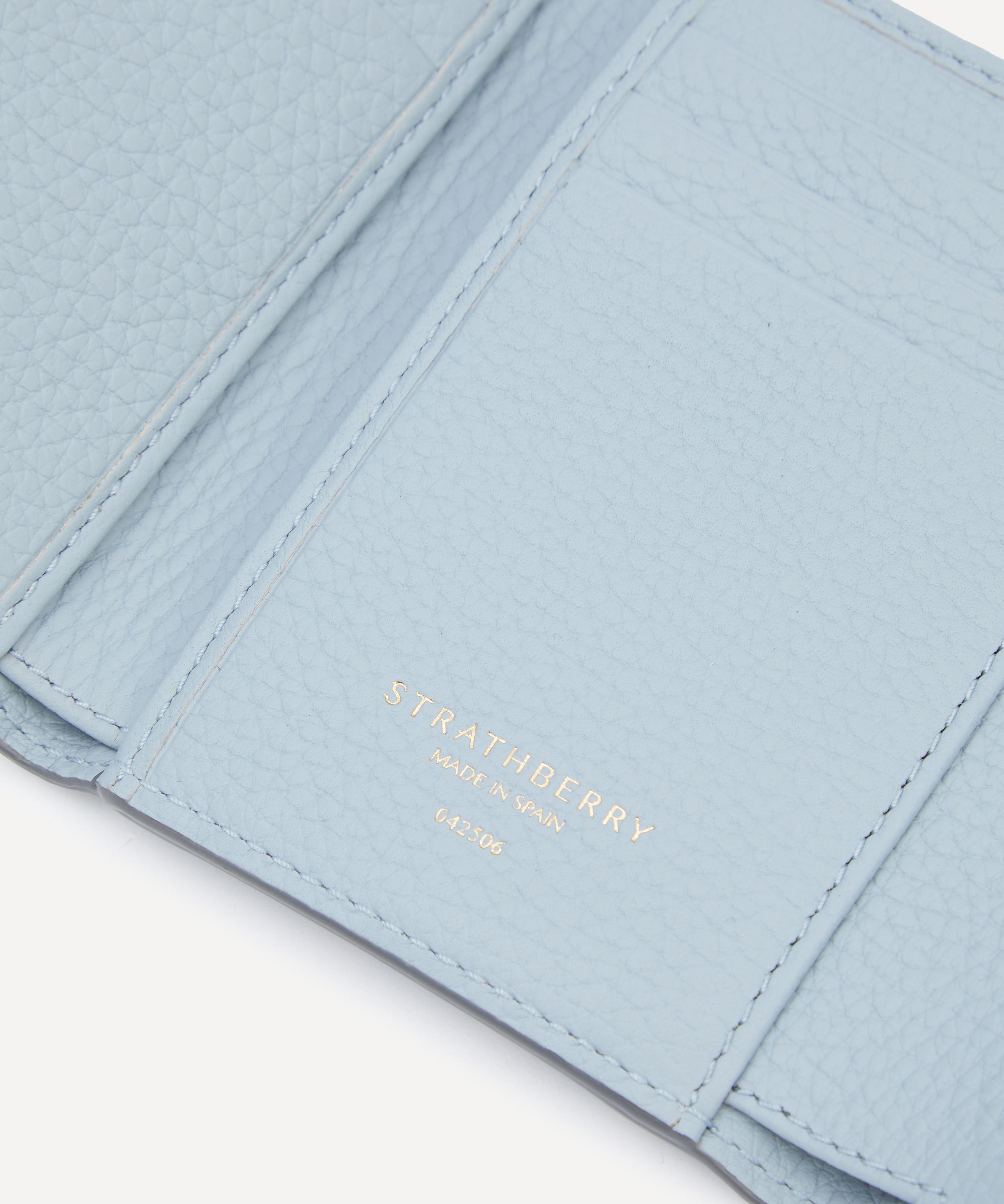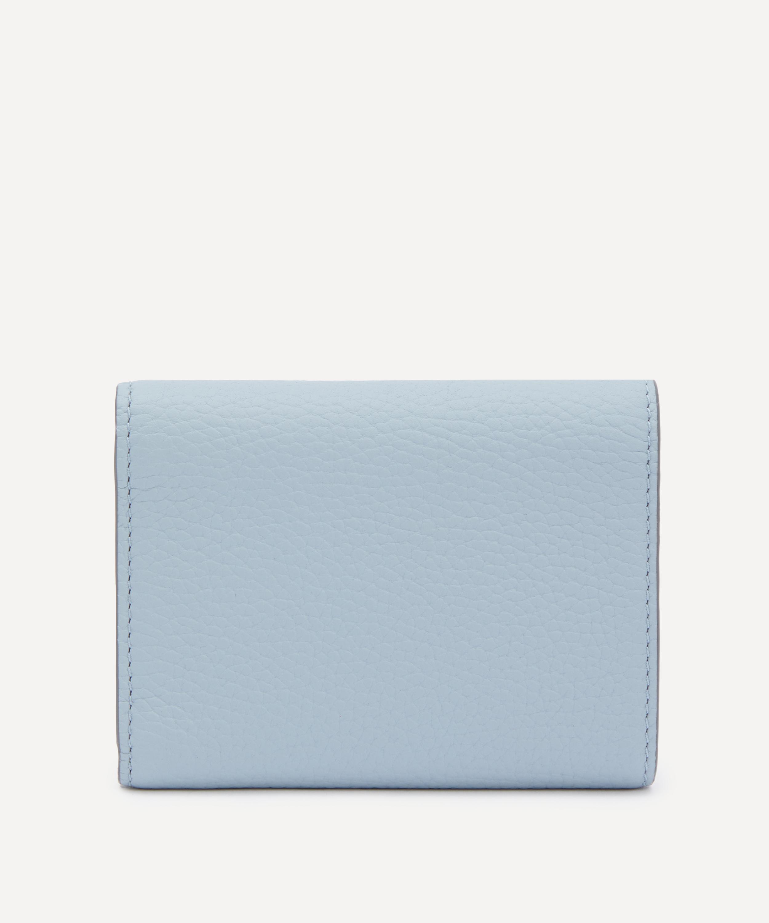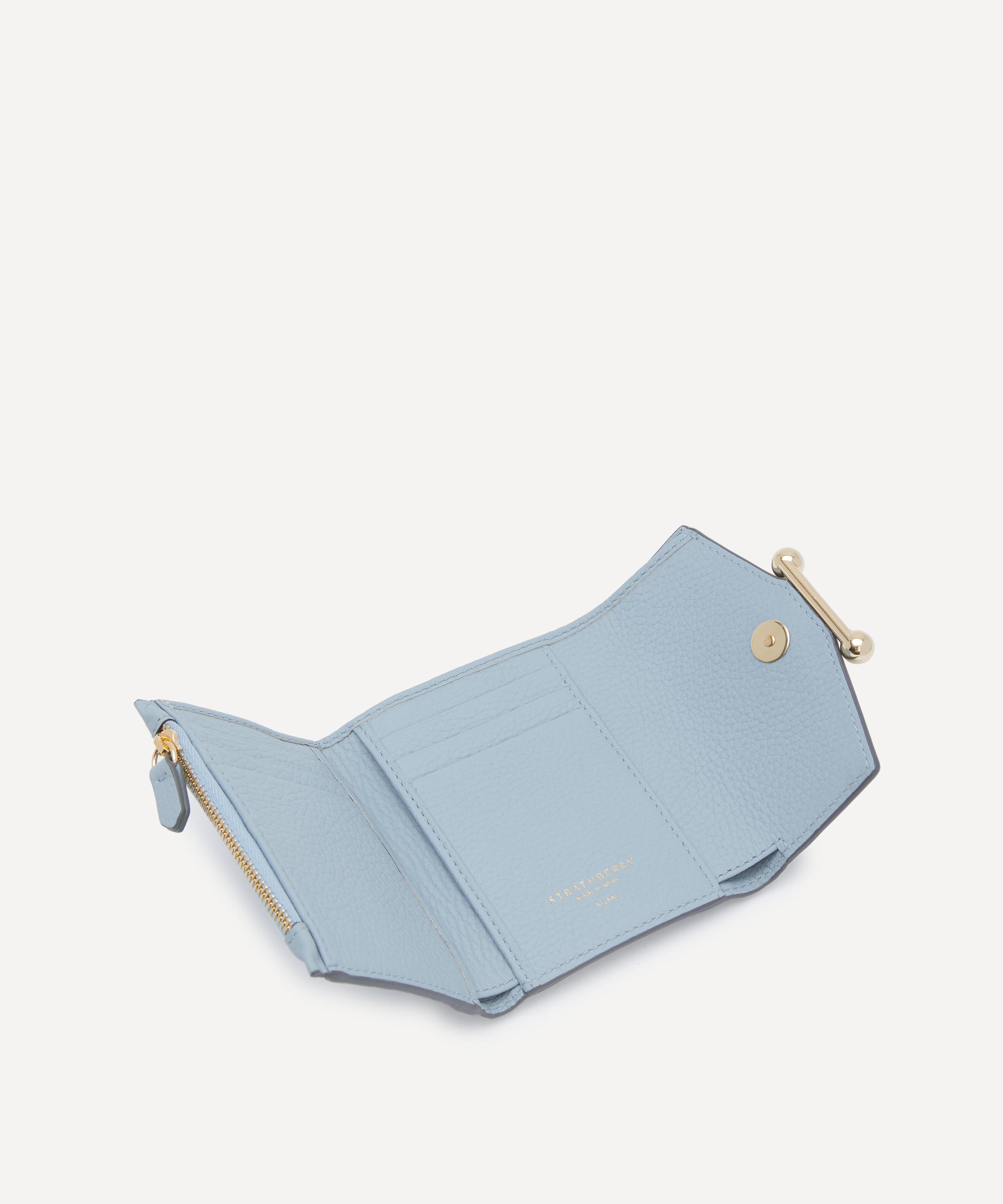 Handcrafted from soft grain calf leather in a delicate dusky blue, this sophisticated wallet features a trifold design that opens up to reveal a zipped pocket for coins, a slip compartment for notes, and six card slots – secured by a stud closure, it is a luxurious take on an everyday essential.