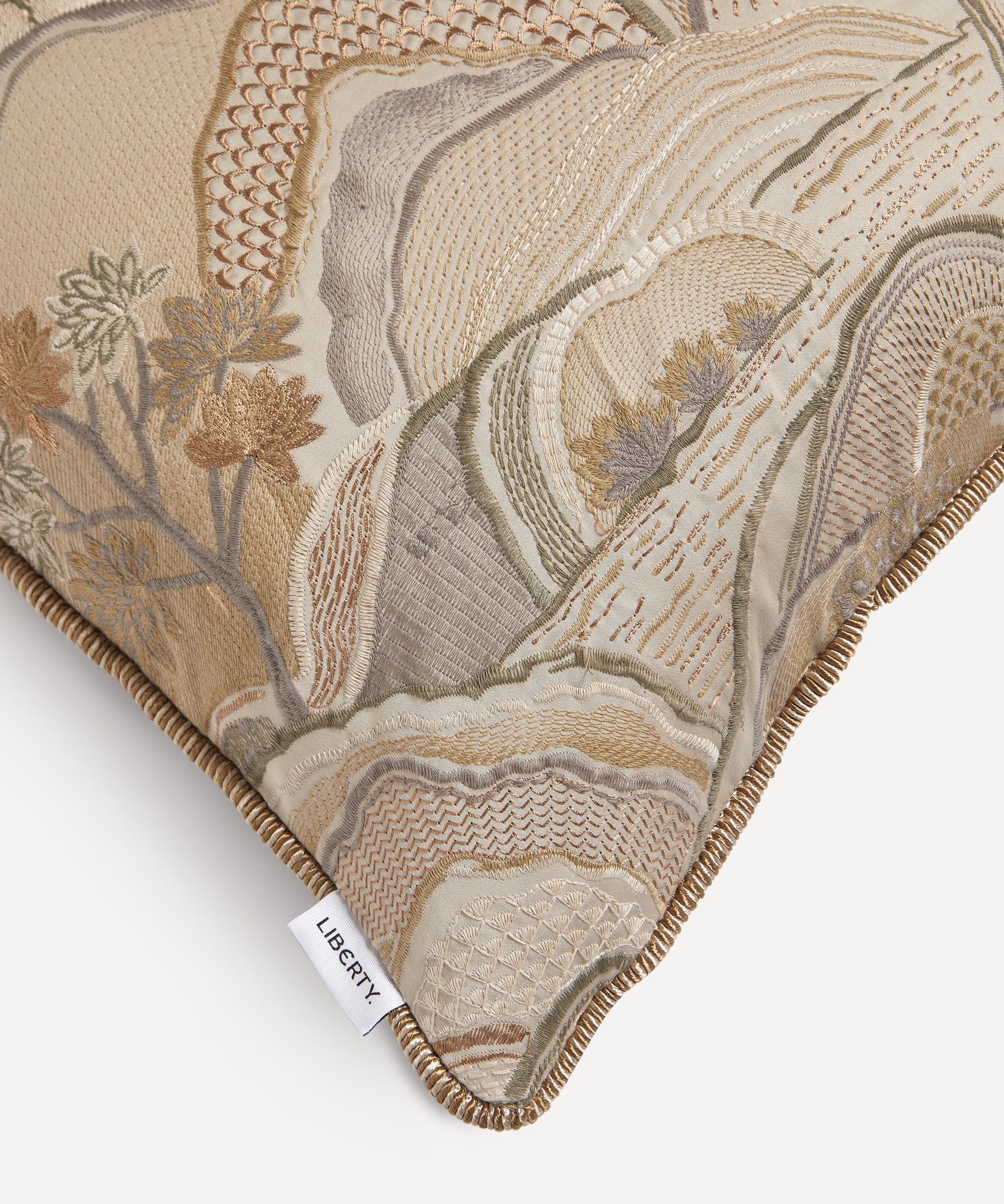 Liberty’s Mount Edo square cushion is meticulously crafted in an array of harmonious tonal hues with a plump duck feather filling.